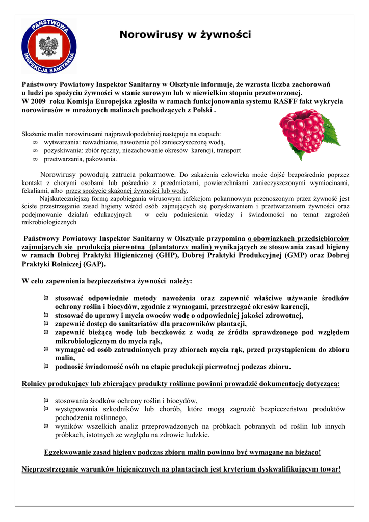 Norowirusy w żywności Państwowy Powiatowy Inspektor Sanitarny w Olsztynie informuje, że wzrasta liczba zachorowań u ludzi po spożyciu żywności w stanie surowym lub w niewielkim stopniu przetworzonej. W 2009 roku Komisja Europejska zgłosiła w ramach funkcjonowania systemu RASFF fakt wykrycia norowirusów w mrożonych malinach pochodzących z Polski . Skażenie malin norowirusami najprawdopodobniej następuje na etapach: • wytwarzania: nawadnianie, nawożenie pól zanieczyszczoną wodą, • pozyskiwania: zbiór ręczny, niezachowanie okresów karencji, transport • przetwarzania, pakowania. Norowirusy powodują zatrucia pokarmowe. Do zakażenia człowieka może dojść bezpośrednio poprzez kontakt z chorymi osobami lub pośrednio z przedmiotami, powierzchniami zanieczyszczonymi wymiocinami, fekaliami, albo przez spożycie skażonej żywności lub wody. Najskuteczniejszą formą zapobiegania wirusowym infekcjom pokarmowym przenoszonym przez żywność jest ścisłe przestrzeganie zasad higieny wśród osób zajmujących się pozyskiwaniem i przetwarzaniem żywności oraz podejmowanie działań edukacyjnych w celu podniesienia wiedzy i świadomości na temat zagrożeń mikrobiologicznych Państwowy Powiatowy Inspektor Sanitarny w Olsztynie przypomina o obowiązkach przedsiębiorców zajmujących się produkcją pierwotną (plantatorzy malin) wynikających ze stosowania zasad higieny w ramach Dobrej Praktyki Higienicznej (GHP), Dobrej Praktyki Produkcyjnej (GMP) oraz Dobrej Praktyki Rolniczej (GAP). W celu zapewnienia bezpieczeństwa żywności należy: stosować odpowiednie metody nawożenia oraz zapewnić właściwe używanie środków ochrony roślin i biocydów, zgodnie z wymogami, przestrzegać okresów karencji, stosować do uprawy i mycia owoców wodę o odpowiedniej jakości zdrowotnej, zapewnić dostęp do sanitariatów dla pracowników plantacji, zapewnić bieżącą wodę lub beczkowóz z wodą ze źródła sprawdzonego pod względem mikrobiologicznym do mycia rąk, wymagać od osób zatrudnionych przy zbiorach mycia rąk, przed przystąpieniem do zbioru malin, podnosić świadomość osób na etapie produkcji pierwotnej podczas zbioru. Rolnicy produkujący lub zbierający produkty roślinne powinni prowadzić dokumentację dotyczącą: stosowania środków ochrony roślin i biocydów, występowania szkodników lub chorób, które mogą zagrozić bezpieczeństwu produktów pochodzenia roślinnego, wyników wszelkich analiz przeprowadzonych na próbkach pobranych od roślin lub innych próbkach, istotnych ze względu na zdrowie ludzkie. Egzekwowanie zasad higieny podczas zbioru malin powinno być wymagane na bieżąco! Nieprzestrzeganie warunków higienicznych na plantacjach jest kryterium dyskwalifikującym towar!
