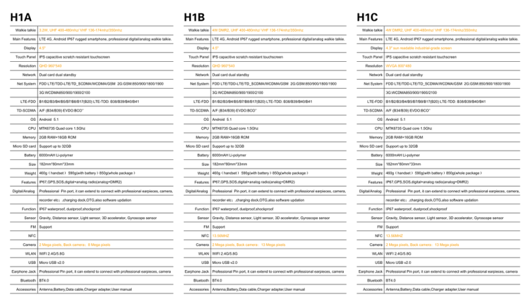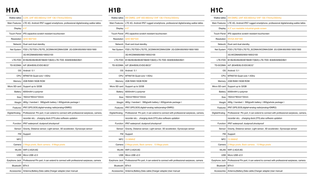 H1A H1B Walkie talkie 3.2W, UHF 400-480mhz/ VHF 136-174mhz/350mhz Main Features LTE 4G, Android IP67 rugged smartphone, professional digital/analog walkie talkie. Display 4.5" Touch Panel IPS capacitive scratch resistant touchscreen Resolution QHD 960*540 Network Dual card dual standby Net System FDD LTE/TDD-LTE/TD_SCDMA/WCDMA/GSM 2G:GSM:850/900/1800/1900 Walkie talkie 4W DMR2, UHF 400-480mhz/ VHF 136-174mhz/350mhz Main Features LTE 4G, Android IP67 rugged smartphone, professional digital/analog walkie talkie. Display 4.5" Touch Panel IPS capacitive scratch resistant touchscreen Resolution QHD 960*540 Network Dual card dual standby Net System FDD LTE/TDD-LTE/TD_SCDMA/WCDMA/GSM 2G:GSM:850/900/1800/1900 3G:WCDMA850/900/1900/2100 LTE-FDD B1/B2/B3/B4/B5/B7/B8/B17(B20) LTE-TDD: B38/B39/B40/B41 TD-SCDMA A/F (B34/B39) EVDO:BCO’’ OS Android 5.1 CPU MTK6735 Quad core 1.5Ghz Memory 2GB RAM+16GB ROM Micro SD card Support up to 32GB H1C Walkie talkie 4W DMR2, UHF 400-480mhz/ VHF 136-174mhz/350mhz Main Features LTE 4G, Android IP67 rugged smartphone, professional digital/analog walkie talkie. Display 4.3" sun readable industrial-grade screen Touch Panel IPS capacitive scratch resistant touchscreen Resolution WVGA 800*480 Network Dual card dual standby Net System FDD LTE/TDD-LTE/TD_SCDMA/WCDMA/GSM 2G:GSM:850/900/1800/1900 3G:WCDMA850/900/1900/2100 LTE-FDD B1/B2/B3/B4/B5/B7/B8/B17(B20) LTE-TDD: B38/B39/B40/B41 TD-SCDMA A/F (B34/B39) EVDO:BCO’’ OS Android 5.1 CPU MTK6735 Quad core 1.5Ghz Memory 2GB RAM+16GB ROM Micro SD card Support up to 32GB 3G:WCDMA850/900/1900/2100 LTE-FDD B1/B2/B3/B4/B5/B7/B8/B17(B20) LTE-TDD: B38/B39/B40/B41 TD-SCDMA A/F (B34/B39) EVDO:BCO’’ OS Android 5.1 CPU MTK6735 Quad core 1.5Ghz Memory 2GB RAM+16GB ROM Micro SD card Support up to 32GB Battery 6000mAH Li-polymer Battery 6000mAH Li-polymer Battery 6000mAH Li-polymer Size 182mm*80mm*33mm Size 182mm*80mm*33mm Size 182mm*80mm*33mm Weight 460g(handset) 590g(with battery)850g(whole package) Features IP67,GPS,SOS,digital+analog radio(analog+DMR2) Digital/Analog Professional Pin port, it can extend to connect with professional earpieces, camera, recorder etc;,charging dock,OTG,also software updation Function IP67 waterproof, dustproof,shockproof Sensor Gravity, Distance sensor, Light sensor, 3D accelerator, Gyroscope sensor FM Support NFC Camera 2 Mega pixels, Back camera:8 Mega pixels Weight 460g(handset) 590g(with battery)850g(whole package) Features IP67,GPS,SOS,digital+analog radio(analog+DMR2) Digital/Analog Professional Pin port, it can extend to connect with professional earpieces, camera, recorder etc;,charging dock,OTG,also software updation Function IP67 waterproof, dustproof,shockproof Sensor Gravity, Distance sensor, Light sensor, 3D accelerator, Gyroscope sensor Weight 460g(handset) 590g(with battery)850g(whole package) Features IP67,GPS,SOS,digital+analog radio(analog+DMR2) Digital/Analog Professional Pin port, it can extend to connect with professional earpieces, camera, recorder etc;,charging dock,OTG,also software updation Function IP67 waterproof, dustproof,shockproof Sensor Gravity, Distance sensor, Light sensor, 3D accelerator, Gyroscope sensor FM Support FM Support NFC 13.56MHZ NFC 13.56MHZ Camera 2 Mega pixels, Back camera:13 Mega pixels Camera 2 Mega pixels, Back camera:13 Mega pixels WLAN WIFI 2.4G/5.8G WLAN WIFI 2.4G/5.8G WLAN WIFI 2.4G/5.8G USB Micro USB v2.0 USB Micro USB v2.0 USB Micro USB v2.0 Earphone Jack Professional Pin port, it can extend to connect with professional earpieces, camera Bluetooth BT4.0 Accessories Antenna,Battery,Data cable,Charger adapter,User manual Earphone Jack Professional Pin port, it can extend to connect with professional earpieces, camera Bluetooth BT4.0 Accessories Antenna,Battery,Data cable,Charger adapter,User manual Earphone Jack Professional Pin port, it can extend to connect with professional earpieces, camera Bluetooth BT4.0 Accessories Antenna,Battery,Data cable,Charger adapter,User manual