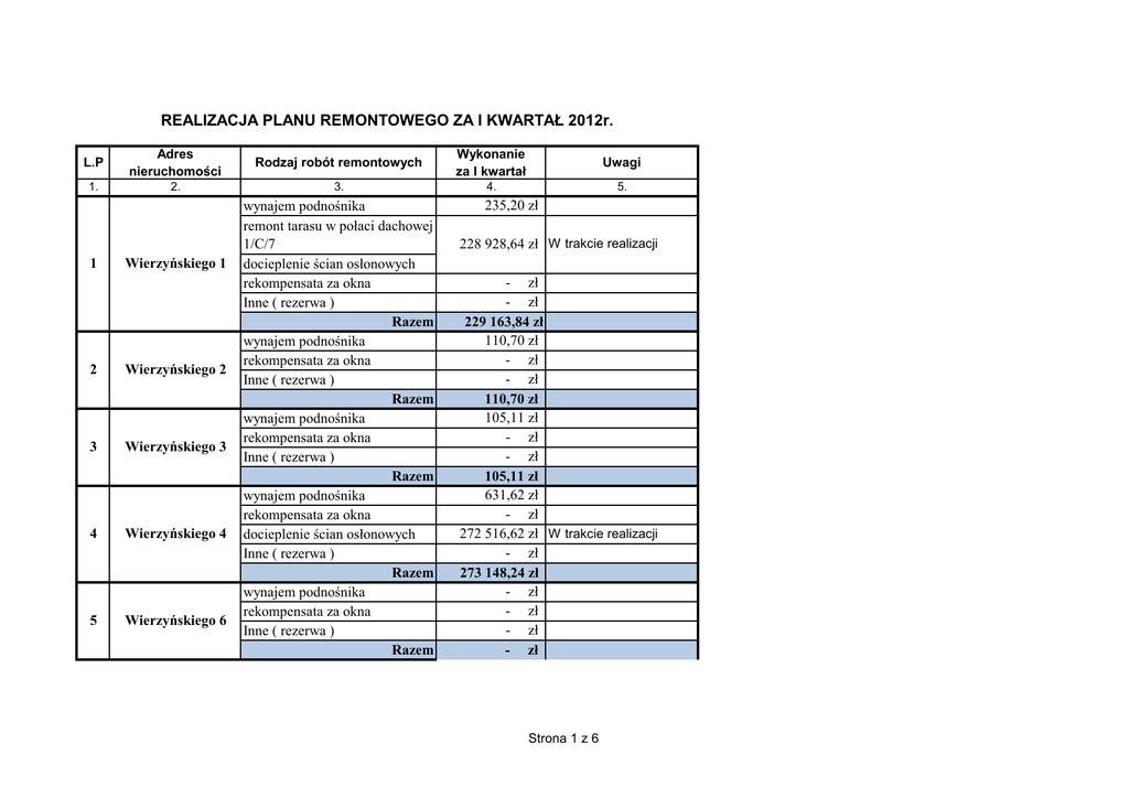 REALIZACJA PLANU REMONTOWEGO ZA I KWARTAŁ 2012r. L.P Adres nieruchomości Rodzaj robót remontowych Wykonanie za I kwartał Uwagi 1. 2. 3. 4. 5. 1 Wierzyńskiego 1 2 Wierzyńskiego 2 3 Wierzyńskiego 3 4 Wierzyńskiego 4 5 Wierzyńskiego 6 wynajem podnośnika remont tarasu w połaci dachowej 1/C/7 docieplenie ścian osłonowych rekompensata za okna Inne ( rezerwa ) Razem wynajem podnośnika rekompensata za okna Inne ( rezerwa ) Razem wynajem podnośnika rekompensata za okna Inne ( rezerwa ) Razem wynajem podnośnika rekompensata za okna docieplenie ścian osłonowych Inne ( rezerwa ) Razem wynajem podnośnika rekompensata za okna Inne ( rezerwa ) Razem 235,20 zł 228 928,64 zł W trakcie realizacji - zł - zł 229 163,84 zł 110,70 zł - zł - zł 110,70 zł 105,11 zł - zł - zł 105,11 zł 631,62 zł - zł 272 516,62 zł W trakcie realizacji - zł 273 148,24 zł - zł - zł - zł - zł Strona 1 z 6 REALIZACJA PLANU REMONTOWEGO ZA I KWARTAŁ 2012r. L.P Adres nieruchomości Rodzaj robót remontowych Wykonanie za I kwartał Uwagi 1. 2. 3. 4. 5. 6 7 8 9 wynajem podnośnika remont tarasu w połaci dachowej Kruczkowskiego 2 a/10 Razem wynajem podnośnika zadaszenia balkonów na ostatniej kondygnacji Lechonia 1 rekompensata za okna Inne ( rezerwa ) Razem wynajem podnośnika remont balkonów klatka A zadaszenia balkonów na ostatniej kondygnacji Lechonia 2 rekompensata za okna Inne ( rezerwa ) Razem wynajem podnośnika rekompensata za okna Lechonia 3 Inne ( rezerwa ) Razem - zł 14 663,49 zł W trakcie realizacji 14 663,49 zł 110,70 zł 47 631,05 zł W trakcie realizacji - zł - zł 47 741,75 zł - zł 35 596,88 zł W trakcie realizacji 31 754,03 zł W trakcie realizacji - zł - zł 67 350,91 zł 68,94 zł głowice termostatyczne 68,94 zł Strona 2 z 6 REALIZACJA PLANU REMONTOWEGO ZA I KWARTAŁ 2012r. L.P Adres nieruchomości Rodzaj robót remontowych Wykonanie za I kwartał Uwagi 1. 2. 3. 4. 5. 10 Lechonia 4 11 Lechonia 5 12 Lechonia 7 13 Lechonia 9 wynajem podnośnika remont tarasu w połaci dachowej 4 B/9 rekompensata za okna Inne ( rezerwa ) Razem wynajem podnośnika rekompensata za okna Inne ( rezerwa ) Razem wynajem podnośnika remont balkonów klatka A remont balkonów z zadaszeniem balkonów na ostatniej kondygnacji rekompensata za okna Inne ( rezerwa ) Razem wynajem podnośnika rekompensata za okna Inne ( rezerwa ) Razem - zł 14 663,49 zł W trakcie realizacji - zł - zł 14 663,49 zł - zł - zł - zł - zł - zł 35 596,88 zł W trakcie realizacji 43 687,08 zł W trakcie realizacji - zł - zł 79 283,96 zł 221,40 zł - zł - zł 221,40 zł Strona 3 z 6 REALIZACJA PLANU REMONTOWEGO ZA I KWARTAŁ 2012r. L.P Adres nieruchomości Rodzaj robót remontowych Wykonanie za I kwartał Uwagi 1. 2. 3. 4. 5. 14 wynajem podnośnika remont loggii klatka C Armii Krajowej 3 rekompensata za okna Inne ( rezerwa ) Razem 15 wynajem podnośnika rekompensata za okna Armii Krajowej 5 Inne ( rezerwa ) Razem 16 wynajem podnośnika rekompensata za okna Armii Krajowej 7 Inne ( rezerwa ) Razem 17 wynajem podnośnika remont loggii klatka C Armii Krajowej 9 rekompensata za okna Inne ( rezerwa ) Razem 18 wynajem podnośnika rekompensata za okna Armii Krajowej 11 Inne ( rezerwa ) Razem - zł 40 046,49 zł W trakcie realizacji - zł 63,35 zł głowice termostatyczne 40 109,84 zł 363,47 zł - zł - zł 363,47 zł - zł - zł - zł - zł 221,40 zł 35 596,88 zł W trakcie realizacji - zł - zł 35 818,28 zł 110,70 zł - zł - zł 110,70 zł Strona 4 z 6 REALIZACJA PLANU REMONTOWEGO ZA I KWARTAŁ 2012r. L.P Adres nieruchomości Rodzaj robót remontowych Wykonanie za I kwartał Uwagi 1. 2. 3. 4. 5. 19 Kleeberga 2 20 5- go Marca 1 21 Pileckiego 1 22 Pileckiego 3 wynajem podnośnika remont balkonów i wykonanie zadaszeń na ostatniej kondygnacji rekompensata za okna Inne ( rezerwa ) Razem wynajem podnośnika remont balkonów kl B rekompensata za okna Inne ( rezerwa ) Razem wynajem podnośnika remont balkonów klatka A B zadaszenia balkonów na ostatniej kondygnacji rekompensata za okna Inne ( rezerwa ) Razem wynajem podnośnika remont ( 5 ) balkonów oraz zadaszenia 6 balkonów na ostatniej kondygnacji rekompensata za okna Inne ( rezerwa ) Razem - zł 21 843,54 zł W trakcie realizacji - zł - zł 21 843,54 zł 276,75 zł 35 596,88 zł W trakcie realizacji - zł - zł 35 873,63 zł - zł 71 193,76 zł W trakcie realizacji 39 439,73 zł W trakcie realizacji - zł - zł 110 633,49 zł 442,80 zł 65 530,62 zł W trakcie realizacji - zł 63,35 zł głowice termostatyczne 66 036,77 zł Strona 5 z 6 REALIZACJA PLANU REMONTOWEGO ZA I KWARTAŁ 2012r. L.P Adres nieruchomości Rodzaj robót remontowych Wykonanie za I kwartał Uwagi 1. 2. 3. 4. 5. 23 Powstańców Warszawy 3 wynajem podnośnika remont loggii rekompensata za okna Inne ( rezerwa ) Razem 24 25 Powstańców Warszawy 4 Powstańców Warszawy 6 26 Hubala 2 27 Garaże Wierzyńskiego wynajem podnośnika rekompensata za okna Inne ( rezerwa ) Razem wynajem podnośnika wzmocnienie połaci dachowej rekompensata za okna Inne ( rezerwa ) Razem wynajem podnośnika rekompensata za okna Inne ( rezerwa ) Razem Nie zaplanowano robót RAZEM OSIEDLE PYRZYCKIE - zł 44 496,10 zł - zł 63,35 zł 44 559,45 zł 110,70 zł - zł 68,94 zł 179,64 zł 110,70 zł - zł - zł 63,36 zł 174,06 zł - zł - zł 67,60 zł 67,60 zł - W trakcie realizacji głowice termostatyczne głowice termostatyczne głowice termostatyczne głowice termostatyczne zł 1 082 292,30 zł Sporządził: Michał Sałapata 10.05.2012r. Strona 6 z 6