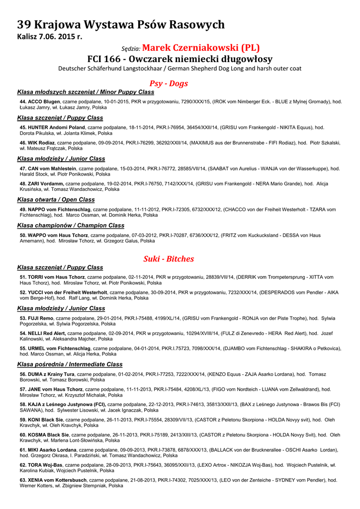 39 Krajowa Wystawa Psów Rasowych Kalisz 7.06. 2015 r. Sędzia: Marek Czerniakowski (PL) FCI 166 - Owczarek niemiecki długowłosy Deutscher Schäferhund Langstockhaar / German Shepherd Dog Long and harsh outer coat Psy - Dogs Klasa młodszych szczeniąt / Minor Puppy Class 44. ACCO Blugen, czarne podpalane, 10-01-2015, PKR w przygotowaniu, 7290/XXX/15, (IROK vom Nimberger Eck. - BLUE z Mylnej Gromady), hod. Łukasz Jamry, wł. Łukasz Jamry, Polska Klasa szczeniąt / Puppy Class 45. HUNTER Andomi Poland, czarne podpalane, 18-11-2014, PKR.I-76954, 36454/XXII/14, (GRISU vom Frankengold - NIKITA Equus), hod. Dorota Pikulska, wł. Jolanta Klimek, Polska 46. WIK Rodiaz, czarne podpalane, 09-09-2014, PKR.I-76299, 36292/XXII/14, (MAXIMUS aus der Brunnenstrabe - FIFI Rodiaz), hod. Piotr Szkalski, wł. Mateusz Frątczak, Polska Klasa młodzieży / Junior Class 47. CAN vom Mahlestein, czarne podpalane, 15-03-2014, PKR.I-76772, 28585/VII/14, (SAABAT von Aurelius - WANJA von der Wasserkuppe), hod. Harald Stock, wł. Piotr Ponikowski, Polska 48. ZARI Vordamm, czarne podpalane, 19-02-2014, PKR.I-76750, 7142/XXX/14, (GRISU vom Frankengold - NERA Mario Grande), hod. Alicja Krusińska, wł. Tomasz Wandachowicz, Polska Klasa otwarta / Open Class 49. NAPPO vom Fichtenschlag, czarne podpalane, 11-11-2012, PKR.I-72305, 6732/XXX/12, (CHACCO von der Freiheit Westerholt - TZARA vom Fichtenschlag), hod. Marco Ossman, wł. Dominik Herka, Polska Klasa championów / Champion Class 50. WAPPO vom Haus Tchorz, czarne podpalane, 07-03-2012, PKR.I-70287, 6736/XXX/12, (FRITZ vom Kuckucksland - DESSA von Haus Arnemann), hod. Mirosław Tchorz, wł. Grzegorz Galus, Polska Suki - Bitches Klasa szczeniąt / Puppy Class 51. TORRI vom Haus Tchorz, czarne podpalane, 02-11-2014, PKR w przygotowaniu, 28839/VII/14, (DERRIK vom Trompetersprung - XITTA vom Haus Tchorz), hod. Miroslaw Tchorz, wł. Piotr Ponikowski, Polska 52. YUCCI von der Freiheit Westerholt, czarne podpalane, 30-09-2014, PKR w przygotowaniu, 7232/XXX/14, (DESPERADOS vom Pendler - AIKA vom Berge-Hof), hod. Ralf Lang, wł. Dominik Herka, Polska Klasa młodzieży / Junior Class 53. FUJI Remo, czarne podpalane, 29-01-2014, PKR.I-75488, 4199/XL/14, (GRISU vom Frankengold - RONJA von der Piste Trophe), hod. Sylwia Pogorzelska, wł. Sylwia Pogorzelska, Polska 54. NELLI Red Alert, czarne podpalane, 02-09-2014, PKR w przygotowaniu, 10294/XVIII/14, (FULZ di Zenevredo - HERA Red Alert), hod. Jozef Kalinowski, wł. Aleksandra Majcher, Polska 55. URMEL vom Fichtenschlag, czarne podpalane, 04-01-2014, PKR.I.75723, 7098/XXX/14, (DJAMBO vom Fichtenschlag - SHAKIRA o Petkovica), hod. Marco Ossman, wł. Alicja Herka, Polska Klasa pośrednia / Intermediate Class 56. DUMA z Krainy Tura, czarne podpalane, 01-02-2014, PKR.I-77253, 7222/XXX/14, (KENZO Equus - ZAJA Asarko Lordana), hod. Tomasz Borowski, wł. Tomasz Borowski, Polska 57. JANE vom Haus Tchorz, czarne podpalane, 11-11-2013, PKR.I-75484, 4208/XL/13, (FIGO vom Nordteich - LUANA vom Zellwaldrand), hod. Mirosław Tchorz, wł. Krzysztof Michalak, Polska 58. KAJA z Leśnego Justynowa (FCI), czarne podpalane, 22-12-2013, PKR.I-74613, 35813/XXII/13, (BAX z Leśnego Justynowa - Brawos Bis (FCI) SAWANA), hod. Sylwester Lisowski, wł. Jacek Ignaczak, Polska 59. KONI Black Sie, czarne podpalane, 26-11-2013, PKR.I-75554, 28309/VII/13, (CASTOR z Peletonu Skorpiona - HOLDA Novyy svit), hod. Oleh Kravchyk, wł. Oleh Kravchyk, Polska 60. KOSMA Black Sie, czarne podpalane, 26-11-2013, PKR.I-75189, 2413/XIII/13, (CASTOR z Peletonu Skorpiona - HOLDA Novyy Svit), hod. Oleh Krawchyk, wł. Marlena Lont-Słowińska, Polska 61. MIKI Asarko Lordana, czarne podpalane, 09-09-2013, PKR.I-73878, 6878/XXX/13, (BALLACK von der Brucknerallee - OSCHI Asarko Lordan), hod. Grzegorz Okrasa, I. Paradziński, wł. Tomasz Wandachowicz, Polska 62. TORA Woj-Bas, czarne podpalane, 28-09-2013, PKR.I-75643, 36095/XXII/13, (LEXO Artrox - NIKOZJA Woj-Bas), hod. Wojciech Pustelnik, wł. Karolina Kubiak, Wojciech Pustelnik, Polska 63. XENIA vom Kottersbusch, czarne podpalane, 21-08-2013, PKR.I-74302, 7025/XXX/13, (LEO von der Zenteiche - SYDNEY vom Pendler), hod. Werner Kotters, wł. Zbigniew Stempniak, Polska Klasa otwarta / Open Class 64. CZACZA Fezo Team, czarne podpalane, 30-11-2013, PKR.I-75802, 7084/XXX/13, (GIO vom Mühlenteich - XINDRA vom Kiebitzmoor), hod. Marcelina Kaftan, wł. Eugeniusz Błażejewski, Polska 65. ELLIS von der tiefen Quelle, czarne, 28-10-2013, PKR.I-74950, 35690/XXII/13, (BUFFALO BILL von Tjärnshaget - ADELE von der tiefen Quelle), hod. Karl Säck, wł. Małgorzata Drozdowska-Cupriak, Polska 66. NEBRASCA Temperhot, czarne podpalane, 27-04-2012, PKR.I-71110, 6594/XXIII/12, (BIG BOSS FOR SAMBATUS Darga Urma - MORTYCJA Śmiłowickie Wilki), hod. Mirela Nowak, wł. Mirela Nowak, Polska 67. SARA z Lepos, czarne podpalane, 09-05-2013, PKR.I-77254, 7196/XXX/13, (BRAVOS Animar - NELA Animar), hod. Beata Wiśniewska, wł. Kamil Urbaniak, Polska 68. ZOGA z Weselskiej Zagrody, czarne podpalane, 02-06-2011, PKR.I-76963, 28653/VII/11, (PAER vom Haseborn - AGA z Weselskiej Zagrody), hod. Weselski Bolesław, wł. Piotr Ponikowski, Polska Sędzia: Marek Czerniakowski (PL) FCI 166 - Owczarek niemiecki krótkowłosy Deutscher Schäferhund Stockhaar / German Shepherd Dog Double coat Psy - Dogs Klasa młodszych szczeniąt / Minor Puppy Class 69. A-GRAND Odolmaro, czarne podpalane, 04-02-2015, PKR w przygotowaniu, 7277/XXX/15, (VEGAS Wolf Jar - USZI z Mylnej Gromady), hod. Robert Mamot, wł. Jarosław Skop, Polska 70. AKEY Valdi Marr, czarne podpalane, 29-01-2015, PKR w przygotowaniu, 7287/XXX/15, (VASKO vom Thalberger land - ALI z Ostrowskiej Sfory), hod. Waldemar Kosiński, wł. Waldemar Kosiński, Polska Klasa szczeniąt / Puppy Class 71. LABO Wolf Jar, czarne podpalane, 11-11-2014, PKR w przygotowaniu, 49635/VIII/14, (LABO vom Schollweiher - TIGRA Wolf Jar), hod. Marek Zgorzelski, wł. Marek Zgorzelski, Polska Klasa młodzieży / Junior Class 72. HARY z Hodowli