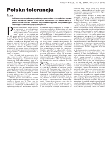 NIGDY WIĘCEJ nr 18, ZIMA-WIOSNA 2010 Polska tolerancja BIAŁY Jeśli spytasz przypadkowego polskiego przechodnia o to, czy Polacy są rasistami, możesz być pewien, że odpowiedź będzie przecząca. Powiem więcej, przechodzień ów uzna zapewne, że postawione pytanie jest prowokujące i szkalujące dobre imię jego pobratymców. P rzecież sama historia narodu polskiego przemawia za tym, aby postawić wszystkim Polakom pomnik „szlachetnych bojowników o równość rasową”. Jednak czy rzeczywiście jest tak, jak uważa większość mieszkańców kraju znad Wisły? Czy nie jest tak, iż większość z nich nie miała nawet przelotnego kontaktu z osobą o innym kolorze skóry i nie zdają sobie sprawy z własnych utajonych stereotypowych myśli? Czy nie jest tak, że głęboko wierzący w naukę Jana Pawła II chcą wierzyć w swoją szlachetność tak mocno, iż się z nią utożsamiają, bez uprzedniego sprawdzenia swoich prawdziwych postaw? Z żalem muszę stwierdzić, że Polacy są rasistami. Przez całe moje życie uczono mnie, iż ferując wyroki nie wolno uogólniać, więc tym razem nie zrobię tego i już się poprawiam. Część Polaków nie zdaje sobie sprawy z tego, że są rasistami. Zastanawiasz się pewnie, jakim prawem pozwalam sobie na rzucanie takich oskarżeń. Muszę cię uświadomić, że też jestem Polakiem, a mimo to czuję, że mam moralne prawo i obowiązek przedstawić inną twarz moich rodaków. Obiecuję, że postaram się być w miarę obiektywny, choć muszę przyznać, że będzie to trudne, ponieważ przez całe życie stałem po drugiej stronie aktów rasistowskich. Właśnie życiowe doświadczenie ciemnoskórego chłopaka mieszkającego w Polsce pozwoliło mi wysnuć tezę, iż Polacy chcą być uważani za tolerancyjnych, lecz w sytuacji zetknięcia się z nieznanym niejednokrotnie o tym zapominają i włączają stereotypowe myślenie. Ponadto nie można zapomnieć o istnieniu cichego przyzwolenia na działanie skrajnych grup neofaszystowskich, które to w demokratycznym kraju mają prawo do manifestacji i głoszenia swoich poglądów. O skrajnym rasizmie porozmawiamy później, teraz wrócimy do początków moich obserwacji. Urodziłem się w Polsce 32 lata temu, więc jak się domyślasz niewielu ciemnoskórych ludzi spotykało się w tamtych czasach na ulicach Polski komunistycznej. Po upadku komunizmu jeszcze wiele lat musiało minąć, zanim człowiek o innej karnacji przestał być zjawiskiem. Właśnie „zjawisko” to odpowiednie określenie dla małego Mulatka biegającego po ulicach polskich miejscowości. Słyszę, jak się buntujesz, znajdujesz argument, iż zamknięte granice doprowadziły do względnego zacofania polskiego społeczeństwa. Tylko czy brak przepływu różnych kultur pozwala traktować inne rasy jako gorsze? zy podobał Ci się wierszyk Murzynek Bambo, którego zapewne uczyłeś się na pamięć w przedszkolu? Mogłoby się wydawać, że jest niewinny jak Tańcowała igła z nitką, tylko że ja byłem jego przedmiotem. Moje imię brzmiało Bambo, a nie przypominam sobie, abym się na to godził. Dziwne uczucie, lubić mleko i słuchać o tym, że się przed nim ucieka. Co ja piszę, słuchać? Musiałem się nauczyć wierszyka na pamięć – nawet sześciolatka może to dotknąć. Powiesz, że to były stare czasy, nikt nie rozumiał konotacji, a Tuwim po prostu zaprzyjaźniał maluchy z innymi rasami. Trudno się z tym nie zgodzić, tylko jak wytłumaczysz za- C chowanie ludzi, którzy nawet teraz potrafią korzystać z takiego określenia? Według mnie, wiersz został wykorzystany na potrzeby deprecjonowania ciemnoskórych. Byłem jedynym Mulatem w mojej miejscowości i pewnie w całym województwie, bo gdzie nie pojechałem chciano sobie robić ze mną zdjęcia. Nawet objazdowa małpka na smyczy przegrywała z moim urokiem. Mówi się, że dzieci wynoszą wychowanie z domu, skoro tak, to większość tych, które spotkałem w swoim dzieciństwie, miała wychowanie czysto rasistowskie. Kłóciłeś się jako dziecko, to pewnie wykorzystywałeś w ramach argumentu inwektywy. Nie widzisz w tym nic zdrożnego i ja tym razem się z tobą zgodzę. Jednak, mówiąc potocznie, wyzwiska dzieci dotyczą najczęściej sfery ich inteligencji i są nieadekwatne do rzeczywistości. Jednak gdy przyjrzy się konfrontacji maluchów o odmiennych kolorach skóry, okazuje się, że inwektywy rzucane przez białe dzieci, w tym przypadku polskie, mają podtekst rasistowski. Nasuwa się pytanie: Skąd one to wyniosły? o dobrze, zostawmy niewinne dzieci i przenieśmy się do szkoły, gdzie tolerancja powinna iść w parze z wychowaniem i nauczaniem. Miałem przyjemność poznać trzy podstawówki i muszę przyznać, że w żadnej z nich kadra pedagogiczna się nie sprawdziła. Powiem więcej, nauczyciele byli nieprzygotowani na krzewienie tolerancji, choć dawałem im na to szansę swoją osobą. Nie będę ich oskarżał o rasizm, lecz o brak reagowania na rasistowskie zachowania. Zamiast ostro reagować, pomniejszali skalę takich zachowań, a co gorsza, przyzwalali na nie udając, że ich nie dostrzegają. Stworzono mi idealne warunki do nauki samodzielności bez jakiegokolwiek parasola ochronnego. Wspomnę tylko, że znaleźli się również tacy pedagodzy, dla których użycie wyzwisk rasistowskich nie stanowiło problemu. Nie muszę wspominać, że brak ich reakcji wyzwalał wśród moich rówieśników niebywałą zuchwałość. Nie zliczę bójek, które stawały się naturalną częścią mojej szkolnej egzystencji. Przytaczasz kontrar- N NIGDY WIĘCEJ nr 18, ZIMA-WIOSNA 2010 Rys. Witold Popiel gument, że to zamierzchłe czasy i teraz jest inaczej. Trudno się z Tobą, drogi adwersarzu, nie zgodzić. Tylko czy to usprawiedliwia działania wszystkich tych, którzy powinni być dla mnie wsparciem, a ostatecznie swoim brakiem reakcji stanęli po stronie piewców rasizmu? Jednak podstawówka okazała się niczym w porównani