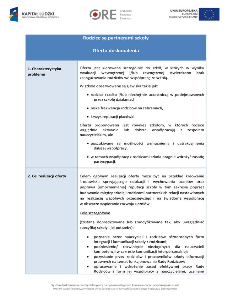 Rodzice są partnerami szkoły Oferta doskonalenia 1. Charakterystyka problemu Oferta jest kierowana szczególnie do szkół, w których w wyniku ewaluacji wewnętrznej i/lub zewnętrznej stwierdzono brak zaangażowania rodziców we współpracę ze szkołą. W szkole obserwowane są zjawiska takie jak: rodzice rzadko i/lub niechętnie uczestniczą w podejmowanych przez szkołę działaniach, niska frekwencja rodziców na zebraniach, kryzys reputacji placówki. Oferta proponowana jest również szkołom, w których rodzice względnie aktywnie lub dobrze współpracują z zespołem nauczycielskim, ale poszukiwane są możliwości wzmocnienia i uatrakcyjnienia dalszej współpracy, w ramach współpracy z rodzicami szkoła pragnie wdrożyd zasadę partycypacji. 2. Cel realizacji oferty Celem ogólnym realizacji oferty może byd na przykład kreowanie środowiska sprzyjającego edukacji i wychowaniu uczniów oraz poprawa (umocnienienie) reputacji szkoły w tym zakresie poprzez budowanie między szkołą i rodzicami partnerskich relacji nastawionych na realizację wspólnych przedsięwzięd i na świadomą współpracę w obszarze wspieranie rozwoju uczniów. Cele szczegółowe (zostaną doprecyzowane lub zmodyfikowane tak, aby uwzględniad specyfikę szkoły i jej potrzeby): poznanie przez nauczycieli i rodziców różnorodnych form integracji i komunikacji szkoły z rodzicami; podniesienie/ rozwinięcie niezbędnych dla nauczycieli kompetencji w zakresie komunikacji interpersonalnej; pozyskanie przez rodziców i pracowników szkoły informacji prawnych na temat funkcjonowania Rady Rodziców; opracowanie i wdrożenie zasad efektywnej pracy Rady Rodziców i form jej współpracy z nauczycielami, uczniami System doskonalenia nauczycieli oparty na ogólnodostępnym kompleksowym wspomaganiu szkół Projekt współfinansowany przez Unię Europejską w ramach Europejskiego Funduszu Społecznego i dyrekcją szkoły; opracowanie narzędzi do ewaluacji współpracy szkoły z rodzicami. 3. Grupy docelowe Wszyscy nauczyciele (szczególnie wychowawcy), rodzice, kadra kierownicza szkoły. 4. Efekty realizacji oferty Przykładowe efekty realizacji oferty: 1. Rodzice chętniej uczestniczą w życiu szkoły, wzrasta frekwencja na spotkaniach (m.in. dzięki poprawie jakości komunikacji oraz współpracy nauczycieli i rodziców). 2. Zwiększa się różnorodnośd form kontaktów szkoły z rodzicami; sporządzona lista form działao integracyjnych i pretekstów wizyt rodziców w szkole jest wykorzystywana w planowaniu i realizowaniu działao edukacyjnych i wychowawczych. 3. Wspólnie wypracowane zostają prawa i zobowiązania rodziców oraz zasady przepływu informacji między poszczególnymi organami szkoły i społecznością szkolną. 4. Rada Rodziców funkcjonuje efektywnie i realnie współpracuje z pozostałymi organami szkoły. 5. Sposób realizacji oferty Realizacja oferty rozpoczyna się od diagnozy potrzeb angażującej wszystkich członków rady pedagogicznej i prowadzącej do sformułowania szczegółowego zakresu działao, wskazania osób odpowiedzialnych za ich wykonanie oraz opracowania rocznego planu wspomagania szkoły (RPW), którego minimalny zakres stanowi załącznik do każdej z ofert. Dopasowane do indywidualnych potrzeb szkoły działania mogą obejmowad w szczególności: 1. Przygotowanie diagnozy, a następnie zdiagnozowanie potrzeb rodziców. 2. Warsztaty tematyczne dla nauczycieli w zakresie komunikacji interpersonalnej, prowadzenia spotkao z rodzicami, radzenia sobie w sytuacjach stresowych, asertywności. 3. Wspólne opracowanie listy form działao integracyjnych i pretekstów wizyt rodziców w szkole, zaplanowanie i realizacja niektórych wybranych form. 4. Szkolenie i warsztaty tematyczne dla rodziców w zakresie System doskonalenia nauczycieli oparty na ogólnodostępnym kompleksowym wspomaganiu szkół Projekt współfinansowany przez Unię Europejską w ramach Europejskiego Funduszu Społecznego współpracy z nauczycielami oraz ze szkołą jako instytucją. 5. Spotkania grup wsparcia dla rodziców o zidentyfikowanych potrzebach. 6. Konsultacje indywidualne i grupowe dla nauczycieli. 7. Sporządzenie i udostępnienie zainteresowanym edukacyjnych i bibliografii tematycznej. materiałów Dyrektor: 6. Zasady korzystania z oferty Nadzoruje wszystkie działania. Udostępnia pomieszczenia i sprzęt do realizacji szkoleo, kursów, warsztatów, konsultacji oraz imprez integracyjnych. Motywuje pracowników i rodziców. Uczestniczy w integracyjnych. szkoleniach, warsztatach oraz imprezach Promuje współpracę i aktywnie w niej uczestniczy. Pracownicy pedagogiczni szkoły, rodzice: 7. Czas i miejsce realizacji oferty Stosują w praktyce nabyte umiejętności. Aktywnie uczestniczą w szkoleniach, warsztatach, kursach i spotkaniach integracyjnych. Czas: w zależności od potrzeb, optymalnie 10 miesięcy. Miejsce realizacji: siedziba szkoły. Oferta będzie realizowana zgodnie z przyjętym harmonogramem. W uzasadnionych poza szkołą (np. integracyjne itp.). przypadkach – miejsca realizacji będą wizyta studyjna, benchmarking, spotkania 8. Osoby realizujące szkolenia / warsztaty Imię, nazwisko, biografia zawodowa (w zależności od działao zaplanowanych w RPW może to byd na przykład specjalista od komunikacji interpersonalnej, budowania relacji szkoły z rodzicami). 9. Osoba udzielająca dalszych informacji Szkolny organizator rozwoju edukacji/animator: ……………………………………………………………………………………………………. Imię, nazwisko, e-mail, numer telefonu. System doskonalenia nauczycieli oparty na ogólnodostępnym kompleksowym wspomaganiu szkół Projekt współfinansowany przez Unię Europejską w ramach Europejskiego Funduszu Społecznego