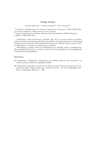 Grupy losowe François Dahmani(1) , Vincent Guirardel(1) , Piotr Przytycki(2) (1) Institut de Mathématiques de Toulouse, Université de Toulouse & CNRS (UMR 5219), 118 route de Narbonne, 31062 Toulouse cedex 9, Francja (2) Instytut Matematyczny Polskiej Akademii Nauk, Śniadeckich 8, 00-956 Warszawa, & IRMA, CNRS(UMR 7501) Omawiamy model gęstościowy Gromowa [2]. Jest to pewna losowa procedura wyboru typowej prezentacji grupy, która prowadzi do wyboru grupy losowej. Omawiamy własności grup losowych, które zaobserwowal Gromow. Między innymi, grupy losowe są hiperboliczne i wymiaru 2 (omawiamy te pojęcia). Dowodzimy, że grupy losowe nie rozkładają się w produkt wolny z amalgamacją. W szczególności ich brzeg w nieskończoności jest krzywą Mengera (czyli nieplanarną wersją dywanu Sierpińskiego). Literatura [1] F.Dahmani, V.Guirardel, P.Przytycki No-splitting property and boundaries of random groups, złożona do publikacji (2009). [2] M.Gromow, Asymptotic invariants of infinite groups, Geometric group theory, Vol. 2 (Sussex, 1991), London Math. Soc. Lecture Note Ser., vol. 182, Cambridge Univ. Press, Cambridge, 1993, pp. 1—295. Autor kontaktowy: Piotr Przytycki Adres e-mail autora kontaktowego: [email protected] Autor referujący: Piotr Przytycki
