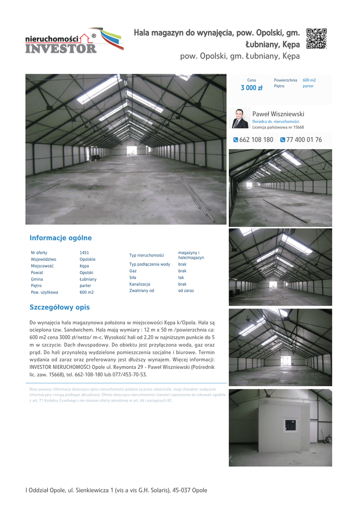Hala magazyn do wynajęcia, pow. Opolski, gm. Łubniany, Kępa pow. Opolski, gm. Łubniany, Kępa Cena 3 000 zł Powierzchnia Piętro 600 m2 parter Paweł Wiszniewski Doradca ds. nieruchomości Licencja państwowa nr 15668 662 108 180 Informacje ogólne Nr oferty 1451 Województwo Opolskie Miejscowość Powiat Gmina Piętro Pow. użytkowa Typ nieruchomości magazyny i hale/magazyn Kępa Typ podłączenia wody brak Opolski Gaz brak Łubniany Siła tak parter Kanalizacja brak 600 m2 Zwalniany od od zaraz Szczegółowy opis Do wynajęcia hala magazynowa położona w miejscowości Kępa k/Opola. Hala są ocieplona tzw. Sandwichem. Hala mają wymiary : 12 m x 50 m /powierzchnia ca: 600 m2 cena 3000 zł/netto/ m-c. Wysokość hali od 2,20 w najniższym punkcie do 5 m w szczycie. Dach dwuspadowy. Do obiektu jest przyłączona woda, gaz oraz prąd. Do hali przynależą wydzielone pomieszczenia socjalne i biurowe. Termin wydania od zaraz oraz preferowany jest dłuższy wynajem. Więcej informacji: INVESTOR NIERUCHOMOŚCI Opole ul. Reymonta 29 - Paweł Wiszniewski (Pośrednik lic. zaw. 15668), tel. 662-108-180 lub 077/453-70-53. Nota prawna: Informacje dotyczące opisu nieruchomości podane są przez właściciela, mają charakter wyłącznie informacyjny i mogą podlegać aktualizacji. Oferta dotycząca nieruchomości stanowi zaproszenie do rokowań zgodnie z art. 71 Kodeksu Cywilnego i nie stanowi oferty określonej w art. 66 i następnych KC. I Oddział Opole, ul. Sienkiewicza 1 (vis a vis G.H. Solaris), 45-037 Opole 77 400 01 76 77 400 01 76 • [email protected] • www.investor.net.pl 2017-03-02 11:31:42 Strona 1 z 1