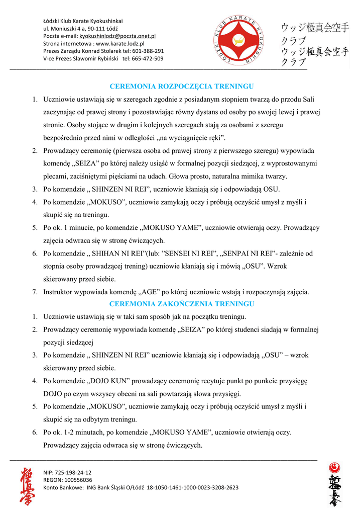 Łódzki Klub Karate Kyokushinkai ul. Moniuszki 4 a, 90-111 Łódź Poczta e-mail: [email protected] Strona internetowa : www.karate.lodz.pl Prezes Zarządu Konrad Stolarek tel: 601-388-291 V-ce Prezes Sławomir Rybiński tel: 665-472-509 _________________________________________________________________________________________ CEREMONIA ROZPOCZĘCIA TRENINGU 1. Uczniowie ustawiają się w szeregach zgodnie z posiadanym stopniem twarzą do przodu Sali zaczynając od prawej strony i pozostawiając równy dystans od osoby po swojej lewej i prawej stronie. Osoby stojące w drugim i kolejnych szeregach stają za osobami z szeregu bezpośrednio przed nimi w odległości „na wyciągnięcie ręki”. 2. Prowadzący ceremonię (pierwsza osoba od prawej strony z pierwszego szeregu) wypowiada komendę „SEIZA” po której należy usiąść w formalnej pozycji siedzącej, z wyprostowanymi plecami, zaciśniętymi pięściami na udach. Głowa prosto, naturalna mimika twarzy. 3. Po komendzie „ SHINZEN NI REI”, uczniowie kłaniają się i odpowiadają OSU. 4. Po komendzie „MOKUSO”, uczniowie zamykają oczy i próbują oczyścić umysł z myśli i skupić się na treningu. 5. Po ok. 1 minucie, po komendzie „MOKUSO YAME”, uczniowie otwierają oczy. Prowadzący zajęcia odwraca się w stronę ćwiczących. 6. Po komendzie „ SHIHAN NI REI”(lub: ”SENSEI NI REI”, „SENPAI NI REI”- zależnie od stopnia osoby prowadzącej trening) uczniowie kłaniają się i mówią „OSU”. Wzrok skierowany przed siebie. 7. Instruktor wypowiada komendę „AGE” po której uczniowie wstają i rozpoczynają zajęcia. CEREMONIA ZAKOŃCZENIA TRENINGU 1. Uczniowie ustawiają się w taki sam sposób jak na początku treningu. 2. Prowadzący ceremonię wypowiada komendę „SEIZA” po której studenci siadają w formalnej pozycji siedzącej 3. Po komendzie „ SHINZEN NI REI” uczniowie kłaniają się i odpowiadają „OSU” – wzrok skierowany przed siebie. 4. Po komendzie „DOJO KUN” prowadzący ceremonię recytuje punkt po punkcie przysięgę DOJO po czym wszyscy obecni na sali powtarzają słowa przysięgi. 5. Po komendzie „MOKUSO”, uczniowie zamykają oczy i próbują oczyścić umysł z myśli i skupić się na odbytym treningu. 6. Po ok. 1-2 minutach, po komendzie „MOKUSO YAME”, uczniowie otwierają oczy. Prowadzący zajęcia odwraca się w stronę ćwiczących. ____________________________________________________________________________________________ NIP: 725-198-24-12 REGON: 100556036 Konto Bankowe: ING Bank Śląski O/Łódź 18-1050-1461-1000-0023-3208-2623 Łódzki Klub Karate Kyokushinkai ul. Moniuszki 4 a, 90-111 Łódź Poczta e-mail: [email protected] Strona internetowa : www.karate.lodz.pl Prezes Zarządu Konrad Stolarek tel: 601-388-291 V-ce Prezes Sławomir Rybiński tel: 665-472-509 _________________________________________________________________________________________ 7. Po komendzie „ SHIHAN NI REI”(lub: ”SENSEI NI REI”, „SENPAI NI REI”- zależnie od stopnia osoby prowadzącej trening) wszyscy uczniowie kłaniają się , aby oddać mu honor odpowiadając OSU – wzrok skierowany przed siebie. 8. Komenda „SENSEI NI REI” i/lub „SENPAI NI REI” również może być wywołana, a uczniowie powinni się ukłonić do instruktorów i odpowiedzieć OSU – wzrok skierowany przed siebie. 9. Komenda „OTAGAI NI REI”. Uczniowie powinni ukłonić się i odpowiedzieć „OSU”. 10. Prowadzący zajęcia wstaje i mówi „Arigato Gozaimashita” co oznacza podziękowania dla wszystkich za trening. Uczniowie powinni odpowiedzieć ukłonem i „ Arigato Gozaimashita” 11. Instruktor kończy zajęcia – komendą „AGE” prosi uczniów o powstanie szeregami zaczynając od najwyższych stopniem. Każdy szereg wykonuje ukłon w pozycji stojącej w stronę instruktora wypowiadając głośno „OSU” następnie wykonuje obrót przez prawe ramię i kłania się w stronę kolejnego szeregu wypowiadając „OSU”. ____________________________________________________________________________________________ NIP: 725-198-24-12 REGON: 100556036 Konto Bankowe: ING Bank Śląski O/Łódź 18-1050-1461-1000-0023-3208-2623