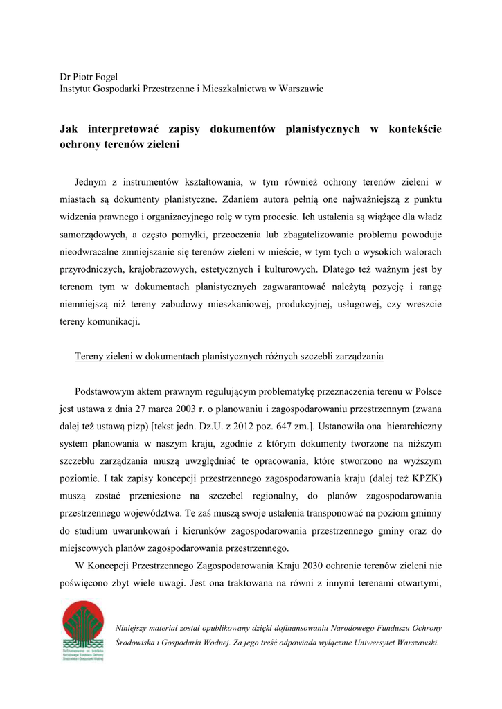 Dr Piotr Fogel Instytut Gospodarki Przestrzenne i Mieszkalnictwa w Warszawie Jak interpretować zapisy dokumentów planistycznych w kontekście ochrony terenów zieleni Jednym z instrumentów kształtowania, w tym również ochrony terenów zieleni w miastach są dokumenty planistyczne. Zdaniem autora pełnią one najważniejszą z punktu widzenia prawnego i organizacyjnego rolę w tym procesie. Ich ustalenia są wiążące dla władz samorządowych, a często pomyłki, przeoczenia lub zbagatelizowanie problemu powoduje nieodwracalne zmniejszanie się terenów zieleni w mieście, w tym tych o wysokich walorach przyrodniczych, krajobrazowych, estetycznych i kulturowych. Dlatego też ważnym jest by terenom tym w dokumentach planistycznych zagwarantować należytą pozycję i rangę niemniejszą niż tereny zabudowy mieszkaniowej, produkcyjnej, usługowej, czy wreszcie tereny komunikacji. Tereny zieleni w dokumentach planistycznych różnych szczebli zarządzania Podstawowym aktem prawnym regulującym problematykę przeznaczenia terenu w Polsce jest ustawa z dnia 27 marca 2003 r. o planowaniu i zagospodarowaniu przestrzennym (zwana dalej też ustawą pizp) [tekst jedn. Dz.U. z 2012 poz. 647 zm.]. Ustanowiła ona hierarchiczny system planowania w naszym kraju, zgodnie z którym dokumenty tworzone na niższym szczeblu zarządzania muszą uwzględniać te opracowania, które stworzono na wyższym poziomie. I tak zapisy koncepcji przestrzennego zagospodarowania kraju (dalej też KPZK) muszą zostać przeniesione na szczebel regionalny, do planów zagospodarowania przestrzennego województwa. Te zaś muszą swoje ustalenia transponować na poziom gminny do studium uwarunkowań i kierunków zagospodarowania przestrzennego gminy oraz do miejscowych planów zagospodarowania przestrzennego. W Koncepcji Przestrzennego Zagospodarowania Kraju 2030 ochronie terenów zieleni nie poświęcono zbyt wiele uwagi. Jest ona traktowana na równi z innymi terenami otwartymi, Niniejszy materiał został opublikowany dzięki dofinansowaniu Narodowego Funduszu Ochrony Środowiska i Gospodarki Wodnej. Za jego treść odpowiada wyłącznie Uniwersytet Warszawski. jako część przyrodniczych struktur przestrzennych. W KPZK podkreślono tymczasem problem niewielkiej roli jaką przypisuje się terenom zieleni w polityce przestrzennej „… na terytorium Polski współistnieją dwa słabo skoordynowane systemy ochrony o dość odmiennych kryteriach delimitacji i podstawach zarządzania przestrzenią cenną przyrodniczo oraz ochroną walorów wizualnych zastanego krajobrazu. Infrastruktura zieleni obszarów zurbanizowanych z nielicznymi wyjątkami pozostaje poza systemem, a rzeczywisty stopień ochrony nie odzwierciedla funkcji w ekosystemach miast i utrzymaniu dobrego stanu różnorodności biologicznej”. Na regionalnym poziomie zarządzania przestrzenią zapisy związane z ochroną terenów zieleni w miastach, ale i na terenach wiejskich mają charakter miękki, są postulatami, które nie gwarantują należytej ochrony tych terenów. Podkreślić przy tym należy, że samorząd województwa nie ma takich kompetencji by móc w swoich dokumentach formułować twarde zapisy odnoszące się do przedmiotu naszych rozważań. Wyjątkiem w tym względzie jest wskazanie do ochrony, zachowania tych terenów zieleni, które wchodzą w skład założeń urbanistycznych, zespołów parkowych lub pałacowo-parkowych i innych podlegających ochronie na mocy ustawy z dnia 23 lipca 2003 r. o ochronie zabytków i opiece nad zabytkami [Dz.U. 2003 nr 162 poz. 1568]. Największe kompetencje w zakresie kształtowania, w tym również ochrony terenów zieleni w miastach mają samorządy lokalne. Do zadań tych jednostek należy ustalanie polityki przestrzennej oraz na jej podstawie tworzenie prawa miejscowego w zakresie gospodarowania przestrzenią. Polityka przestrzenna miast Sformułowanie polityka przestrzenna zaistniało w obiegu prawnym w 1994 r. W art. 6 ust. 1 ustawy z dnia 7 lipca 1994 r. o zagospodarowaniu przestrzennym [Dz.U. 1994 nr 89 poz. 415] zapisano „w celu określenia polityki przestrzennej gminy, rada gminy podejmuje uchwałę o przystąpieniu do sporządzania studium uwarunkowań i kierunków zagospodarowania przestrzennego gminy…”. Poszukiwanie odpowiedzi na pytanie czym w teorii i w praktyce jest polityka przestrzenna nie jest łatwe, gdyż ustawodawca nie doprecyzował tego pojęcia. Zarysował jedynie w przepisach ramy działań dla samorządu. Otworzył w ten sposób pole do szerokiej dyskusji Niniejszy materiał został opublikowany dzięki dofinansowaniu Narodowego Funduszu Ochrony Środowiska i Gospodarki Wodnej. Za jego treść odpowiada wyłącznie Uniwersytet Warszawski. zarówno na polu naukowym jak i aplikacyjnym. Kwerenda poglądów przedstawicieli różnych dziedzin nauki (geografii, architektury, prawa, zarządzania) na problem definiowania polityki przestrzennej pozwoliła na wskazanie cech tej polityki ważnych z punktu widzenia jej istoty i dążenia do osiągnięcia celów, do których należą: kształtowanie ładu przestrzennego, podejmowanie decyzji poprzez dokonywanie wyborów, ochrona interesu publicznego, ustalania priorytetów społecznych, eliminowanie konfliktów przestrzennych [Fogel P. 2012]. Polityka przestrzenna w teoretycznym ujęciu jest sztuką racjonalnego gospodarowania przestrzenią, w oparciu o pryncypia planowania przestrzennego i społecznie przyjęte wartości, której celem jest minimalizowanie konfliktów przestrzennych [Fogel P. 2012]. W tym lapidarnym opisie zawiera się cały sens znaczenia tego pojęcia, a także możliwość realizacji celów opisanych powyżej. Tymczasem w praktyce, w owej „sztuce” czasami trudno doszukać się pierwiastka racjonalności przy podejmowaniu decyzji dotyczących gospodarowania przestrzenią. Jedną z przyczyn jest powierzenie, wymagających dużej wiedzy teoretycznej i praktycznej, czynności osobom, które nie posiadają odpo