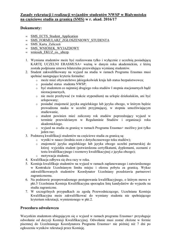 Zasady rekrutacji i realizacji wyjazdów studentów NWSP w Białymstoku na częściowe studia za granicą (SMS) w r. akad. 2016/17 Dokumenty: • • • • • SMS_ECTS_Student_Application SMS_FORMULARZ_ZGŁOSZENIOWY_STUDENTA SMS_Karta_Zaliczeń SMS_WNIOSEK_WYJAZDOWY wniosek_EKUZ_os._ubezp. 1. Wymiana studentów może być realizowana tylko i wyłącznie z uczelnią posiadającą KARTĘ UCZELNI ERASMUSA+ ważną w danym roku akademickim, z którą została podpisana umowa bilateralna przewidująca wymianę studentów. 2. Student zakwalifikowany na wyjazd na studia w ramach Programu Erasmus musi spełniać następujące kryteria formalne: o może mieć obywatelstwo jakiegokolwiek kraju lub status bezpaństwowca; o posiadać status studenta NWSP; o być studentem co najmniej drugiego roku studiów I stopnia stacjonarnych bądź niestacjonarnych, o nie może przebywać (w trakcie stypendium) na urlopie dziekańskim, ani być urlopowany; o posiadać znajomość języka angielskiego lub języka obcego, w którym będzie prowadzona nauka w uczelni przyjmującej, w stopniu umożliwiającym studiowanie, o student powinien mieć zaliczony rok studiów poprzedzający wyjazd w terminie przewidzianym w Regulaminie Studiów i organizacji roku akademickiego. o wyjazd na studia za granicę w ramach Programu Erasmus+ możliwy jest tylko jeden raz; 3. Podstawą kwalifikacji studentów na częściowe studia za granicą są: o wyniki w nauce (średnia ocen z dotychczasowego toku studiów); o znajomość języka angielskiego lub języka obcego uczelni partnerskiej do której wyjeżdża student (potwierdzona certyfikatami, dyplomami, ocenami z testu kwalifikacyjnego i rozmowy kwalifikacyjnej z języka obcego); o motywacja studenta. 4. Kwalifikacja odbywa się dwa razy w roku. 5. Komisja kwalifikuje studentów na wyjazd w ramach zaplanowanego i zatwierdzonego w Kontrakcie Uczelnianym limitu miejsc i okresu pobytu za granicą. Wykaz zakwalifikowanych studentów Koordynator Uczelniany przedstawia partnerowi zagranicznemu. 6. Na podstawie przeprowadzonego postępowania kwalifikacyjnego, o którym mowa w pkt.5 Uczelniana Komisja Kwalifikacyjna sporządza listę kandydatów do wyjazdu na studia zagraniczne. 7. W szczególnych przypadkach za zgodą Przewodniczącego, Uczelniana Komisja Kwalifikacyjna może zakwalifikować do wymiany studenta nie spełniającego kryterium rekrutacji, wymienionego w pkt.2. Procedura odwoławcza Wszystkim studentom ubiegającym się o wyjazd w ramach programu Erasmus+ przysługuje odwołanie od decyzji Komisji Kwalifikacyjnej. Odwołanie musi zostać złożone w formie pisemnej do Uczelnianego Koordynatora Programu Erasmus+ nie później niż 7 dni po ogłoszeniu wyników rekrutacji przez Komisję. Dokumenty uczelni zagranicznej 1. Student zakwalifikowany na studia częściowe za granicą w ramach Programu Erasmus zobowiązany jest do wypełnienia formularzy: o Application Form (druk wewnętrzny uczelni przyjmującej); o Learning Agreement (druk wewnętrzny uczelni przyjmującej); o Accomodation Form (druk wewnętrzny uczelni przyjmującej); Po zaakceptowaniu przez partnera zagranicznego studentów, których dokumenty aplikacyjne zostały przyjęte, uczelnia partnerska przesyła dokument potwierdzający Acceptance Letter oraz informacje praktyczne określające dalszą procedurę postępowania. Kserokopię dokumentów należy przedłożyć u Koordynatora Uczelnianego. 2. Z każdym studentem zakwalifikowanym na wyjazd zostanie sporządzona pisemna umowa. 3. Każdy student wyjeżdżający w programie Erasmus otrzyma Kartę Studenta Erasmusa+ 4. Student ubiegający się o wyjazd na stypendium Erasmusa+ ma prawo do studiowania według indywidualnej organizacji studiów. 5. Dokładny program studiów zostaje uzgodniony w Learning Agreement pomiędzy uczelnią macierzystą, uczelnią przyjmującą i studentem przed wyjazdem na stypendium. O jakichkolwiek zmianach w stosunku do zaplanowanego i zaakceptowanego porozumienia o programie zajęć student musi powiadomić uczelnię w ciągu 1 miesiąca od przyjazdu do uczelni przyjmującej. Jeśli uczelnia wyrazi zgodę na zmiany, zostaje naniesiona do porozumienia o programie zajęć pisemna poprawka. 6. Dodatkowo student jest zobowiązany wypełnić „kartę zaliczeń” (Recognition Sheet) i kartę obiegową 7. Do uznania osiągnięć studenta w zagranicznej uczelni partnerskiej będą stosowane procedury określone dla Europejskiego Systemu Transferu i Akumulacji Punktów (ECTS). 8. Korelacja między stosowaną w uczelni skalą ocen, a ocenami ECTS: OCENA NAZWA OCENY OCENA ECTS 5 bardzo dobry A (Excellent) 4,5 (4+) dobry plus B (Very Good) 4 C (Good) dobry 3,5 (3+) dostateczny plus D (Satisfactory) 3 dostateczny E (Sufficient) 2 niedostateczny FX, F (Fail) 9. Student otrzymuje na koniec pobytu w uczelni partnerskiej i dostarcza do Uczelnianego Koordynatora pisemne zaświadczenie o pobycie w tej uczelni tzw. Confirmation Letter, wraz z wykazem zaliczonych przedmiotów i uzyskanych ocen w formie „wykazu zaliczeń” tzw. Transcript of Records. 10. Student jest zobowiązany dostarczyć do Uczelnianego Koordynatora i Rektoratu Transcript of Records. Dokumentacja związana z realizacją studiów częściowych za granicą zostaje włączona do teczki akt osobowych studenta. 11. NWSP zobowiązuje się do uznania okresu studiów odbytych w uczelni partnerskiej za równoważny (wyjazd nie wydłuża czasu trwania studiów), pod warunkiem zrealizowania przez studenta „Porozumienia o programie zajęć” (Learning Agreement). 12. W przypadku wystąpienia różnic programowych między planem studiów NWSP, a ofertą dydaktyczną uczelni partnerskiej, dziekan wyznacza różnice programowe do uzupełnienia oraz termin ich zaliczenia. 13. Jeżeli Learning Agreement zakłada zrealizowanie przez studenta większej liczby punktów ECTS niż liczba wymagana do zaliczenia semestru/ roku, przed wyjazdem studenta zostanie uzgodniony sposób uznania punktów 