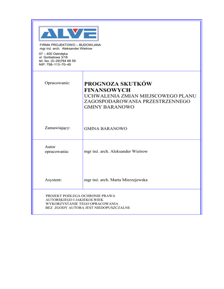 FIRMA PROJEKTOWO – BUDOWLANA mgr inŜ. arch. Aleksander Wietrow 07 – 400 Ostrołęka ul. Gorbatowa 3/18 tel. fax. (0–29)764 66 59 NIP: 758–113–70–45 Opracowanie: PROGNOZA SKUTKÓW FINANSOWYCH UCHWALENIA ZMIAN MIEJSCOWEGO PLANU ZAGOSPODAROWANIA PRZESTRZENNEGO GMINY BARANOWO Zamawiający: GMINA BARANOWO Autor opracowania: mgr inŜ. arch. Aleksander Wietrow Asystent: mgr inŜ. arch. Marta Mierzejewska PROJEKT PODLEGA OCHRONIE PRAWA AUTORSKIEGO I JAKIEKOLWIEK WYKORZYSTANIE TEGO OPRACOWANIA BEZ ZGODY AUTORA JEST NIEDOPUSZCZALNE SPIS TREŚCI 1. 2. 3. 4. 5. Wprowadzenie …………………………………………………………..…….……3 Podstawa prawna opracowania …………………………………………………..3 Materiały źródłowe ………………………………………………………………....4 Cel i zakres opracowania ……………………………………………..………….…4 Charakterystyka obszaru planu …………………………………………………..4 1) PołoŜenie i teren ……………………………………………………………...4 2) Stan zainwestowania terenu ……………………………………………….…5 3) Sytuacja formalno – prawna ……………………………………………………5 4) Rozwiązania przyjęte w projekcie planu ………………………………….…....5 6. Prognoza wpływu ustaleń miejscowego planu zagospodarowania przestrzennego na dochody własne i wydatki gminy ………………………….....6 1) Podatek od nieruchomości …………………………………………………...…7 2) Opłata planistyczna ……………………………………………………....…..7 3) Opłaty adiacenckie. ………………………………………………………..…7 7. Wydatki związane z realizacją inwestycji z zakresu infrastruktury technicznej, które naleŜą do zadań własnych gminy - w okresie 10 lat. ……………………....8 8. Wnioski. ……………………………………………………………………...…..9 Prognoza skutków finansowych uchwalenia Zmiany miejscowego planu zagospodarowania przestrzennego gminy Baranowo Strona 2 z 8 1. WPROWADZENIE Niniejsze opracowanie jest prognozą skutków finansowych przedsięwzięcia, jakim jest uchwalenie i realizacja załoŜeń zmian miejscowego planu zagospodarowania przestrzennego gminy Baranowo. Zidentyfikowane koszty i przychody, które potencjalnie mogą się pojawić po uchwaleniu miejscowego planu, dotyczą budŜetu gminy. Uchwalenie planu jest ustanowieniem prawa gminnego, które poprzez ustalenie przeznaczenia terenów i zasad ich zagospodarowania, powoduje określone skutki przestrzenne, ekonomiczne, prawne. Skutki te wynikają na przykład ze zmiany funkcji terenu, a więc i zmiany wartości gruntów (spadek, wzrost lub utrzymanie obecnej wartości nieruchomości). Prognoza skutków finansowych uchwalenia planu miejscowego określa skutki wpływu ustaleń zawartych w planie pod względem ich realności i efektywności ekonomicznej. Przyjęte rozwiązania planistyczne ocenia się w formie szacowania przybliŜonych kosztów realizacji ustaleń planu i osiągnięcia prawdopodobnych zysków lub korzyści innego typu. Prognoza skutków finansowych uchwalenia miejscowego planu zagospodarowania przestrzennego wykonywana zgodnie z ustawowym obowiązkiem określonym w art. 17 pkt. 5 ustawy z dnia 27 marca 2003 r. o planowaniu i zagospodarowaniu przestrzennym (Dz. U. Nr 80, poz. 717 z późniejszymi zmianami) i stanowi jeden z etapów trybu sporządzenia planu miejscowego. Niniejsza prognoza stanowiąca element miejscowego planu zagospodarowania przestrzennego, którego tryb sporządzenia wywołany został Uchwałą Nr XXXIII/195/2009 Rady Gminy Baranowo z dnia 23 lipca 2009 r. w sprawie przystąpienia do sporządzenia zmian miejscowego planu zagospodarowania przestrzennego gminy Baranowo i Uchwałą Nr XXXIX/236/2010 Rady Gminy Baranowo z dnia 26 marca 2010 r. zmieniającą uchwałę w sprawie przystąpienia do sporządzenia zmian miejscowego planu zagospodarowania przestrzennego gminy Baranowo. Niniejszego opracowania nie naleŜy traktować jako wyceny inwestycji ani wyceny wartości nieruchomości. Wartości zamieszczone w opracowaniu są wartościami przybliŜonymi – orientacyjnymi i nie moŜna ich wykorzystywać jako podstawy do wydawania decyzji administracyjnych. 2. PODSTAWA PRAWNA Podstawę prawną stanowią następujące akty prawne, przepisy wykonawcze i przepisy prawa miejscowego: 1) ustawa z dnia 27 marca 2003 r. o planowaniu i zagospodarowaniu przestrzennym (Dz. U. Nr 80, poz. 717 z późniejszymi zmianami); 2) ustawa z dnia 21 sierpnia 1997 r. o gospodarce nieruchomościami (t.j.: Dz. U. z 2010r. Nr 102 poz. 651); 3) ustawa z dnia 27 sierpnia 2009 r. o finansach publicznych (Dz. U. Nr 157, poz. 1240 z późniejszymi zmianami); 4) rozporządzenie Ministra Infrastruktury z dnia 26 sierpnia 2003 r w sprawie wymaganego zakresu projektu miejscowego planu zagospodarowania przestrzennego (Dz. U. Nr 164, poz. 1587); Prognoza skutków finansowych uchwalenia Zmiany miejscowego planu zagospodarowania przestrzennego gminy Baranowo Strona 3 z 8 5) Uchwała Nr XXXIII/195/2009 Rady Gminy Baranowo z dnia 23 lipca 2009 r. w sprawie przystąpienia do sporządzenia zmian miejscowego planu zagospodarowania przestrzennego gminy Baranowo; 6) Uchwała Nr XXXIX/236/2010 Rady Gminy Baranowo z dnia 26 marca 2010 r. zmieniająca uchwałę w sprawie przystąpienia do sporządzenia zmian miejscowego planu zagospodarowania przestrzennego gminy Baranowo; 7) uchwała Nr XV/97/2011 Rady Gminy Baranowo z dnia 2 grudnia 2011r. w sprawie określenia wysokości stawek podatku od nieruchomości. 3. 1) 2) 3) 4) 5) 4. MATERIAŁY ŹRÓDŁOWE Prognozę wykonano na podstawie: projektu zmian miejscowego planu zagospodarowania przestrzennego gminy Baranowo; rysunku projektu planu w skali 1 : 10
