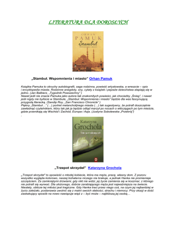 LITERATURA DLA DOROSŁYCH „Stambuł. Wspomnienia i miasto” Orhan Pamuk Książka Pamuka to okruchy autobiografii, saga rodzinna, powieść artystowska, a wreszcie – opis i encyklopedia miasta. Rodzinne anegdoty, sny, cytaty z książek i pejzaże dzieciństwa stapiają się w jedno. (Jan Balbierz, „Tygodnik Powszechny” ) Nawet jeśli nie znacie Pamuka jako autora tak znakomitych powieści, jak chociażby „Śnieg”, i nawet jeśli nigdy nie byliście w Stambule, „Stambuł. Wspomnienia i miasto” będzie dla was fascynującą przygodą literacką. (Sandip Roy, „San Francisco Chronicle” ) Piękny „Stambuł…” (…) portret melancholijnego miasta (…) tak sugestywny, że potrafi doszczętnie zawładnąć czytelnikiem, który tak jak ja będzie odtąd marzył po nocach o włóczęgach po tym mieście, gdzie przenikają się Wschód i Zachód, Europa i Azja. (Justyna Sobolewska „Przekrój”) . „Trzepot skrzydeł” Katarzyna Grochola „Trzepot skrzydeł” to opowieść o młodej kobiecie, która ma męża, pracę, własny dom. Z pozoru wszystko wygląda kolorowo, naszej bohaterce niczego nie brakuje, a jednak Hanka nie promienieje szczęściem. Za zamkniętymi drzwiami, gdy nikt nie widzi, jej życie zamienia się w koszmar, z którego nie potrafi się wyrwać. Dla ułożonego, dobrze zarabiającego męża jest najważniejsza na świecie. Niestety, oblicze tej miłości jest tragiczne. Gdy Hanka traci przez niego coś, na czym jej najbardziej w życiu zależało, postanawia uwolnić się z matni swoich słabości, strachu i niemocy. Przy okazji w dość zaskakujący sposób na nowo nawiązuje więź z – być może – najbliższą jej osobą… „Kiedyś byłam księżną” Jacqueline Pascarl-Gillespie Opis: Wstrząsająca, autobiograficzna historia Australijki, która wyszła za malajskiego księcia i wyjechała z nim do jego kraju. Obiecany raj okazuje się koszmarem: zdradzana i lekceważona Jacqueline wraz z dwojgiem dzieci ucieka do ojczyzny. Szczęśliwy spokój nie trwa jednak długo. Mąż podstępem wykrada dzieci i uwozi nie wiadomo gdzie... Ku przestrodze wszystkich matek i kobiet, które decydują się na małżeństwo z przedstawicielem innej kultury. Literatura dla dzieci i młodzieży „Nasz przyjaciel delfin” Wioletta Święcińska Bohaterowie serii książeczek "Opowieści o zwierzętach" przeżywają wspólnie różne przygody, czasem niebezpieczne, ale dzięki wzajemnej sympatii i trosce wszystko dobrze się kończy. Bajki są napisane językiem dostosowanym do najmłodszych czytelników i pięknie, kolorowo zilustrowane. „Top modelka” Meg Cabot Siedemnastoletnia Emerson uwielbia gry komputerowe i seriale na Discovery, za to nie zależy jej na wyglądzie ani powodzeniu. I nagle staje się zupełnie inną dziewczyną: po dziwnym wypadku budzi się w ciele sławnej supermodelki. Ale w nowym życiu „celebrytki” czekają na nią nie tylko flirt, blask fleszy i seksowne kreacje... „Mój pierwszy kotek” Chyba każde dziecko marzy o kotku albo innym zwierzątku. Czasem trudno mu wytłumaczyć, z jak wieloma obowiązkami łączy się bycie małym opiekunem. Ta książka pomoże dziecku to zrozumieć. Opowie o większości ważnych i trudnych sytuacji, z którymi przyjdzie mu się zmierzyć. Poradzi, jak zachowywać się jako właściciel i przyjaciel kota. Literatura niebeletrystyczna „Społeczeństwo sieci” Darin Barney W „Społeczeństwie sieci” Darin Barney przekonująco przedstawia społeczne, polityczne i ekonomiczne implikacje technologii sieciowych oraz ich zastosowań w rozmaitych dziedzinach i instytucjach. Czy znajdujemy się w samym środku cyfrowej rewolucji? Czy nowe technologie informacyjne i komunikacyjne powołały do życia nowy rodzaj społeczeństwa, czy też wzmacniają i przedłużają istniejące wzorce i więzi? Autor z wielkim zaangażowaniem omawia w książce te i inne kwestie. Odwołując się do wyrafinowanego modelu relacji technologia – społeczeństwo, Barney docieka, co w erze internetu uległo zmianie, a co pozostało takie samo. Książka ta jest nieocenionym zasobem informacji dla wszystkich, którzy pragną mądrze się odnaleźć w społeczeństwie sieci. „Europa walczy 1939-1945 Nie takie proste zwycięstwo” Norman Davies Ktoś powiedział o Normanie Daviesie, że posiada dar, który mają tylko wielcy historycy - umiejętność przemyślenia przeszłości na nowo. Ktoś inny dodał: „Norman Davies ukazuje nam namiętności, poezję, mity i anegdoty równie dobrze jak historyczne fakty”. Prawdziwości obu tych opinii dowodzi najnowsza książka Daviesa. Jeśli ktokolwiek mógł napisać coś nowego o II wojnie światowej - przedstawić nowy sposób patrzenia na nią - to właśnie Norman Davies. Autor bestsellerowego „Powstania' 44” i odkrywczej syntezy historii Polski, czyli „Bożego igrzyska”, dokonał tego w fascynujący i pouczający sposób. „Małe narody Europy” Miroslav Hroch Przegląd dziejów 27 małych narodów europejskich, m.in. Basków, Chorwatów, Greków, Katalończyków, Litwinów, Macedończyków, Serbów, które do czasu przemian politycznych końca XX wieku lub nigdy dotąd nie uzyskały niezawisłości. Autor, czeski historyk, międzynarodowy autorytet w tej dziedzinie, przybliża problematykę nacjonalizmu, znaczenia dziedzictwa historycznego i zagadnienie narodu jako wyniku manipulacji emocjonalnej i kulturowej.