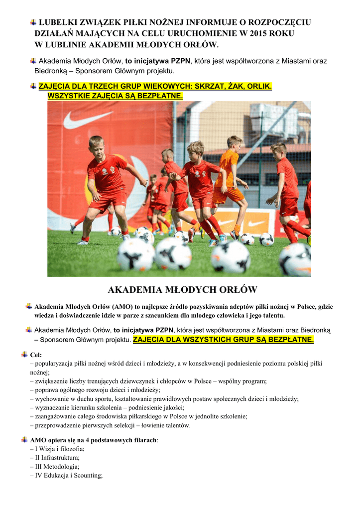 LUBELKI ZWIĄZEK PIŁKI NOŻNEJ INFORMUJE O ROZPOCZĘCIU DZIAŁAŃ MAJĄCYCH NA CELU URUCHOMIENIE W 2015 ROKU W LUBLINIE AKADEMII MŁODYCH ORŁÓW. Akademia Młodych Orłów, to inicjatywa PZPN, która jest współtworzona z Miastami oraz Biedronką – Sponsorem Głównym projektu. ZAJĘCIA DLA TRZECH GRUP WIEKOWYCH: SKRZAT, ŻAK, ORLIK. WSZYSTKIE ZAJĘCIA SĄ BEZPŁATNE. AKADEMIA MŁODYCH ORŁÓW Akademia Młodych Orłów (AMO) to najlepsze źródło pozyskiwania adeptów piłki nożnej w Polsce, gdzie wiedza i doświadczenie idzie w parze z szacunkiem dla młodego człowieka i jego talentu. Akademia Młodych Orłów, to inicjatywa PZPN, która jest współtworzona z Miastami oraz Biedronką – Sponsorem Głównym projektu. ZAJĘCIA DLA WSZYSTKICH GRUP SĄ BEZPŁATNE. Cel: – popularyzacja piłki nożnej wśród dzieci i młodzieży, a w konsekwencji podniesienie poziomu polskiej piłki nożnej; – zwiększenie liczby trenujących dziewczynek i chłopców w Polsce – wspólny program; – poprawa ogólnego rozwoju dzieci i młodzieży; – wychowanie w duchu sportu, kształtowanie prawidłowych postaw społecznych dzieci i młodzieży; – wyznaczanie kierunku szkolenia – podniesienie jakości; – zaangażowanie całego środowiska piłkarskiego w Polsce w jednolite szkolenie; – przeprowadzenie pierwszych selekcji – łowienie talentów. AMO opiera się na 4 podstawowych filarach: – I Wizja i filozofia; – II Infrastruktura; – III Metodologia; – IV Edukacja i Scounting; Filozofia AMO W gnieździe orlim panuje określona harmonia i porządek. Każde orle pisklę oraz orlik wie, co do niego należy. Ma i zna swój zakres obowiązków. Stara się z nich wywiązywać. Istnieje w swoistym systemie wartości, zasad i reguł, jakimi powinien się kierować. Filozofia AMO zakłada, aby w Akademii zarówno sztab szkoleniowy, jak i dzieci, młodzież oraz ich rodzice, tworzyli stabilne orle gniazdo, z ściśle określonymi celami: Radość. Harmonia. Wychowanie. Indywidualizm. xxxxxxxxxxxxxxxxxx Zasada łączenia piłki nożnej i nauki szkolnej buduje charakter piłkarza. Jego osobowość i siła psychiczna są obecne na boisku. Nacisk na edukację, wyniki w szkole oraz dyscyplinę w zachowaniu piłkarza – to sedno funkcjonowania Akademii. Infrastruktura Akademia przy współpracy z samorządem miejskim, wykorzystuje infrastrukturę boisk typu Orlik. Metodologia Główne nurty opierają się na zainteresowaniu piłką nożną oraz zachęceniu dzieci do regularnego uprawiania sportu. Polski Związek Piłki Nożnej stworzył autorski program szkoleniowy, na kanwie którego odbywają się zajęcia w ramach AMO w całej Polsce. Edukacja: – Ilość grup wiekowych: 3 (max. 16 osób w grupie, 2 trenerów AMO, 2 asystentów trenerów AMO) – Skrzat: do 7 lat – Żak Młodszy/Żak: 8 – 9 lat – Orlik Młodszy/Orlik: 10 – 11 lat – rekrutacja podczas „Dnia Talentu” – podczas Letniej Akademii Młodych Orłów (w okresie wakacji obóz piłkarski dla najzdolniejszych zawodników z poszczególnych AMO w kraju, gdzie koszty pobytu pokrywa PZPN, następuje pierwsze ,,wyławienie’’ talentów). UCZESTNIKAMI ZAJĘĆ SĄ DZIECI, KTÓRE OSIĄGNĄ NAJLEPSZE WYNIKI W TESTACH SPRAWNOŚCIOWYCH PRZEPROWADZANYCH W CZASIE REKRUTACJI PODCZAS ,,DNIA TALENTU’’. ZAJĘCIA DLA POSZCZEGÓLNYCH GRUP W AKADEMII ODBYWAJĄ SIĘ DWA RAZY W TYGODNIU W NASTĘPUJĄCYM WYMIARZE CZASOWYM: – Skrzat – 2x w tygodniu po 60 minut; – Żak Młodszy/Żak – 2x w tygodniu po 75 minut; – Orlik Młodszy/Orlik – 2x w tygodniu po 90 minut. Zajęcia odbywają się w udostępnionym przez miasto obiekcie typu ORLIK lub innym podobnym boisku o zbliżonych wymiarach z podłożem ze sztuczną trawą. Planowane dni zajęć w tygodniu: od poniedziałku do piątku (ewentualnie soboty dla kat. skrzat). Planowane godziny zajęć: - od 16:30 lub 17:00, zakończenie zajęć 20:00 lub 20:15 (dla starszych roczników - głównie dla Orlików). Godziny zajęć ustalane są wg potrzeb poszczególnych grup rocznikowych. W okresie miesięcy XI-III zajęcia odbywają się na hali/sali sportowej. ZAJĘCIA DLA WSZYSTKICH GRUP SĄ BEZPŁATNE. PEŁNY SPRZĘT SPORTOWY ZAPEZBIECZA POLSKI ZWIĄZEK PIŁKI NOŻNEJ. UCZESTNICY ZAJĘĆ W AMO - ZAWODNICY KLUBÓW SPORTWYCH POZOSTAJĄ NADAL Z PRZYNALEŻNOSCIĄ KLUBOWĄ. ZAJĘCIA W AMO NALEŻY TRAKTOWAĆ JAKO ZAJĘCIA UZUPEŁNIAJĄCE SZKOLENIE KLUBOWE. KLUBY/TRENERZY NIE MOGĄ WYWIERAĆ PRESJI NA ZAWODNIKACH I RODZICACH CO DO KONIECZNOŚCI UCZESTNICTWA MŁODEGO PIŁKARZA TYLKO NA ZAJĘCIACH KLUBOWYCH. DECYZJA CO DO UCZESTNICTWA DZIECKA NA ZAJĘCIACH W AMO NALEŻY DO RODZICÓW. Akademia Młode Orły, to inicjatywa PZPN. Nabór (sprawdziany i testy) – rekrutacja do AMO dotyczyć będzie w br. następujących roczników: – Skrzat: do 7 lat – od s. 2015/2016 – rocznik 2009; – Żak Młodszy/Żak: 8 – 9 lat – od s. 2015/2016 – rocznik 2008-2007; – Orlik Młodszy/Orlik: 10 – 11 lat – od s. 2015/2016 – rocznik 2006-2005. ,,DZIEŃ TALENTU’’ – nabór do AMO w Lublinie zostanie ogłoszony w terminie późniejszym. Podczas trwania całego cyklu szkoleniowego Lubelski ZPN zapewni wykwalifikowaną kadrę szkoleniową w osobach Trenera Głównego oraz Asystenta Trenera. Trener Główny oraz Asystent Trenera zostaną zatrudnieni przez LZPN/PZPN po akceptacji i przeszkoleniu kandydatów przez PZPN. Cele i program szkolenia: - w ZAŁĄCZNIKACH do niniejszej informacji na stronie Lubelskiego Związku lub na www.pzpn.pl