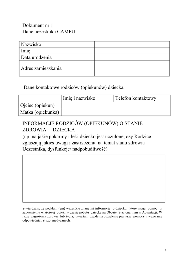 Dokument nr 1 Dane uczestnika CAMPU: Nazwisko Imię Data urodzenia Adres zamieszkania Dane kontaktowe rodziców (opiekunów) dziecka Imię i nazwisko Telefon kontaktowy Ojciec (opiekun) Matka (opiekunka) INFORMACJE RODZICÓW (OPIEKUNÓW) O STANIE ZDROWIA DZIECKA (np. na jakie pokarmy i leki dziecko jest uczulone, czy Rodzice zgłaszają jakieś uwagi i zastrzeżenia na temat stanu zdrowia Uczestnika, dysfunkcje/ nadpobudliwość) Stwierdzam, że podałam (em) wszystkie znane mi informacje o dziecku, które mogą pomóc w zapewnieniu właściwej opieki w czasie pobytu dziecka na Obozie Stacjonarnym w Aquastacji. W razie zagrożenia zdrowia lub życia, wyrażam zgodę na udzielenie pierwszej pomocy i wezwanie odpowiednich służb medycznych. 1 Dokument nr 2 Proszę o uzupełnienie tylko jeśli dziecko będzie odbierane przez inne osoby niż rodzice. Upoważniam następujące osoby do odbioru mojego dziecka z campu w dniach ……………………………….. Nazwisko Imię Seria i numer dokumentu tożsamości Podpis opiekuna prawnego …………………………… 2 Dokument nr 3 NIEZBĘDNIK UCZESTNIKA CAMPU Dziecko przyprowadzamy na zajęcia w stroju sportowym. Zmiana obuwia jest obowiązkowa. Dwa plecaki : Plecak nr 1- rzeczy na zajęcia basenowe; Klapki, Czepek, Okulary, Kąpielówki lub strój kąpielowy, Żel pod prysznic Ręcznik Reklamówka na mokre rzeczy, Plecak nr 2 Spodenki, 2x T-shirt, Długie spodnie dresowe, Bluza z długim rękawem, Buty sportowe z podeszwą nie pozostawiającą śladów ( najlepiej podeszwa gumowa) Obowiązkowo dziecko musi posiadać swój bidon (rozpoznawalny przez dziecko). Do tych bidonów będziemy nalewać dzieciom wodę bez ograniczeń. Śniadanie dzieci przynoszą ze sobą z domu. Obiad i podwieczorek zapewnia organizator campu. 3 Dokument 4 Regulamin campu Uczestnicy warsztatów zobowiązani są do przybycia na miejsce zajęć o 8.15 ( od 7.30 funkcjonuje na Sali świetlica) każdego dnia a odbiór dzieci o godzinie 16.30-16.45. Przekazanie dzieci następuje na sali gimnastycznej w budynku Alchemii (wejście od Al. Grunwaldzkiej 411). 1. Dziecko ma przy sobie wymagany sprzęt i odzież opisaną w dokumencie nr 2 2. Dziecko jest odbierane przez rodziców lub osoby wyznaczone do tego w dokumencie nr 3. 3. Dziecko przyjęte zostanie na kurs wyłącznie po dostarczeniu uzupełnionej i podpisanej dokumentacji. Dostarczenie dokumentów następuje najpóźniej 5 dni przed rozpoczęciem campu skanem, a w 1 dzień campu fizycznie. Parafka na każdej stronie dokumentu i podpisy w wyznaczonych miejscach. 4. Przelewu można dokonywać na konto dziecka w ciągu 7 dni od dnia dokonania elektronicznej rezerwacji na konto: UKS AQUASTACJA 09124053541111001065241298 5. Organizator nie ponosi odpowiedzialności za pieniądze, przedmioty wartościowe oraz rzeczy Uczestników lub pozostawione przez Uczestników bez opieki na terenie Aquastacji& Sportstacji. 4 Dokument nr 5 Postanowienia końcowe i oświadczenia. Oświadczam, że w imieniu własnym oraz zgłoszonych przeze mnie osób zapoznałem/am się z Warunkami Uczestnictwa w obozie stacjonarnym w Aquastacji, programem imprezy oraz pozostałymi informacjami stanowiącymi integralną część Zgłoszenia oraz potwierdzam prawdziwość wszystkich danych zawartych w niniejszej Zgłoszeniu. Oświadczam, iż wyrażam zgodę na przetwarzanie (zgodnie z Ustawą o Ochronie Danych Osobowych z dn. 29.08.1997r.) moich danych osobowych oraz danych osobowych zgłoszonych przeze mnie osób do celów związanych z wykonaniem przedmiotowej umowy o świadczenie usług jak i umowy dotyczącej ubezpieczenia uczestników. Wyrażam zgodę na fotografowanie i/lub nagrywanie mojego dziecka oraz użycie tych materiałów w dokumentacji i promocji obozów Aquastacji oraz promocji sportu przez Aquastację& Sportstację. Oświadczam, iż stan zdrowia zgłoszonych przeze mnie osób umożliwia uczestnictwo w obozie sportowym będącym przedmiotem Zgłoszenia. Zobowiązuję się także do terminowego uiszczenia wszystkich opłat związanych z uczestnictwem dziecka w obozie. Akceptuję powyższe warunki. …….…………………………….. Data i podpis rodzica (opiekuna) 5