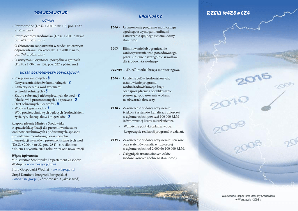 PRAWODAWSTWO USTAWY - Prawo wodne (Dz.U. z 2001 r. nr 115, poz. 1229 z późn. zm.) - Prawo ochrony środowiska (Dz.U. z 2001 r. nr 62, poz. 627 z późn. zm.) - O zbiorowym zaopatrzeniu w wodę i zbiorowym odprowadzaniu ścieków (Dz.U. z 2001 r. nr 72, poz. 747 z późn. zm.) - O utrzymaniu czystości i porządku w gminach (Dz.U. z 1996 r. nr 132, poz. 622 z późn. zm.) - LICZBA ROZPORZĄDZEŃ DOTYCZĄCYCH: Przepisów ramowych - 3 Oczyszczania ścieków komunalnych - 3 Zanieczyszczenia wód azotanami ze źródeł rolniczych - 5 Zrzutu substancji niebezpiecznych do wód - 2 Jakości wód przeznaczonych do spożycia - 2 Stref ochronnych ujęć wody - 4 Wody w kąpieliskach - 1 Wód powierzchniowych będących środowiskiem życia ryb, skorupiaków i mięczaków - 2 Rozporządzenie Ministra Środowiska w sprawie klasyfikacji dla prezentowania stanu wód powierzchniowych i podziemnych, sposobu prowadzenia monitoringu oraz sposobu interpretacji wyników i prezentacji stanu tych wód (Dz.U. z 2004 r. nr 32, poz. 284) - straciło moc z dniem 1 stycznia 2005 roku, w trakcie nowelizacji. Więcej informacji: Ministerstwo Środowiska Departament Zasobów Wodnych - www.mos.gov.pl/dzw/ Biuro Gospodarki Wodnej - www.bgw.gov.pl Urząd Komitetu Integracji Europejskiej - www.ukie.gov.pl (→ Środowisko → Jakość wód) KALENDARZ RZEKI MAZOWSZA 2006 - Ustanowienie programu monitoringu zgodnego z wymogami unijnymi i stworzenie spójnego systemu oceny stanu wód. 2007 - Eliminowanie lub ograniczanie zanieczyszczenia wód powodowanego przez substancje szczególnie szkodliwe dla środowiska wodnego. 2007/08 - „Duża” interkalibracja monitoringowa. 2009 - Ustalenie celów środowiskowych, ustanowienie programu wodnośrodowiskowego kraju oraz sporządzenie i opublikowanie planów gospodarowania wodami na obszarach dorzeczy. 2010 - Zakończenie budowy oczyszczalni ścieków i systemów kanalizacji zbiorczej w aglomeracjach powyżej 100 000 RLM (równoważnej liczby mieszkańców). - Wdrożenie polityki opłat za wodę. - Rozpoczęcie realizacji programów działań. 2015 - Zakończenie budowy oczyszczalni ścieków oraz systemów kanalizacji zbiorczej w aglomeracjach od 2 000 do 100 000 RLM. - Osiągnięcie ustanowionych celów środowiskowych (dobrego stanu wód). Wojewódzki Inspektorat Ochrony Środowiska w Warszawie - 2005 r. STAN CZYSTOŚCI RZEK W ROKU 2004 PRZYCZYNY ZANIECZYSZCZENIA • Brak wód bardzo dobrej (I klasa) i dobrej jakości (II klasa). • Zbyt mała liczba funkcjonujących oczyszczalni ścieków. Odsetek ludności obsługiwanej przez oczyszczalnie ścieków w województwie mazowieckim wynosi obecnie 46,5% (w Polsce 58,2%, w Niemczech i Wielkiej Brytanii przekracza 90%). • Wody zadowalającej jakości (III klasa) występowały w 16 punktach pomiarowych (12,7% badanych punktów) m.in. na rzekach: Pilica, Radomka. • Niewłaściwa eksploatacja istniejących obiektów; kontrole WIOŚ wykazały, że w niemal co drugiej oczyszczalni ścieków komunalnych występują nieprawidłowości. • Wody niezadowalającej jakości (IV klasa) występowały w 91 punktach pomiarowych (72,2% badanych punktów) m.in. na rzekach: Wisła, Narew, Bug, Wkra, Liwiec, Bzura, Orzyc, Omulew, Łydynia, Jeziorka. • W porównaniu do liczby mieszkańców korzystających z wodociągów (78,5%) zbyt mała ich liczba jest podłączona do kanalizacji (56,2%). Badania przeprowadzono w 126 punktach pomiarowych z oznaczeniem ponad 50 wskaźników fizyko-chemicznych i biologicznych. • Wody złej jakości (V klasa) występowały w 19 punktach (15,1% badanych punktów) m.in. na rzekach Kraska, Jagodzianka, Mienia, Mleczna, Skrwa Lewa. Do wód złej jakości nie badanych w 2004 r., ale badanych cyklicznie (w 2003 oraz w bieżącym roku) należą Utrata, Raszynka, Rokitnica. Wpływ na stwierdzoną jakość wód rzek mają zanieczyszczenia mikrobiologiczne oraz biogenne (związki azotu i fosforu). • Około 30% ścieków ujętych w systemy kanalizacyjne trafia w stanie nieoczyszczonym do wód lub do ziemi (przede wszystkim z lewobrzeżnej Warszawy). • Niekorzystny wskaźnik długości sieci wodociągowych do sieci kanalizacyjnych na terenach wiejskich (sieć wodociągowa ponad jedenaście razy dłuższa od kanalizacyjnej). • Spływy powierzchniowe z terenów rolniczych zanieczyszczonych związkami biogennymi (azot i fosfor) oraz środkami ochrony roślin. Główne przyczyny to: - brak płyt gnojowych do składowania obornika, - niewłaściwe zabiegi agrotechniczne. NAJPILNIEJSZE POTRZEBY • Realizacja harmonogramu zawartego w "Krajowym Programie Oczyszczania Ścieków Komunalnych", w tym: - rozwiązanie problemu nieoczyszczonych ścieków z lewobrzeżnej Warszawy, - rozbudowa/modernizacja 77 oczyszczalni ścieków komunalnych, - budowa 29 oczyszczalni i ponad 3000 km sieci kanalizacyjnej. • Dokończenie budowy kanalizacji opaskowej nad Jeziorem Zegrzyńskim. • Kontynuacja budowy sieci kanalizacyjnej i oczyszczalni na terenach wiejskich. Rozwiązanie problemu niedociążenia oczyszczalni ścieków wynikającego m.in. z niedostatecznie rozwiniętej sieci kanalizacyjnej. • Wprowadzenie i stosowanie na wszystkich etapach postępowania zasady "skojarzonego działania" w stosunku do zadań dotyczących wodociągowania i kanalizacji wsi. • Wdrażanie Kodeksu Dobrej Praktyki Rolniczej. • Uzyskiwanie pozwoleń zintegrowanych dla dużych obiektów hodowlanych. • Zwiększenie zasobów wód powierzchniowych poprzez budowę i rekonstrukcję zbiorników małej retencji.