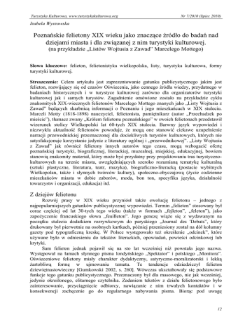 Turystyka Kulturowa, www.turystykakulturowa.org Nr 7/2010 (lipiec 2010) Izabela Wyszowska Poznańskie felietony XIX wieku jako znaczące źródło do badań nad dziejami miasta i dla związanej z nim turystyki kulturowej. (na przykładzie „Listów Wojtusia z Zawad” Marcelego Mottego) Słowa kluczowe: felieton, felietonistyka wielkopolska, listy, turystyka kulturowa, formy turystyki kulturowej. Streszczenie: Celem artykułu jest zaprezentowanie gatunku publicystycznego jakim jest felieton, rozwijający się od czasów Oświecenia, jako cennego źródła wiedzy, przydatnego w badaniach historycznych i w turystyce kulturowej zarówno dla organizatorów turystyki kulturowej jak i samych turystów. Zagadnienie omówione zostało na przykładzie cyklu znakomitych XIX-wiecznych felietonów Marcelego Mottego znanych jako „Listy Wojtusia z Zawad” będących skarbnicą informacji o Poznaniu i jego mieszkańcach w XIX stuleciu. Marceli Motty (1818-1898) nauczyciel, felietonista, pamiętnikarz (autor „Przechadzek po mieście”), tłumacz zwany „Królem felietonu poznańskiego” w swoich felietonach przedstawił wizerunek stolicy Wielkopolski lat 60-tych XIX stulecia. Barwny język wypowiedzi i niezwykła aktualność felietonów powoduje, że mogą one stanowić ciekawe uzupełnienie narracji przewodnickiej przeznaczonej dla dociekliwych turystów kulturowych, których nie satysfakcjonuje korzystanie jedynie z literatury ogólnej i „przewodnikowej”. „Listy Wojtusia z Zawad” jak również felietony innych autorów tego czasu, mogą wzbogacić ofertę poznańskiej turystyki, biograficznej, literackiej, muzealnej, miejskiej, edukacyjnej, bowiem stanowią znakomity materiał, który może być przydatny przy projektowaniu tras turystycznokulturowych na terenie miasta, uwzględniających szeroko rozumianą tematykę kulturalną (sztuki plastyczne, literatura, teatr, muzyka), biograficzno-literacką (postacie wybitnych Wielkopolan, także i słynnych twórców kultury), społeczno-obyczajową (życie codzienne mieszkańców miasta w dobie zaborów, moda, bon ton, specyfika języka, działalność towarzystw i organizacji, edukacja) itd. Z dziejów felietonu Rozwój prasy w XIX wieku przyniósł także ewolucję felietonu – jednego z najpopularniejszych gatunków publicystycznej wypowiedzi. Termin „felieton” stosowany był coraz częściej od lat 30-tych tego wieku (także w formach „fejleton”, „feleton”), jako zapożyczenie francuskiego słowa „feuilleton”. Jego genezę wiąże się z wydawanym na początku stulecia dodatkiem rozrywkowym do paryskiego „Journal des 'Debats”, który drukowany był pierwotnie na osobnych kartkach, później przeniesiony został na dół kolumny gazety pod typograficzną kreskę. W Polsce występowało też określenie „odcinek”, które używane było w odniesieniu do tekstów literackich, opowiadań, powieści odcinkowej lub krytyki. Sam felieton jednak pojawił się na sto lat wcześniej niż powstała jego nazwa. Występował na łamach słynnego pisma londyńskiego „Spektator” i polskiego „Monitora”. Oświeceniowe felietony miały charakter dydaktyczny, satyryczno-moralizatorski i lekką żartobliwą formę w ujmowaniu tematu. Te tendencje odziedziczył felieton dziewiętnastowieczny [Gumkowski 2002, s. 260]. Wówczas ukształtowały się podstawowe funkcje tego gatunku publicystycznego. Przeznaczony był dla masowego, nie jak wcześniej, jedynie określonego, elitarnego czytelnika. Zadaniem tekstów z działu felietonowego było zainteresowanie, przyciągnięcie odbiorcy, nawiązanie z nim trwałych kontaktów i w konsekwencji zachęcenie go do regularnego nabywania pisma. Biorąc pod uwagę 12 Turystyka Kulturowa, www.turystykakulturowa.org Nr 7/2010 (lipiec 2010) zróżnicowanie gustów, felieton łączono z rubryką „różności” i jego treść charakteryzowała się „mozaikowością” tematyczną. Felietonista „przeskakiwał” zręcznie z tematu na temat, wprowadzając przy tym zmiany nastroju. Cechą jego była też nieoficjalność, prywatność, subiektywizacja wypowiedzi w porównaniu z poważnym tonem artykułów ponad kreską. Felieton w związku z tym stanowił swoiste narzędzie perswazji, wykorzystywane do celów społeczno-wychowawczych lub propagandowo-politycznych. Cykliczność tekstów niejako uzależniała odbiorcę, kształtując przy tym jego światopogląd, gust i potrzeby. W polskiej felietonistyce pierwszej połowy XIX wieku kontynuowane były tradycje rozwinięte w dobie oświecenia, ale równocześnie kształtował się inny nowoczesny typ felietonu oparty na obserwacjach, refleksjach, odczuciach narratora. Upowszechnił się on dzięki Gerardowi Maurycemu Witowskiemu publikującemu w duchu francuskich felietonów Jouya w „Gazecie Warszawskiej” pod pseudonimem Pustelnik z Krakowskiego Przedmieścia oraz Józefowi Brykczyńskiemu (piszącemu pod nazwiskiem Bywalski). Felietoniści nowego typu zajmowali się często krytyką zwłaszcza teatralną. Dominowała jednak tematyka obyczajowa ukazująca życie ówczesnej Warszawy. W latach 30-tych i 40-tych XIX wieku obserwuje się szczególne rozszerzenie zakresu tematycznego i formalnego felietonu. Oprócz częstej formy listu stosowanej chętnie przez Henryka Rzewuskiego i Józefa Ignacego Kraszewskiego, rozwinął się typ o charakterze szkicu fizjologicznego, felieton humorystyczny, reportażowy czy historyczno-antykwaryczny. W końcu lat 40-tych zauważa się w felietonistyce kronikę, która stała się wkrótce głównym reprezentantem gatunku. Jej specyfiką była odpowiednia selekcja opisywanych, aktualnych wydarzeń (w odróżnieniu od kroniki informacyjnej dążącej do kompletności i zwięzłości) i efektowne, dowcipne ich omówienie. Kronikę opierano na źródłach, informacjach z bieżącej prasy, ale także wykorzystywano plotki, pogłoski krążące po mieście. Dobór tematyki zależał generalnie od indywidualnych