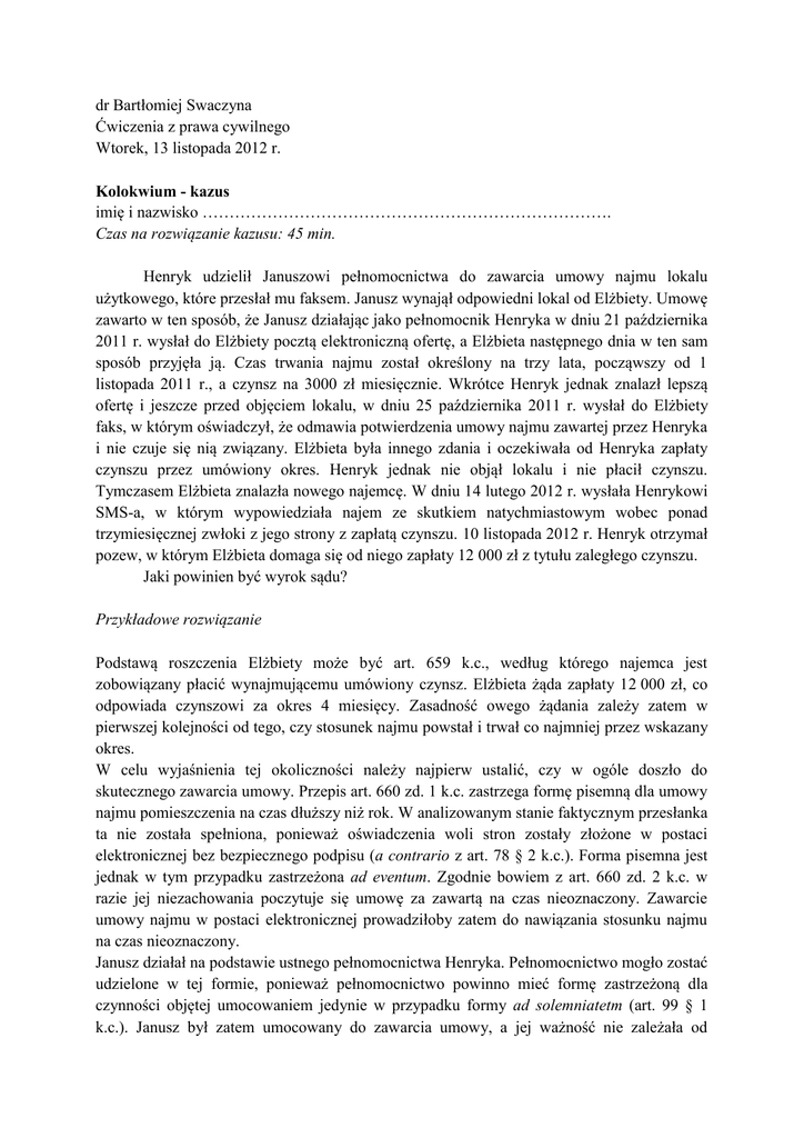 dr Bartłomiej Swaczyna Ćwiczenia z prawa cywilnego Wtorek, 13 listopada 2012 r. Kolokwium - kazus imię i nazwisko …………………………………………………………………. Czas na rozwiązanie kazusu: 45 min. Henryk udzielił Januszowi pełnomocnictwa do zawarcia umowy najmu lokalu użytkowego, które przesłał mu faksem. Janusz wynajął odpowiedni lokal od Elżbiety. Umowę zawarto w ten sposób, że Janusz działając jako pełnomocnik Henryka w dniu 21 października 2011 r. wysłał do Elżbiety pocztą elektroniczną ofertę, a Elżbieta następnego dnia w ten sam sposób przyjęła ją. Czas trwania najmu został określony na trzy lata, począwszy od 1 listopada 2011 r., a czynsz na 3000 zł miesięcznie. Wkrótce Henryk jednak znalazł lepszą ofertę i jeszcze przed objęciem lokalu, w dniu 25 października 2011 r. wysłał do Elżbiety faks, w którym oświadczył, że odmawia potwierdzenia umowy najmu zawartej przez Henryka i nie czuje się nią związany. Elżbieta była innego zdania i oczekiwała od Henryka zapłaty czynszu przez umówiony okres. Henryk jednak nie objął lokalu i nie płacił czynszu. Tymczasem Elżbieta znalazła nowego najemcę. W dniu 14 lutego 2012 r. wysłała Henrykowi SMS-a, w którym wypowiedziała najem ze skutkiem natychmiastowym wobec ponad trzymiesięcznej zwłoki z jego strony z zapłatą czynszu. 10 listopada 2012 r. Henryk otrzymał pozew, w którym Elżbieta domaga się od niego zapłaty 12 000 zł z tytułu zaległego czynszu. Jaki powinien być wyrok sądu? Przykładowe rozwiązanie Podstawą roszczenia Elżbiety może być art. 659 k.c., według którego najemca jest zobowiązany płacić wynajmującemu umówiony czynsz. Elżbieta żąda zapłaty 12 000 zł, co odpowiada czynszowi za okres 4 miesięcy. Zasadność owego żądania zależy zatem w pierwszej kolejności od tego, czy stosunek najmu powstał i trwał co najmniej przez wskazany okres. W celu wyjaśnienia tej okoliczności należy najpierw ustalić, czy w ogóle doszło do skutecznego zawarcia umowy. Przepis art. 660 zd. 1 k.c. zastrzega formę pisemną dla umowy najmu pomieszczenia na czas dłuższy niż rok. W analizowanym stanie faktycznym przesłanka ta nie została spełniona, ponieważ oświadczenia woli stron zostały złożone w postaci elektronicznej bez bezpiecznego podpisu (a contrario z art. 78 § 2 k.c.). Forma pisemna jest jednak w tym przypadku zastrzeżona ad eventum. Zgodnie bowiem z art. 660 zd. 2 k.c. w razie jej niezachowania poczytuje się umowę za zawartą na czas nieoznaczony. Zawarcie umowy najmu w postaci elektronicznej prowadziłoby zatem do nawiązania stosunku najmu na czas nieoznaczony. Janusz działał na podstawie ustnego pełnomocnictwa Henryka. Pełnomocnictwo mogło zostać udzielone w tej formie, ponieważ pełnomocnictwo powinno mieć formę zastrzeżoną dla czynności objętej umocowaniem jedynie w przypadku formy ad solemniatetm (art. 99 § 1 k.c.). Janusz był zatem umocowany do zawarcia umowy, a jej ważność nie zależała od potwierdzenia przez Henryka. Wskutek zawarcia wspomnianej umowy powstał zatem stosunek najmu. Przy rozważaniu zasadności roszczenia Elżbiety należy także ustalić, czy najem trwał przez co najmniej cztery miesiące. Był to najem na czas nieoznaczony, który może być wypowiedziany na trzy miesiące naprzód na koniec miesiąca kalendarzowego (art. 688 k.c.). Odmowę potwierdzenia najmu przez Henryka można potraktować jako wypowiedzenie najmu. Dla oświadczenia tego nie była wymagana jakakolwiek forma (a contrario z art. 77 k.c.). Przesłanie oświadczenia faksem było zatem wystarczające. Wypowiedzenie nastąpiło 25 października, termin wypowiedzenia nie mógł się jednak rozpocząć z końcem tego miesiąca, tj. w dniu 31 października 2011 r., ponieważ stosunek najmu powstał dopiero ze skutkiem od 1 listopada. Dlatego też początek terminu wypowiedzenia przypadł na 30 listopada. Termin ten upłynął 29 lutego 2012 r. (art. 688 k.c.) Najem trwałby zatem cztery miesiące. Elżbieta nabyłaby więc cztery roszczenia z tytułu czynszu opiewające na 3000 zł każde. Łącznie mogłaby żądać od Henryka z tytuł zaległego czynszu sumy 12 000 zł. Należy także zbadać, czy wypowiedzenie dokonane przez Elżbietę nie doprowadziło do wcześniejszego zakończenia stosunku najmu. Elżbieta wypowiedziała najem ze skutkiem natychmiastowym 14 lutego 2012 r. Wypowiedzenie nastąpiło przez SMS-a. Forma taka jest dopuszczalna, jako że umowa najmu nie została zawarta na piśmie (wniosek a contrario z art. 77 k.c.). Zgodnie z art. 687 k.c. wypowiedzenie najmu lokalu bez zachowania terminu wypowiedzenia może nastąpić w razie zwłoki z zapłatą czynszu za co najmniej dwa pełne okresy płatności. W analizowanym stanie faktycznym zwłoka wynosiła ponad trzy okresy, więc Elżbiecie przysługiwało uprawnienie do wypowiedzenia najmu ze skutkiem natychmiastowym. Jednakże, jak stanowi art. 687 k.c., wynajmujący powinien uprzedzić najemcę na piśmie o zamiarze wypowiedzenia, udzielając mu dodatkowego miesięcznego terminu. Elżbieta nie spełniła tych wymogów i dlatego wypowiedzenie było bezskuteczne. Najem wygasł po czterech miesiącach wskutek wypowiedzenia dokonanego przez Henryka. Sąd powinien uwzględnić powództwo Elżbiety.
