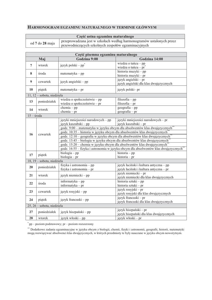 HARMONOGRAM EGZAMINU MATURALNEGO W TERMINIE GÓWNYM od 7 do 28 maja Maj Cz ustna egzaminu maturalnego przeprowadzana jest w szkoach wedug harmonogramów ustalonych przez przewodniczcych szkolnych zespoów egzaminacyjnych Cz pisemna egzaminu maturalnego Godzina 9:00 Godzina 14:00 7 wtorek jzyk polski – pp* 8 roda matematyka – pp 9 czwartek jzyk angielski – pp 10 pitek matematyka – pr wiedza o tacu – pp wiedza o tacu – pr* historia muzyki – pp historia muzyki – pr jzyk angielski – pr jzyk angielski dla klas dwujzycznych jzyk polski– pr 11, 12 – sobota, niedziela wiedza o spoeczestwie – pp filozofia – pp poniedziaek 13 wiedza o spoeczestwie – pr filozofia – pr chemia – pp geografia – pp wtorek 14 chemia – pr geografia – pr 15 – roda jzyki mniejszoci narodowych – pp jzyki mniejszoci narodowych – pr jzyk kaszubski – pp jzyk kaszubski – pr godz. 9:00 – matematyka w jzyku obcym dla absolwentów klas dwujzycznych** godz. 10:35 – historia w jzyku obcym dla absolwentów klas dwujzycznych** czwartek 16 godz. 12:10 – geografia w jzyku obcym dla absolwentów klas dwujzycznych** godz. 13:45 – biologia w jzyku obcym dla absolwentów klas dwujzycznych** godz. 15:20 – chemia w jzyku obcym dla absolwentów klas dwujzycznych** godz. 16:55 – fizyka i astronomia w jzyku obcym dla absolwentów klas dwujzycznych** biologia – pp historia – pp pitek 17 biologia – pr historia – pr 18, 19 – sobota, niedziela fizyka i astronomia – pp jzyk aciski i kultura antyczna – pp poniedziaek 20 fizyka i astronomia – pr jzyk aciski i kultura antyczna – pr jzyk niemiecki – pr wtorek jzyk niemiecki – pp 21 jzyk niemiecki dla klas dwujzycznych informatyka – pp historia sztuki – pp roda 22 informatyka – pr historia sztuki – pr jzyk rosyjski – pr czwartek jzyk rosyjski – pp 23 jzyk rosyjski dla klas dwujzycznych jzyk francuski – pr pitek jzyk francuski – pp 24 jzyk francuski dla klas dwujzycznych 25, 26 – sobota, niedziela jzyk hiszpaski – pr poniedziaek jzyk hiszpaski – pp 27 jzyk hiszpaski dla klas dwujzycznych wtorek jzyk woski – pp jzyk woski – pr 28 * pp – poziom podstawowy; pr – poziom rozszerzony ** Dodatkowe zadania egzaminacyjne w jzyku obcym z biologii, chemii, fizyki i astronomii, geografii, historii, matematyki mog rozwizywa absolwenci klas dwujzycznych, w których przedmioty te byy nauczane w jzyku obcym nowoytnym. HARMONOGRAM EGZAMINU MATURALNEGO W TERMINIE DODATKOWYM* dla zdajcych, którzy uzyskali zgod dyrektora okrgowej komisji egzaminacyjnej na przystpienie do egzaminu maturalnego w dodatkowym terminie od 3 do 19 czerwca Cz ustna egzaminu maturalnego przeprowadzana jest w szkoach wedug harmonogramów ustalonych przez przewodniczcych szkolnych zespoów egzaminacyjnych Czerwiec Cz pisemna egzaminu maturalnego Godzina 9:00 Godzina 14:00 3 4 poniedziaek wtorek jzyk polski – pp** matematyka – pp 5 roda jzyk angielski – pp 6 czwartek wiedza o spoeczestwie – pp, pr 7 pitek biologia – pp, pr jzyk polski – pr** matematyka – pr jzyk angielski – pr jzyk angielski dla klas dwujzycznych chemia – pp, pr historia – pp, pr wiedza o tacu – pp, pr 8, 9 – sobota, niedziela 10 poniedziaek jzyk francuski pp 11 wtorek geografia – pp, pr filozofia – pp, pr 12 roda jzyk rosyjski – pp jzyk francuski – pr jzyk francuski dla klas dwujzycznych informatyka – pp, pr jzyk aciski i kultura antyczna – pp, pr przedmioty zdawane w jzyku obcym*** jzyk rosyjski – pr jzyk rosyjski dla klas dwujzycznych 13 – czwartek 14 pitek fizyka i astronomia – pp, pr historia sztuki – pp, pr historia muzyki – pp, pr 15, 16 – sobota, niedziela 17 poniedziaek 18 wtorek 19 roda jzyk niemiecki – pp jzyki mniejszoci narodowych – pp jzyk kaszubski – pp, pr jzyk hiszpaski – pp jzyk woski – pp jzyk niemiecki – pr jzyk niemiecki dla klas dwujzycznych jzyki mniejszoci narodowych – pr jzyk hiszpaski – pr jzyk hiszpaski dla klas dwujzycznych jzyk woski – pr * Informacja o miejscach egzaminu zostanie umieszczona na stronie internetowej waciwej okrgowej komisji egzaminacyjnej w ostatnim tygodniu maja 2013 r. ** pp – poziom podstawowy; pr – poziom rozszerzony *** Dodatkowe zadania egzaminacyjne w jzyku obcym z biologii, chemii, fizyki i astronomii, geografii, historii, matematyki mog rozwizywa absolwenci klas dwujzycznych, w których przedmioty te byy nauczane w jzyku obcym nowoytnym. Przekazanie przez okrgowe komisje egzaminacyjne wiadectw do szkó – 28 czerwca 2013 r. (data wydania wiadectw dojrzaoci i aneksów do wiadectw dojrzaoci z egzaminu maturalnego przeprowadzanego w maju i w czerwcu: 28 czerwca 2013 r.). HARMONOGRAM EGZAMINU MATURALNEGO W TERMINIE POPRAWKOWYM* dla zdajcych egzamin, którzy przystpili do egzaminu maturalnego ze wszystkich przedmiotów obowizkowych i nie zdali egzaminu tylko z jednego przedmiotu w czci ustnej albo w czci pisemnej 1. Cz pisemna – 27 sierpnia 2013 r. (wtorek), godz. 9:00 2. Cz ustna – 26–30 sierpnia 2013 r. * Informacja o miejscu egzaminu i szczegóowych terminach egzaminów ustnych zostanie umieszczona na stronie internetowej waciwej okrgowej komisji egzaminacyjnej w terminie do dnia 10 sierpnia 2013 r. Przekazanie przez okrgowe komisje egzaminacyjne wiadectw do szkó – 13 wrzenia 2013 r. (data wydania wiadectw dojrzaoci z egzaminu maturalnego przeprowadzanego w sierpniu: 13 wrzenia 2013 r.). CZAS TRWANIA POSZCZEGÓLNYCH CZ CI EGZAMINU MATURALNEGO W CZ CI PISEMNEJ* Przedmioty Czas trwania (min) Arkusze jzyk polski matematyka jzyki mniejszoci narodowych poziom podstawowy 170 poziom rozszerzony poziom podstawowy jzyki obce nowoytne poziom rozszerzony** 180 120 120 70 180 75 120 90 150 cz I cz II poziom dwujzyczny poziom podstawowy** informatyka poziom rozszerzony** cz I cz II cz I cz II filozofia historia poziom podstawowy historia muzyki historia sztuki jzyk aciski i kultura antyczna wiedza o spoeczestwie poziom rozszerzony wiedza o tacu jzyk kaszubski