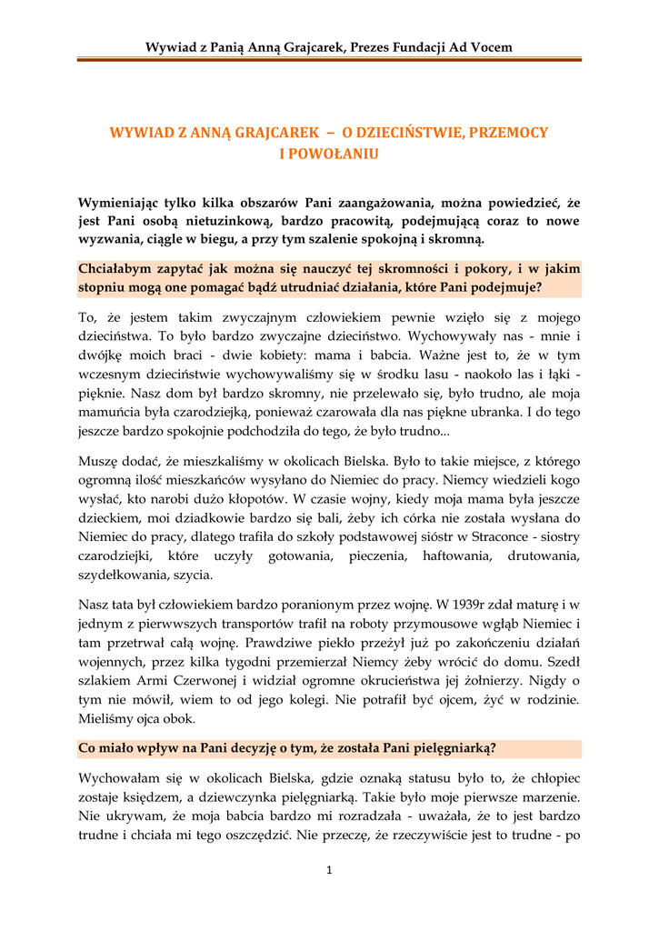 Wywiad z Panią Anną Grajcarek, Prezes Fundacji Ad Vocem WYWIAD Z ANNĄ GRAJCAREK − O DZIECIŃSTWIE, PRZEMOCY I POWOŁANIU Wymieniając tylko kilka obszarów Pani zaangażowania, można powiedzieć, że jest Pani osobą nietuzinkową, bardzo pracowitą, podejmującą coraz to nowe wyzwania, ciągle w biegu, a przy tym szalenie spokojną i skromną. Chciałabym zapytać jak można się nauczyć tej skromności i pokory, i w jakim stopniu mogą one pomagać bądź utrudniać działania, które Pani podejmuje? To, że jestem takim zwyczajnym człowiekiem pewnie wzięło się z mojego dzieciństwa. To było bardzo zwyczajne dzieciństwo. Wychowywały nas - mnie i dwójkę moich braci - dwie kobiety: mama i babcia. Ważne jest to, że w tym wczesnym dzieciństwie wychowywaliśmy się w środku lasu - naokoło las i łąki pięknie. Nasz dom był bardzo skromny, nie przelewało się, było trudno, ale moja mamuńcia była czarodziejką, ponieważ czarowała dla nas piękne ubranka. I do tego jeszcze bardzo spokojnie podchodziła do tego, że było trudno... Muszę dodać, że mieszkaliśmy w okolicach Bielska. Było to takie miejsce, z którego ogromną ilość mieszkańców wysyłano do Niemiec do pracy. Niemcy wiedzieli kogo wysłać, kto narobi dużo kłopotów. W czasie wojny, kiedy moja mama była jeszcze dzieckiem, moi dziadkowie bardzo się bali, żeby ich córka nie została wysłana do Niemiec do pracy, dlatego trafiła do szkoły podstawowej sióstr w Straconce - siostry czarodziejki, które uczyły gotowania, pieczenia, haftowania, drutowania, szydełkowania, szycia. Nasz tata był człowiekiem bardzo poranionym przez wojnę. W 1939r zdał maturę i w jednym z pierwwszych transportów trafił na roboty przymousowe wgłąb Niemiec i tam przetrwał całą wojnę. Prawdziwe piekło przeżył już po zakończeniu działań wojennych, przez kilka tygodni przemierzał Niemcy żeby wrócić do domu. Szedł szlakiem Armi Czerwonej i widział ogromne okrucieństwa jej żołnierzy. Nigdy o tym nie mówił, wiem to od jego kolegi. Nie potrafił być ojcem, żyć w rodzinie. Mieliśmy ojca obok. Co miało wpływ na Pani decyzję o tym, że została Pani pielęgniarką? Wychowałam się w okolicach Bielska, gdzie oznaką statusu było to, że chłopiec zostaje księdzem, a dziewczynka pielęgniarką. Takie było moje pierwsze marzenie. Nie ukrywam, że moja babcia bardzo mi rozradzała - uważała, że to jest bardzo trudne i chciała mi tego oszczędzić. Nie przeczę, że rzeczywiście jest to trudne - po 1 Wywiad z Panią Anną Grajcarek, Prezes Fundacji Ad Vocem szkole pielęgniarskiej trafiłam na Akademię Medyczną, zdawałam na Wydział Lekarski, ale przyjęli mnie na farmację, ponieważ zabrakło mi kilku punktów. Byłam kilka semestrów na farmacji i okazało się, że to nie to, chociaż dobrze to wspominam, (...) ale życie akademickie było takie ciekawe. Ja nie imprezowałam, natomiast zaliczałam wszystkie koncerty, które były w Krakowie - kiedyś wszystko odbywało się w akademiku przy ul. Grzegórzeckiej 20. Wszyscy, którzy się wtedy liczyli - m.in. Maryla Rodowicz, Czerwone Gitary, Święcicki - tam koncertowali. Potem trafiłam na praktyki studenckie i do szpitala uniwersyteckiego Akademii Medycznej na oddział hematologii, no i już zostałam. To było coś takiego, co rzeczywiście zmieniło moje życie - zobaczyłam oddział inny, niż miałam wyobrażenie z moich praktyk i zostałam z powrotem pielęgniarką. Nie na długo, bo złapałam żółtaczkę zakaźną i musiałam zmienić miejsce. I wtedy trafiłam na salę operacyjną, bo to też było takie moje marzenie, i tak zostałam. Ta aktywność, którą Pani prowadziła, te wszystkie działania, w które była Pani zaangażowana właściwie bardziej skupiały się na świecie dorosłych, prawda? Kiedy zaczęła się Pani interesować problematyką dzieci? Rzeczywiście, do pewnego momentu żyłam w takiej enklawie, jaką była sala operacyjna. Dopiero gdy zostałam przewodniczącą samorządu i kiedy zaczęły się problemy w szkołach, ponieważ wyłączono (usunięto ze szkół) lekarzy, zostały tylko pielęgniarki. One nie bardzo były do tego przygotowane, bo dotąd były współpracownikami i miały być taką podporą lekarza. A tymczasem powierzono im zadanie, do którego były nieprzygotowane. Znalazły się w trudnej sytuacji i pojawiły się problemy. Na szczęście zaczęły mi o nich opowiadać, jak również o swoich uczniach – o dzieciach wykorzystywanych, maltretowanych, o takich, które znalazły się w dziecięcym piekle. Ja sobie w ogóle nie zdawałam z tego sprawy. Od czasu do czasu pojawiały się w prasie jakieś artykuły, słyszeliśmy o przypadkach dzieciobójstwa, ale ja nie wiedziałam, że skala tego zjawiska jest tak duża i że nikt z tym nic nie robi! Myślałam, że jakoś to jest uregulowane. Wtedy zorganizowałam spotkanie dla grupy pielęgniarek szkolnych i wysłuchałam ich historii. Efekt był taki, że przez kilka nocy nie spałam, bo to co usłyszałam, to były straszne rzeczy. Wymyśliliśmy wtedy, że trzeba coś zrobić, coś zmienić, że to nie może tak być. Musimy przygotować pielęgniarki do pracy z dziećmi i ponoszenia większej odpowiedzialności za swoją pracę. Zaczęłam więc chodzić i prosić – a to były czasy kiedy ministrami byli moi koledzy. Niestety zawiodłam się na nich absolutnie, ponieważ nie bardzo to widzieli, nie chcieli słuchać. I wtedy właśnie jeden z moich znajomych powiedział mi, że jest dziewczyna z ONZ, która ma świetne kontakty, jest wysokim urzędnikiem, i może będzie gotowa pomóc. Nazywa się Kasia Malinowska. To był początek dobrego okresu i współpracy, która trwa do 2 Wywiad z Panią Anną Grajcarek, Prezes Fundacji Ad Vocem dzisiaj. Przygotowałam mój pierwszy w życiu projekt, który spodobał się, został przyjęty i dostaliśmy sporo pieniędzy na jego realizację. Który to był rok? To był 1992 r