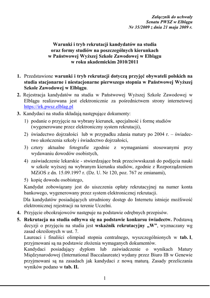 Załącznik do uchwały Senatu PWSZ w Elblągu Nr 35/2009 z dnia 21 maja 2009 r. Warunki i tryb rekrutacji kandydatów na studia oraz formy studiów na poszczególnych kierunkach w Państwowej WyŜszej Szkole Zawodowej w Elblągu w roku akademickim 2010/2011 1. Przedstawione warunki i tryb rekrutacji dotyczą przyjęć obywateli polskich na studia stacjonarne i niestacjonarne pierwszego stopnia w Państwowej WyŜszej Szkole Zawodowej w Elblągu. 2. Rejestracja kandydatów na studia w Państwowej WyŜszej Szkole Zawodowej w Elblągu realizowana jest elektronicznie za pośrednictwem strony internetowej https://irk.pwsz.elblag.pl 3. Kandydaci na studia składają następujące dokumenty: 1) podanie o przyjęcie na wybrany kierunek, specjalność i formę studiów (wygenerowane przez elektroniczny system rekrutacji), 2) świadectwo dojrzałości lub w przypadku zdania matury po 2004 r. – świadectwo ukończenia szkoły i świadectwo dojrzałości, 3) cztery aktualne fotografie zgodnie z wymaganiami stosowanymi przy wydawaniu dowodów osobistych, 4) zaświadczenie lekarskie - stwierdzające brak przeciwwskazań do podjęcia nauki w szkole wyŜszej na wybranym kierunku studiów, zgodnie z Rozporządzeniem MZiOS z dn. 15.09.1997 r. (Dz. U. Nr 120, poz. 767 ze zmianami), 5) kopię dowodu osobistego, Kandydat zobowiązany jest do uiszczenia opłaty rekrutacyjnej na numer konta bankowego, wygenerowany przez system elektronicznej rekrutacji. Dla kandydatów posiadających utrudniony dostęp do Internetu istnieje moŜliwość elektronicznej rejestracji na terenie Uczelni. 4. Przyjęcie obcokrajowców następuje na podstawie odrębnych przepisów. 5. Rekrutacja na studia odbywa się na podstawie konkursu świadectw. Podstawą decyzji o przyjęciu na studia jest wskaźnik rekrutacyjny „W”, wyznaczany wg zasad określonych w ust. 7. Laureaci i finaliści olimpiad stopnia centralnego, wyszczególnionych w tab. I, przyjmowani są na podstawie złoŜenia wymaganych dokumentów. Kandydaci posiadający dyplom lub zaświadczenie o wynikach Matury Międzynarodowej (International Baccalaureate) wydany przez Biuro IB w Genewie przyjmowani są na zasadach jak kandydaci z nową maturą. Zasady przeliczania wyników podano w tab. II. 1 6. Planowane rozmiary rekrutacji, przedmioty konkursowe i egzaminacyjne, nazwy olimpiad, dających pierwszeństwo przyjęć na poszczególne kierunki studiów, przedstawiono w tab. I. Rektor, w porozumieniu z dyrektorem instytutu moŜe zmienić planowane rozmiary rekrutacji. W przypadku, jeŜeli liczba osób przyjętych na dany kierunek i specjalność w stosunku do planowanych rozmiarów rekrutacji nie przekroczy 30 osób – moŜe zostać podjęta decyzja o nieuruchomieniu studiów. 7. W przypadku uruchomienia nowej specjalności w ramach istniejącego kierunku dyrektor instytutu występuje z wnioskiem do rektora o zwiększenie planowanego rozmiaru rekrutacji dla kierunku, w którym specjalność jest uruchamiana i ustala w porozumieniu z rektorem planowany rozmiar rekrutacji na tę specjalność. 2 Tabela I. Kryteria i planowane rozmiary rekrutacji na studia pierwszego stopnia Instytut 1 Planowane rozmiary rekrutacji na studia Kryteria rekrutacji Przedmioty konkursowe stacjonar ne niestacjonarne lub egzaminacyjne 2 3 4 Inne kryteria 5 INSTYTUT EKONOMICZNY Kierunek: ADMINISTRACJA (Tytuł zawodowy: licencjat) (P1) Geografia albo Historia albo WOS Specjalność: Administracja samorządowa i finanse publiczne (P2) Język polski Olimpiady: (P3) Język obcy historyczna, wiedzy o Polsce i świecie współczesnym 90 90 Kierunek: EKONOMIA (Tytuł zawodowy: licencjat) Specjalność: Ekonomika menedŜerska (P1) Geografia albo Historia albo Matematyka albo WOS 70 40 (P2) Język polski Olimpiady: matematyczna, wiedzy ekonomicznej, wiedzy o Polsce i świecie współczesnym, wiedzy o Unii Europejskiej (P3) Język obcy Specjalność: Ekonomika turystyki 60 40 Specjalność: Przedsiębiorczość gospodarcza 60 40 (P1) Matematyka albo Fizyka albo Informatyka INSTYTUT INFORMATYKI STOSOWANEJ Kierunek: INFORMATYKA (Tytuł zawodowy: inŜynier) 1 Olimpiady: informatyczna, matematyczna, fizyczna, elektryczna i elektroniczna EUROELEKTRA (P2) Język polski 144 72 (P3) Język obcy 2 3 4 5 INSTYTUT PEDAGOGICZNO- JĘZYKOWY Kierunek: PEDAGOGIKA (Tytuł zawodowy: licencjat) Specjalność: Kształcenie zintegrowane (P1) Język polski (P2) Język obcy Olimpiada literatury i języka polskiego 60 3 Kierunek: FILOLOGIA POLSKA (Tytuł zawodowy: licencjat) Specjalność: Filologia polska - nauczycielska Specjalność: Filologiczna obsługa biznesu 60 Olimpiada literatury i języka polskiego (P2) Język obcy 36 Kierunek: FILOLOGIA (Tytuł zawodowy: licencjat) (P1) Język angielski Specjalność: Filologia angielska - nauczycielska Specjalność: Filologia germańska - nauczycielska (P1) Język polski (P2) Język polski Olimpiada języka angielskiego 120 36 Specjalność: Filologia germańska - Translatoryka (P1) Język niemiecki Olimpiada języka niemieckiego 36 (P2) Język polski 4 1 2 3 4 5 INSTYTUT POLITECHNICZNY (P1) Matematyka albo Fizyka albo Informatyka Kierunek: MECHANIKA i BUDOWA MASZYN (Tytuł zawodowy: inŜynier) (P2) Język polski 30 Specjalność: Technologia i eksploatacja maszyn 30 Kierunek: ELEKTROTECHNIKA (P1) Matematyka albo Fizyka albo Informatyka (Tytuł zawodowy: inŜynier) Specjalność: Urządzenia i instalacje elektroautomatyki 60 (P2) Język polski (P3) Język obcy Kierunek: OCHRONA ŚRODOWISKA (Tytuł zawodowy: inŜynier) Specjalność: InŜynieria ekologiczna Olimpiady: elektryczna i elektroniczna EUROELEKTRA, wiedzy technicznej, matematyczna, fizyczna, informatyczna (P3) Język obcy Specjalność: Przemysłowe zastosowania mechatroniki (P1) Matematyka albo Biologia albo Chemia 72 Olimpiady: matematyczna, fizyczna, chemiczna, wiedzy ekologicznej, biologiczna (P2) Język polski (P3) Język obcy Kierunek: BUDOWNICTWO (Tytuł zawodowy: inŜynier) 72 (P1) Matematyka albo Fizyka albo Chemia