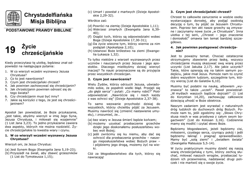 Chrystadelfiańska Misja Biblijna PODSTAWOWE PRAWDY BIBLIJNE 19 Życie chrześcijańskie Kiedy przeczytasz tę ulotkę, będziesz znał odpowiedzi na następujące pytania: 1. W co wierzyli wcześni wyznawcy Jezusa Chrystusa? 2. Co to jest nawrócenie? 3. Czym jest chrześcijański chrzest? 4. Jak powinien zachowywać się chrześcijanin? 5. Jak chrześcijanin powinien odnosić się do tego świata? 6. Czy chrześcijanin musi być inny? 7. Jakie są korzyści z tego, że jest się chrześcijaninem? Apostoł Jan powiedział, że Boże przykazanie, „jest takie, abyśmy wierzyli w imię Jego Syna, Jezusa Chrystusa, i miłowali się wzajemnie” (1 List Jana 3,23). To jedno przykazanie zawiera dwa aspekty, których nie można rozdzielić. Życie chrześcijańskie to kwestia wiary i czynu. 1. W co wierzyli wcześni wyznawcy Jezusa Chrystusa? Wierzyli oni, że Jezus Chrystus: (a) Jest Synem Boga (Ewangelia Jana 5,19-23); (b) Przyszedł na świat, aby zbawić grzeszników (1 List do Tymoteusza 1,15); (c) Umarł i powstał z martwych (Dzieje Apostolskie 2,29-32). Wkrótce zaś: (d) Powróci na ziemię (Dzieje Apostolskie 1,11); (e) Wskrzesi zmarłych (Ewangelia Jana 6,3940); (f) Osądzi tych, którzy są odpowiedzialni wobec Boga (Dzieje Apostolskie 17,30-31); (g) Da życie wieczne tym, którzy wiernie za nim podążali (Apokalipsa 2,10); (h) Ustanowi Boże królestwo na ziemi (Ewangelia Łukasza 1,32). To tylko niektóre z wierzeń wyznawanych przez uczniów i nauczanych przez Jezusa i jego apostołów. Dlaczego mielibyśmy dzisiaj wierzyć inaczej? Te nauki przeznaczone są do przyjęcia przez wszystkich chrześcijan. 2. Czym jest nawrócenie? Wielu Żydów, którzy odrzucili Jezusa, uświadomiło sobie, że popełnili wielki błąd. Przejęli się „do głębi serca” i pytali: „Co mamy robić?” Piotr odpowiedział: „Nawróćcie się i niech każdy z was ochrzci się” (Dzieje Apostolskie 2,37-38). To samo wezwanie przychodzi dzisiaj do wszystkich, którzy chcieliby pójść za Jezusem. Musimy nawrócić się (zmienić nastawienie umysłu), i zrozumieć, że… (a) bez wiary w Jezusa śmierć będzie końcem; (b) możemy uzyskać przebaczenie grzechów dzięki jego doskonałemu posłuszeństwu wobec woli Bożej; (c) jeśli zwrócimy się ku niemu, aby dać się ochrzcić dla przebaczenia grzechów – naszego nieposłuszeństwa wobec Bożych praw – i pójdziemy jego drogą, możemy żyć na wieki. Cóż za błogosławieństwo dla tych, którzy się nawracają! 3. Czym jest chrześcijański chrzest? Chrzest to całkowite zanurzenie w wodzie osoby wystarczająco dorosłej, aby podjąć osobistą decyzję o tym, by pójść za Jezusem Chrystusem. Poprzez ten akt nasze grzechy są zmywane i zaczynamy nowe życie „w Chrystusie”. Inna ulotka z tej serii, „Chrzest – jego znaczenie i doniosłość” omawia ten temat bardziej szczegółowo. 4. Jak powinien postępować chrześcijanin? Jest to poważny temat. Chociaż ostatecznie otrzymujemy zbawienie przez łaskę, wszyscy chrześcijanie muszą okazywać swą wiarę przez uczynki (List Jakuba 2,17). Ale jakie uczynki? Takie, które opierają się na takim samym podejściu, jakie miał Jezus. Pomoże nam to czynić dobro wszystkim ludziom, szczególnie tym, którzy wierzą (List do Galatów 6,10). Musimy być podatni na naukę, albowiem „wyznawca” to także „uczeń”. Paweł powiedział: „W myślach waszych bądźcie dojrzali!" (1 List do Koryntian 14,20), zachowując całkowicie dziecięcą ufność w Boże obietnice. Naszym zadaniem jest wyrastać z naturalnych dróg ludzkich do duchowych dróg Bożych. Pomoże nam to, jeśli zgodzimy się: „Słowo Chrystusa niech w was przebywa z całym swym bogactwem” (List do Kolosan 3,16). Codziennie mamy się modlić i czytać słowo Boże. Będziemy błogosławieni, jeżeli będziemy cisi, miłosierni, czystego serca, czyniący pokój i jeśli będziemy łaknąć i pragnąć sprawiedliwości. Mamy być „solą ziemi” i „światłem świata” (Ewangelia Mateusza 5,5-14). W życiu praktycznym musimy dzielić się naszą wiarą chrześcijańską z tymi, którzy zechcą słuchać, miłować naszych wrogów, przebaczać ludziom ich przewinienia, nadstawiać drugi policzek i nie martwić się o swoje życie. Podobnie jak Jezus, mamy żyć według najwyższych standardów moralnych i etycznych. Dlatego nie będziemy służyć dwóm panom – Bogu i temu oszalałemu na punkcie pieniędzy światu. Nie będziemy popełniać cudzołóstwa, ani nawet nie będziemy się nad tym zastanawiać. Chrześcijanin musi zawsze „starać się naprzód o królestwo i o Jego sprawiedliwość” (Ewangelia Mateusza 6,33). Jeżeli będziemy wypełniać te przykazania Jezusowe, to „owoc obfity przyniesiemy”, i tak staniemy się jego uczniami (Ewangelia Jana 15,8). Jeśli jednak zostanie poproszony o coś, co stoi w sprzeczności z prawami Bożymi, będzie prędzej posłuszny Bogu aniżeli człowiekowi (Dzieje Apostolskie 4,19-20; 5,28-29). Chrześcijanie nie będą więc aktywni w polityce, bo ich prawdziwym i przyszłym królem jest Chrystus. Bóg „według swojej woli postępuje z wojskiem niebieskim i z mieszkańcami ziemi” (Księga Daniela 4,32 BW). Zbliża się dzień, kiedy: „Nastało nad światem królowanie Pana naszego i Jego Pomazańca i będzie królować na wieki wieków. (Apokalipsa 11,15). Oto są wysokie ideały, do których powołany jest chrześcijanin. Czasami będziemy zawodzić, bo nie zostaliśmy jeszcze uczynieni doskonałymi. Możemy dziękować Bogu za to, że kiedy grzeszymy, Jezus, nasz pośrednik, rozumie nasze słabości. Był on „doświadczony we wszystkim na nasze podobieństwo, z wyjątkiem grzechu” (List do Hebrajczyków 4,15). Jezus nie pozwolił Piotrowi bronić go mieczem. Powiedział: „Wszyscy, którzy za miecz chwytają, od miecza giną”. Ponieważ wymaga się od chrześcijan, by żyli w pokoju, nie będą oni walczyć pod dyktatem ludzi. Oni wy