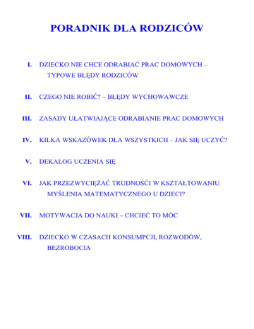 PORADNIK DLA RODZICÓW I. DZIECKO NIE CHCE ODRABIAĆ PRAC DOMOWYCH – TYPOWE BŁĘDY RODZICÓW II. CZEGO NIE ROBIĆ? – BŁĘDY WYCHOWAWCZE III. ZASADY UŁATWIAJĄCE ODRABIANIE PRAC DOMOWYCH IV. KILKA WSKAZÓWEK DLA WSZYSTKICH – JAK SIĘ UCZYĆ? V. VI. DEKALOG UCZENIA SIĘ JAK PRZEZWYCIĘŻAĆ TRUDNOŚĆI W KSZTAŁTOWANIU MYŚLENIA MATEMATYCZNEGO U DZIECI? VII. VIII. MOTYWACJA DO NAUKI – CHCIEĆ TO MÓC DZIECKO W CZASACH KONSUMPCJI, ROZWODÓW, BEZROBOCIA I. DZIECKO NIE CHCE ODRABIAĆ PRAC DOMOWYCH “Moje dziecko nie chce się uczyć, co mam robić?!” TYPOWE BŁĘDY, KTÓRE POPEŁNIAJĄ RODZICE Nadmierna kontrola “Muszę go cały czas pilnować, gdy tylko odejdę – od razu zajmuje się czymś innym, nigdy nie pamięta co jest zadane”. Matka dzwoni do nauczycieli i kolegów, pytając o prace domowe. W ten sposób przejmuje całkowitą kontrolę, pozbawia syna odpowiedzialności i motywacji do nauki. Uczenie się za dziecko Rodzice niezadowoleni z efektów nauki dziecka, sami biorą się do pracy. Sprawdzają zeszyty, przepisują od nowa fragmenty lub całe prace domowe, piszą za niego wypracowania, czytają lektury. Nawet, gdy zdają sobie sprawę, że w ten sposób krzywdzą dziecko, nie potrafią przestać. Obawiają się, że dziecko samo sobie nie poradzi. Zbyt wysokie wymagania “Moje dziecko jest strasznie nerwowe. Gdy coś mu nie wychodzi, płacze, rzuca zeszytami”. Matka sprawdza pracę córki i podkreśla na czerwono popełnione błędy. Nie chwali jej za włożony w pracę wysiłek, za ciekawą treść. Koncentrując się na błędach, odbiera dziecku satysfakcję z wykonanej pracy. Niewłaściwe motywowanie Rodzice w poczuciu własnej bezradności wobec szkolnych niepowodzeń dzieci próbują wszystkiego, żeby je zachęcić do nauki: moralizują, straszą, zawstydzają, przekupują, wyznaczają kary. Z kolei dzieci nie mając już nic do stracenia podejmują walkę z rodzicami. Brak zainteresowania nauką dziecka Rodzice zapracowani i zmęczeni nie mają czasu zajmować się sprawami szkolnymi dziecka. Uważają, że samo powinno dać sobie radę. Nie rozumieją, że dziecko potrzebuje pomocy. Dopiero, gdy dziecko wpada w duże kłopoty lub zaczyna wagarować – zaczynają szukać pomocy. W pracy z rodzicami trzeba zrealizować trzy ważne cele: zrozumienie potrzeb dziecka, które przeżywa trudności szkolne określenie roli rodzica w rozwiązywaniu tych problemów: jego zadań i zakresu odpowiedzialności uczenie umiejętności wspierania dziecka i motywowania go do nauki. Pomocne ćwiczenia: Stworzenie możliwości porozmawiania o problemach. Cofnięcie się do dzieciństwa, przypominając sobie własne trudności szkolne. Rozmowa w parach o uczuciach, które im wtedy towarzyszyły. Zastanowienie się, czego wtedy potrzebowali od swoich rodziców. Określenie, jaki procent odpowiedzialności za naukę przypada rodzicom, a jaki dziecku. Zastanowienie się, kto pakuje tornister, pamięta o lekcjach i o sprawdzianach, kto martwi się o oceny i o to, żeby na czas zdążyć do szkoły. “Rodzice oddają dziecku tyle odpowiedzialności za naukę, ile ono jest w stanie podjąć”. Każdy zastanawia się i planuje, jakie zadania postawi przed swoim dzieckiem. “Dlaczego dzieci się uczą? Co motywuje je do nauki?” Poprzez to ćwiczenie, rodzice mogą zrozumieć, że dzieci poprzez naukę realizują swoje własne cele, potrzeby i zainteresowania. Można zachęcić je do nauki, odwołując się do tego, co dla nich jest ważne. Każdy rodzic zastanawia się – jak może trafić do własnego dziecka. Wnioski dla rodziców i nauczycieli: Dostrzegaj sukcesy i starania dziecka podkreśl dobre strony wskaż nad czym mogłoby jeszcze popracować zachęcaj do samooceny (“na ile jesteś zadowolony z efektów swojej pracy?”) Okazuj życzliwe zainteresowanie zamiast wypytywać i kontrolować, słuchaj uważnie i okaż zrozumienie dla jego uczuć Gdy dziecko popadnie w kłopoty pamiętaj, że przede wszystkim to ono ma problem zamiast krytykować i oceniać, dodaj mu otuchy zachęć do wyciągnięcia własnych wniosków (“jak myślisz, dlaczego ci nie poszło na tym sprawdzianie?”” Jeżeli widzisz, że sprawy dziecka idą źle, nie wahaj się powiedzieć mu o tym, co cię martwi i czego od niego oczekujesz. Jeżeli dotychczas nadmiernie kontrolowałeś swoje dziecko – oddaj mu odpowiedzialność za naukę. Gdy dziecko o czymś zapomni, pozwól mu ponieść konsekwencje i zachęć do wyciągnięcia wniosków. Rozmawiaj z dzieckiem o jego zainteresowaniach, celach i planach. II. CZEGO NIE ROBIĆ? – ULUBIONE BŁĘDY RODZICÓW Rodzice często słyszą zarzuty, że popełniają błędy w wychowaniu, że są zbyt mało konsekwentni. Rzadko jednak udaje im się usłyszeć co właściwie robią źle. Najczęściej popełniane błędy wychowawcze to: 1) ROBIENIE WYRZUTÓW - wytykanie dziecku złego zachowania np. „Znowu nie posprzątałeś pokoju”; „Znowu denerwujesz siostrę”. Często te wyrzuty są uzupełniane przez inne dezawuujące uwagi np. : „To brzydko z twojej strony”’, „jesteś naprawdę nie do zniesienia”. Dziecko często doskonale wie, co robi źle. Zarzuty rodziców odbiera jako zrzędzenie i nie zmienia swojego zachowania. 2) PYTANIA „DLACZEGO?” - rodzice często pytają dziecko o powody niestosownego zachowania np.: „Dlaczego nie sprzątasz swojego pokoju?”, „Dlaczego siedzisz wciąż przed telewizorem?”, „Dlaczego ugryzłeś tego chłopca?”, „Dlaczego mnie nie słuchasz?” Pytania tego typu często są uzupełniane przez dezawuujące uwagi w stylu: „To naprawdę szczyt wszystkiego”’, „Działasz mi na nerwy”. Dzieci często dają na tak postawione pytanie rozsądną odpowiedź: „bo ja tak chcę” albo „nie wiem”. Jest mało prawdopodobne, że takie pytanie skłoni dziecko do rozmowy albo do przemyśleń. Za pytaniem rodzica kryje się często złość i bezradność. Dziecko z powodu złości czu