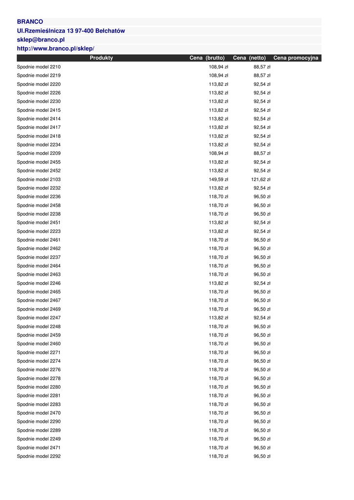 BRANCO Ul.Rzemieślnicza 13 97-400 Bełchatów [email protected] http://www.branco.pl/sklep/ Produkty Cena (brutto) Cena (netto) Spodnie model 2210 108,94 zł 88,57 zł Spodnie model 2219 108,94 zł 88,57 zł Spodnie model 2220 113,82 zł 92,54 zł Spodnie model 2226 113,82 zł 92,54 zł Spodnie model 2230 113,82 zł 92,54 zł Spodnie model 2415 113,82 zł 92,54 zł Spodnie model 2414 113,82 zł 92,54 zł Spodnie model 2417 113,82 zł 92,54 zł Spodnie model 2418 113,82 zł 92,54 zł Spodnie model 2234 113,82 zł 92,54 zł Spodnie model 2209 108,94 zł 88,57 zł Spodnie model 2455 113,82 zł 92,54 zł Spodnie model 2452 113,82 zł 92,54 zł Spodnie model 2103 149,59 zł 121,62 zł Spodnie model 2232 113,82 zł 92,54 zł Spodnie model 2236 118,70 zł 96,50 zł Spodnie model 2458 118,70 zł 96,50 zł Spodnie model 2238 118,70 zł 96,50 zł Spodnie model 2451 113,82 zł 92,54 zł Spodnie model 2223 113,82 zł 92,54 zł Spodnie model 2461 118,70 zł 96,50 zł Spodnie model 2462 118,70 zł 96,50 zł Spodnie model 2237 118,70 zł 96,50 zł Spodnie model 2464 118,70 zł 96,50 zł Spodnie model 2463 118,70 zł 96,50 zł Spodnie model 2246 113,82 zł 92,54 zł Spodnie model 2465 118,70 zł 96,50 zł Spodnie model 2467 118,70 zł 96,50 zł Spodnie model 2469 118,70 zł 96,50 zł Spodnie model 2247 113,82 zł 92,54 zł Spodnie model 2248 118,70 zł 96,50 zł Spodnie model 2459 118,70 zł 96,50 zł Spodnie model 2460 118,70 zł 96,50 zł Spodnie model 2271 118,70 zł 96,50 zł Spodnie model 2274 118,70 zł 96,50 zł Spodnie model 2276 118,70 zł 96,50 zł Spodnie model 2278 118,70 zł 96,50 zł Spodnie model 2280 118,70 zł 96,50 zł Spodnie model 2281 118,70 zł 96,50 zł Spodnie model 2283 118,70 zł 96,50 zł Spodnie model 2470 118,70 zł 96,50 zł Spodnie model 2290 118,70 zł 96,50 zł Spodnie model 2289 118,70 zł 96,50 zł Spodnie model 2249 118,70 zł 96,50 zł Spodnie model 2471 118,70 zł 96,50 zł Spodnie model 2292 118,70 zł 96,50 zł Cena promocyjna Spodnie model 2293 118,70 zł 96,50 zł Spodnie model 2294 108,94 zł 88,57 zł Spodnie model 2195 121,95 zł 99,15 zł Spodnie model 2472 118,70 zł 96,50 zł Spodnie model 2473 118,70 zł 96,50 zł Spodnie model 2474 118,70 zł 96,50 zł Spodnie model 2475 118,70 zł 96,50 zł Spodnie model 2434 113,82 zł 92,54 zł Spodnie model 2435 113,82 zł 92,54 zł Spodnie model 2196 121,95 zł 99,15 zł