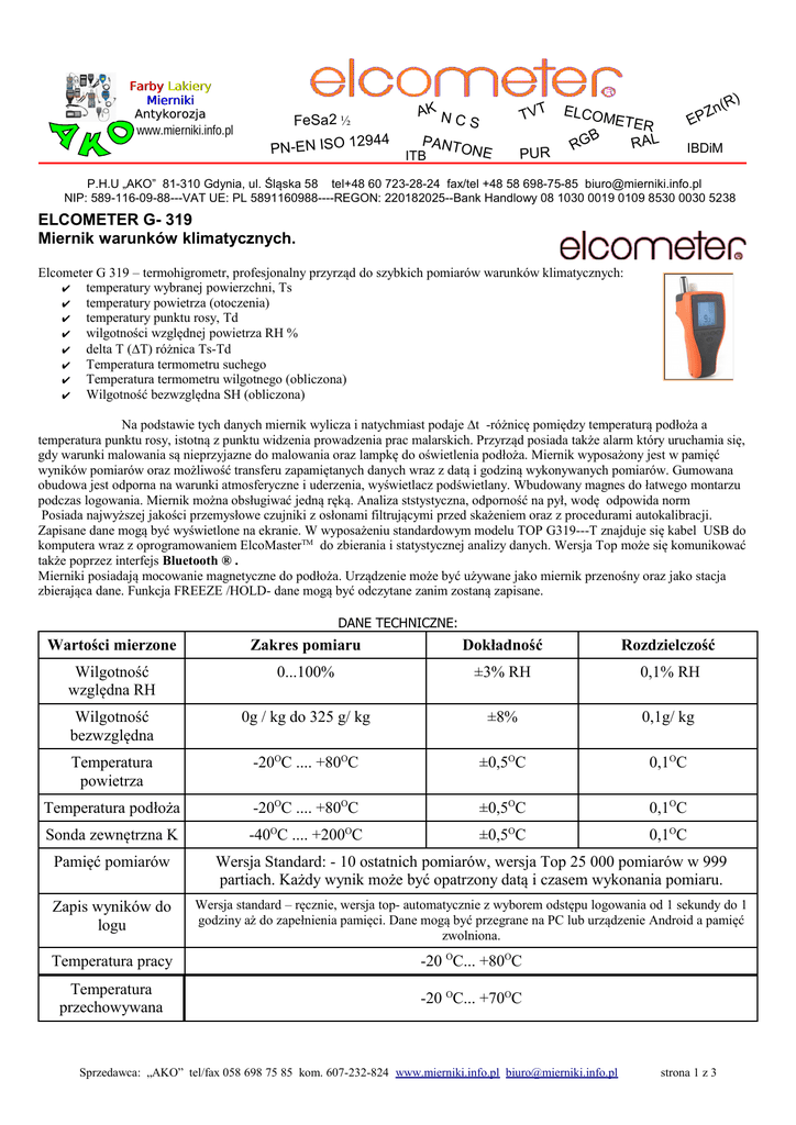Farby Lakiery Mierniki Antykorozja www.mierniki.info.pl FeSa2 ½ 944 PN-EN ISO 12 AK N T VT CS PANT ONE ITB PUR ELCOM ET ER B RAL RG Z EP n(R ) IBDiM P.H.U „AKO” 81-310 Gdynia, ul. Śląska 58 tel+48 60 723-28-24 fax/tel +48 58 698-75-85 [email protected] NIP: 589-116-09-88---VAT UE: PL 5891160988----REGON: 220182025--Bank Handlowy 08 1030 0019 0109 8530 0030 5238 ELCOMETER G- 319 Miernik warunków klimatycznych. Elcometer G 319 – termohigrometr, profesjonalny przyrząd do szybkich pomiarów warunków klimatycznych: ✔ temperatury wybranej powierzchni, Ts ✔ temperatury powietrza (otoczenia) ✔ temperatury punktu rosy, Td ✔ wilgotności względnej powietrza RH % ✔ delta T (T) różnica Ts-Td ✔ Temperatura termometru suchego ✔ Temperatura termometru wilgotnego (obliczona) ✔ Wilgotność bezwzględna SH (obliczona) Na podstawie tych danych miernik wylicza i natychmiast podaje ∆t -różnicę pomiędzy temperaturą podłoża a temperatura punktu rosy, istotną z punktu widzenia prowadzenia prac malarskich. Przyrząd posiada także alarm który uruchamia się, gdy warunki malowania są nieprzyjazne do malowania oraz lampkę do oświetlenia podłoża. Miernik wyposażony jest w pamięć wyników pomiarów oraz możliwość transferu zapamiętanych danych wraz z datą i godziną wykonywanych pomiarów. Gumowana obudowa jest odporna na warunki atmosferyczne i uderzenia, wyświetlacz podświetlany. Wbudowany magnes do łatwego montarzu podczas logowania. Miernik można obsługiwać jedną ręką. Analiza ststystyczna, odporność na pył, wodę odpowida norm Posiada najwyższej jakości przemysłowe czujniki z osłonami filtrującymi przed skażeniem oraz z procedurami autokalibracji. Zapisane dane mogą być wyświetlone na ekranie. W wyposażeniu standardowym modelu TOP G319---T znajduje się kabel USB do komputera wraz z oprogramowaniem ElcoMasterTM do zbierania i statystycznej analizy danych. Wersja Top może się komunikować także poprzez interfejs Bluetooth ® . Mierniki posiadają mocowanie magnetyczne do podłoża. Urządzenie może być używane jako miernik przenośny oraz jako stacja zbierająca dane. Funkcja FREEZE /HOLD- dane mogą być odczytane zanim zostaną zapisane. DANE TECHNICZNE: Wartości mierzone Zakres pomiaru Dokładność Rozdzielczość Wilgotność względna RH 0...100% ±3% RH 0,1% RH Wilgotność bezwzględna 0g / kg do 325 g/ kg ±8% 0,1g/ kg Temperatura powietrza -20OC .... +80OC ±0,5OC 0,1OC Temperatura podłoża -20OC .... +80OC ±0,5OC 0,1OC Sonda zewnętrzna K -40OC .... +200OC ±0,5OC 0,1OC Pamięć pomiarów Wersja Standard: - 10 ostatnich pomiarów, wersja Top 25 000 pomiarów w 999 partiach. Każdy wynik może być opatrzony datą i czasem wykonania pomiaru. Zapis wyników do logu Wersja standard – ręcznie, wersja top- automatycznie z wyborem odstępu logowania od 1 sekundy do 1 godziny aż do zapełnienia pamięci. Dane mogą być przegrane na PC lub urządzenie Android a pamięć zwolniona. Temperatura pracy -20 OC... +80OC Temperatura przechowywana -20 OC... +70OC Sprzedawca: „AKO” tel/fax 058 698 75 85 kom. 607-232-824 www.mierniki.info.pl [email protected] strona 1 z 3 Waga 300 g Zasilanie 3x AA, tryb ręczny >40 godzin, praca w trybie rejestracji automatycznej >200 dni (typowo 400 dni jeden odczyt / 10 minut) Spełniane normy Komunikacja Zakres dostawy BS 7079-B4, IMO MSC.215(82), IMO MSC.244(83), ISO 8502-4, US Navy NSI 009-32, US Navy PPI 63101-000 Wersja Top może się komunikować poprzez interfejs bluetooth lub USB. Elcometer 319/2 Standard: miernik, futerał, pasek, baterie, certyfikat kalibracji oraz instrukcja obsługi Elcometer 319/2 TOP: miernik, magnetyczny czujnik temperatury podłoża, klucz, kabel USB wraz z oprogramowaniem ElcoMasterTM Software ElcoMasterTM Mobile Software, futerał, pasek, baterie, certyfikat kalibracji oraz instrukcja obsługi. Sonda do pomiaru temperatury cieczy (T9996390-) Sonda magnetyczna do pomiaru temperatury podłoża (T31920162) Wyposażenie zapasowe i dodatkowe Futerał T99921192 Kabel USB T99921325 Pasek T99916063 MODELE I KODY Elcometer 319 Standard G319---S Elcometer 319 TOP G319---T Sprzedawca: „AKO” tel/fax 058 698 75 85 kom. 607-232-824 www.mierniki.info.pl [email protected] strona 2 z 3 CECHA Granice dla mierzonych parametrów Wskaźnik mierzonych parametrów Duży wyświetlacz z czytelnym menu Wybór języka menu (m.in. polski) Wbudowany magnes pomocowania na podłożu ferromagnetycznym Analiza statystyczna wyników Przeglądanie poszczególnych wyników Data i czas wykonania pomiaru Przeglądanie 10 wyników pamięci Pojemna pamięć; do 25 000 wyników Automatyczne zbieranie danych z wybraną częstotliwością Opóźniony start przy pracy automatycznej Transfer danych do PC przez USB lub Bluetooth Oprogramowanie ElcoMaster Wymiana baterii: - - TAK TAK TAK TAK TAK TAK TAK Położenie gniazd i czujników urządzenia: Czujnik temperatury Podłoża Tp (Ts) + STANDARD TOP Czujnik temperatury otoczenia To oraz wilgotności RH + Załączanie urządzenia Gniazdo USB pod gumową zaślepką Czujnik temperatury otoczenia To oraz wilgotności RH Czujnik temperatury Podłoża Tp (Ts) Złącze sondy dodatkowej pod gumową zaślepką Sprzedawca: „AKO” tel/fax 058 698 75 85 kom. 607-232-824 www.mierniki.info.pl [email protected] strona 3 z 3