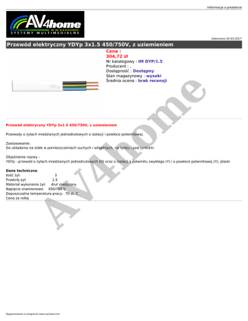 Informacje o produkcie Utworzono 02-03-2017 Przewód elektryczny YDYp 3x1.5 450/750V, z uziemieniem Cena : 304,72 zł om e Nr katalogowy : IM DYP/1.5 Producent : . Dostępność : Dostępny Stan magazynowy : wysoki Średnia ocena : brak recenzji Przewód elektryczny YDYp 3x1.5 450/750V, z uziemieniem Przewody o żyłach miedzianych jednodrutowych o izolacji i powłoce polwinitowej. 4h Zastosowanie: Do układania na stałe w pomieszczeniach suchych i wilgotnych, na tynku i pod tynkiem Objaśnienie nazwy : YDYp - przewód o żyłach miedzianych jednodrutowych (D) oraz o izolacji z polwinitu zwykłego (Y) i o powłoce polwinitowej (Y), płaski AV Dane techniczne Ilość żył: 3 Przekrój żył: 1.5 Materiał wykonania żył: drut miedziany Napięcie znamionowe: 450/750 V Dopuszczalna temperatura pracy: 70 st. C Cena za rolkę Wygenerowano w programie www.oscGold.com