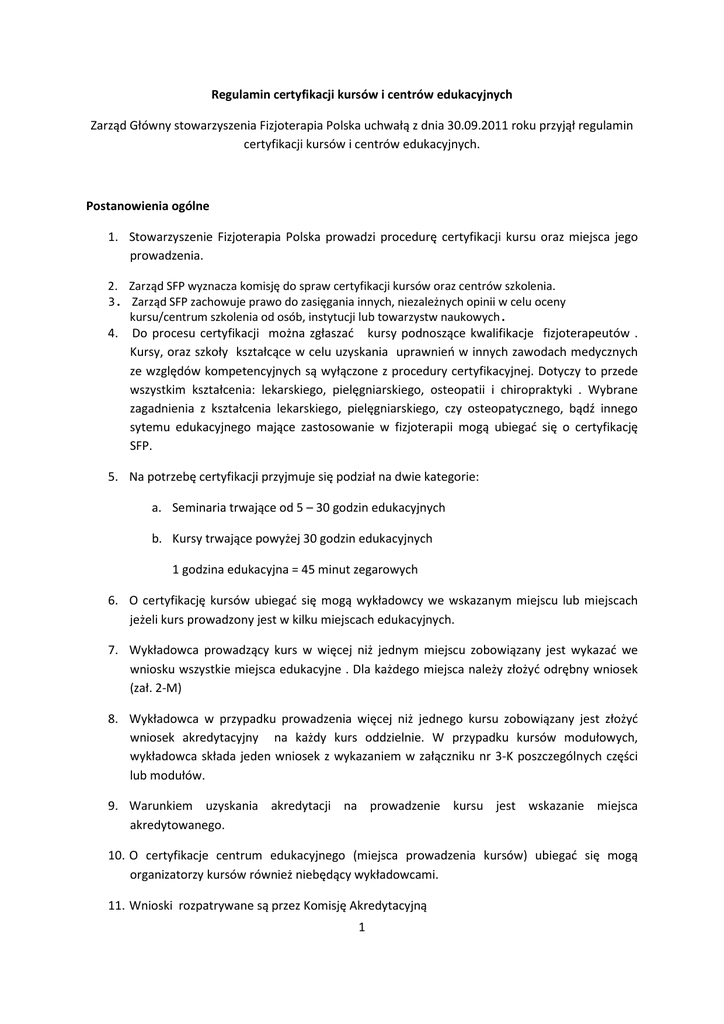 Regulamin certyfikacji kursów i centrów edukacyjnych Zarząd Główny stowarzyszenia Fizjoterapia Polska uchwałą z dnia 30.09.2011 roku przyjął regulamin certyfikacji kursów i centrów edukacyjnych. Postanowienia ogólne 1. Stowarzyszenie Fizjoterapia Polska prowadzi procedurę certyfikacji kursu oraz miejsca jego prowadzenia. 2. Zarząd SFP wyznacza komisję do spraw certyfikacji kursów oraz centrów szkolenia. 3. Zarząd SFP zachowuje prawo do zasięgania innych, niezależnych opinii w celu oceny kursu/centrum szkolenia od osób, instytucji lub towarzystw naukowych. 4. Do procesu certyfikacji można zgłaszać kursy podnoszące kwalifikacje fizjoterapeutów . Kursy, oraz szkoły kształcące w celu uzyskania uprawnień w innych zawodach medycznych ze względów kompetencyjnych są wyłączone z procedury certyfikacyjnej. Dotyczy to przede wszystkim kształcenia: lekarskiego, pielęgniarskiego, osteopatii i chiropraktyki . Wybrane zagadnienia z kształcenia lekarskiego, pielęgniarskiego, czy osteopatycznego, bądź innego sytemu edukacyjnego mające zastosowanie w fizjoterapii mogą ubiegać się o certyfikację SFP. 5. Na potrzebę certyfikacji przyjmuje się podział na dwie kategorie: a. Seminaria trwające od 5 – 30 godzin edukacyjnych b. Kursy trwające powyżej 30 godzin edukacyjnych 1 godzina edukacyjna = 45 minut zegarowych 6. O certyfikację kursów ubiegać się mogą wykładowcy we wskazanym miejscu lub miejscach jeżeli kurs prowadzony jest w kilku miejscach edukacyjnych. 7. Wykładowca prowadzący kurs w więcej niż jednym miejscu zobowiązany jest wykazać we wniosku wszystkie miejsca edukacyjne . Dla każdego miejsca należy złożyć odrębny wniosek (zał. 2-M) 8. Wykładowca w przypadku prowadzenia więcej niż jednego kursu zobowiązany jest złożyć wniosek akredytacyjny na każdy kurs oddzielnie. W przypadku kursów modułowych, wykładowca składa jeden wniosek z wykazaniem w załączniku nr 3-K poszczególnych części lub modułów. 9. Warunkiem uzyskania akredytacji na prowadzenie kursu jest wskazanie miejsca akredytowanego. 10. O certyfikacje centrum edukacyjnego (miejsca prowadzenia kursów) ubiegać się mogą organizatorzy kursów również niebędący wykładowcami. 11. Wnioski rozpatrywane są przez Komisję Akredytacyjną 1 12. Komisja rozpatruje wyłącznie prawidłowo złożone wnioski zawierające wszystkie wymagane dokumenty. Komplet wymaganych dokumentów powinien być złożony w formie pisemnej dostarczonej za pośrednictwem poczty lub kuriera. Do załączonej dokumentacji należy załączyć nośnik elektroniczny z nagraną kopią wniosku. Wszystkie strony należy odręcznie ponumerować i parafować. 13. Wykaz załączników i dokumentów dla wykładowców a. Załącznik 1. Oświadczenie b. Załącznik 2-K Informacje o instruktorze c. Załącznik 3-K Informacje o kursie d. Skrypt kursu e. Kopia potwierdzająca wpłatę za rozpatrzenie wniosku akredytacyjnego 14. Wykaz załączników dla organizatorów kursów a. Załącznik 1. Oświadczenie b. Załącznik 2-M Informacje o miejscu c. Dokumentacja zdjęciowa d. Kopia potwierdzająca wpłatę za rozpatrzenie wniosku akredytacyjnego 15. złożenie wniosku jest płatne a w przypadku decyzji negatywnej Komisji, wpłacona kwota nie podlega zwrotowi. 16. Komisja rozpatruje wniosek w terminie nieprzekraczającym 60 dni od daty prawidłowego złożenia i wydaję pisemną decyzję do wiadomości zainteresowanego oraz zamieszcza ją na stronie internetowej w strefie kursy i centra szkoleniowe . 17. Akredytacja szkolenia poddawana jest ocenie punktowej: a. Wartość minimalna punktów przy której przyznaje się akredytacje wynosi 51% wartości maksymalnej punktów. b. Warunkiem uzyskania akredytacji jest uzyskanie w każdej części punktowanej wniosku (załącznikach)przynajmniej wartości minimalną punktów. Nieuzyskanie choćby w jednej części wniosku minimalnej wartości punktowych skutkuje odrzuceniem wniosku również w sytuacji, gdy wartość ogólna punktów jest wyższa niż 50 %. 18. Komisja przyznaje akredytację na czas określony 5 lat. 19. Po wygaśnięciu okresu akredytacji wnioskodawca może ubiegać się o przedłużenie na zasadach ogólnych. 2 20. Komisja zastrzega sobie prawo kontroli wykładowcy w trakcie prowadzenia kursu 21. Komisja zastrzega sobie prawo przeprowadzenia wizji lokalnej celem konfrontacji przed wydaniem ostatecznej decyzji akredytacyjnej 22. Nie wyrażenie zgody na przeprowadzenie kontroli wniosku. równoznaczne jest z odrzuceniem 23. Po przyznaniu akredytacji Komisja ma prawo do kontroli centrów edukacyjnych oraz wykładowców w trakcie prowadzenia kursu. W trakcie stwierdzenia nieprawidłowości Komisja ma prawo do czasowego zawieszenia akredytacji wyznaczając termin jej usunięcia. W przypadku nie zastosowania się do zaleceń , lub gdy nieprawidłowości są rażące Komisja ma prawo odebrać przyznaną liczbę punktów włącznie z odebraniem akredytacji. 24. W sprawach nieuregulowanych niniejszym regulaminem rozstrzygane są indywidualnie. 25. Od decyzji Komisji przysługuje prawo odwołania do Komisji Rewizyjnej Fizjoterapia Polska. 3 stowarzyszenia