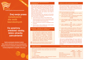 S Sie rp ień 20 07 Znaj swoje prawa: świadczenia dla osób bezrobotnych Irlandzkie Narodowe Stowarzyszenie Bezobotnych Co powinny wiedzieć osoby, które utraciły zatrudnienie System przyznawania świadczeń osobom, które utraciły zatrudnienie może być skomplikowany. Niniejsza broszura przedstawia podstawowe informacje na temat postępowania w przypadku utraty pracy. Świadczenia dla osób bezrobotnych – wprowadzenie Osoby, które straciły pracę, powinny natychmiast skontaktować się z lokalnym ośrodkiem opieki społecznej (ang. Social Welfare Office), gdzie mogą starać się o zasiłek dla osób poszukujących pracy (ang. Jobseekerʼs Benefis – JB) lub zapomogę dla osób poszukujących pracy (ang. Jobseekerʼs Allowance – JA). Powiadomienie w/w urzędu jest bardzo istotne, gdyż jakakolwiek zwłoka może prowadzić do utraty wypłacanego świadczenia. Adresy ośrodków opieki społecznej można znaleźć w zielonej części książki telefonicznej. Zasiłek dla osób poszukujących pracy i zapomoga dla osób poszukujących pracy to dwa główne rodzaje świadczeń wypłacanych osobom bezrobotnym. Aby starać się o w/w świadczenia: Musisz posiadać status rezydenta na terenie Republiki Irlandii, Musisz mieć poniżej 66 lat i ukończone 16 lat aby starać się o zasiłek dla osób poszukujących pracy oraz mieć ukończone 18 lat, aby ubiegać się o zapomogę dla osób poszukujących pracy, Musisz nie pracować przez co najmniej 3 z 6 następujących po sobie dni roboczych, Musisz być gotowy i zdolny do podjęcia pracy w pełnym wymiarze godzin oraz aktywnie poszukiwać zatrudnienia. Gotowość i zdolność do podjęcia pracy oraz aktywne poszukiwanie zatrudnienia W celu uzyskania zasiłku lub zapomogi dla osób poszukujących pracy i aby otrzymywać je regularnie, musisz szukać zatrudnienia i być gotowym na podjęcie pracy w pełnym wymiarze godzin. Rozporządzenie o Aktywnym Poszukiwaniu Zatrudnienia mówi o konieczności podjęcia zatrudnienia, edukacji oraz/lub szkolenia, o ile ich warunki są do zaakceptowania. Każdą sensowną ofertę pracy należy przemyśleć uwzględniając swoje umiejętności, kwalifikacje oraz posiadane doświadczenie (patrz: „Lista spraw” na odwrocie). Jeśli uważasz, że jesteś niesprawiedliwie traktowany skontaktuj się z INOU lub lokalnym Centrum Pomocy (ang. Resorce Centre) Wypłata świadczeń Zasiłek dla osób poszukujących pracy lub zapomoga dla osób poszukujących pracy są wypłacane tygodniowo. Możesz wybrać sposób w jaki chcesz otrzymywać świadczenia: w urzędzie pocztowym, czekiem na konto bankowe. W przypadku jakichkolwiek problemów z wypłatą otrzymywanych świadczeń, skontaktuj się z INOU lub lokalnym Centrum Pomocy. Zasiłek dla osób poszukujących pracy Zasiłek dla Osób Poszukujących Pracy jest przyznawany na podstawie ilosci odprowa-dzonych składek na ubezpieczenie społeczne (ang. PayRelated Social Insurance – PRSI). Składki na PRSI są opłacane (w przypadku osób pracujących), lub kredytowane (w przypadku osób pobierających świadczenia dla osób poszukujących pracy). Zasiłek dla osób poszukujących pracy przysługuje: osobom, które straciły pracę (co najmniej jeden dzień w tygodniu), co wiąże się dla nich z utratą dochodu, osobom, które płaciły składki na ubezpieczenie społeczne (PRSI) przez 52 tygodnie od momentu podjęcia zatrudnienia, oraz albo osobom posiadającym opłacone lub kredytowane składki na ubezpieczenie społeczne (PRSI) przez 39 tygodnie w danym roku podatkowym*, albo osobom posiadającym opłacone składki na ubezpieczenie społeczne (PRSI) przez 26 tygodni w danym roku podatkowym* oraz opłacone składki na Ubezpieczenie Społeczne (PRSI) przez 26 tygodni w roku podatkowym poprzedzającym dany rok podatkowy*. Istnieje możliwość ponownego ubiegania się o zasiłek dla osób poszuku jących pracy, o ile posiadasz 13 opłaconych składek od czasu ostatniej wypłaty poprzedniego zasiłku. Suma uzyskiwanego zasiłku z tego tytułu będzie zależała od Twojego średniego tygodniowego dochodu brutto. Wypłata pełnego zasiłku przysługuje osobom, których tygodniowy dochód nie przekroczył 150€ w danym roku podatkowym/składkowym*. *Termin „dany rok podatkowy/składkowy” odnosi się do składek opłaconych dwa lata przed rokiem podatkowym, w którym starasz się o zasiłek. Na przykład jeśli starasz się o zasiłek dla osób poszukujących pracy w 2007 roku, to pod uwagę będzie brana ilość składek, które opłaciłeś w 2005 roku i na tej podstawie zostanie wypłacona Ci określona suma zasiłku. — Maksymalne stawki zasiłkow na rok 2007 — Zapomoga dla osob poszukujacych pracy Stawka na osobę €185.80 Zasilek dla osób poszukującychpracy €185.80 Stawka dla wykwalifikowanej osoby dorosłej €123.30 €123.30 Zasiłek na dziecko na utrzyman € 22.00 € 22.00 Zasiłek na dziecko będące na częściowym utrzymaniu € 11.00 € 11.00 Zapomoga dla osób poszukujących pracy W przypadku braku wystarczającej ilości składek na ubezpieczenie społeczne (PRSI), aby ubiegać się o zasiłek dla osób poszukujących pracy, można starać się o zapomogę dla osób poszukujących pracy, pod warunkiem: spełnienia kryterium majątkowego oraz spełnienia kryterium stałego zamieszkania (ang. Habitual Residence Rule) Kryterium majątkowe Podczas sprawdzania zasadności wniosku, pod uwagę brane są następujące czynniki: Dochód pieniężny Posiadane nieruchomości Posiadany kapitał Uzyskiwana pomoc Prawie cały Twój dochód pieniężny będzie brany pod uwagę podczas sprawdzania Twojego wniosku. Wyjątek stanowi zasiłek na dziecko lub też dodatek na opłatę czynszu lub spłatę kredytu hipotecznego. Istnieje również możliwości uzyskiwania określonego dochodu bez utraty prawa do zasiłku, który określa się jako „dopuszczalny limit dochodowy” (ang. Income Disregard). Wartość jakiejkolwiek nieruchomości , którą pos
