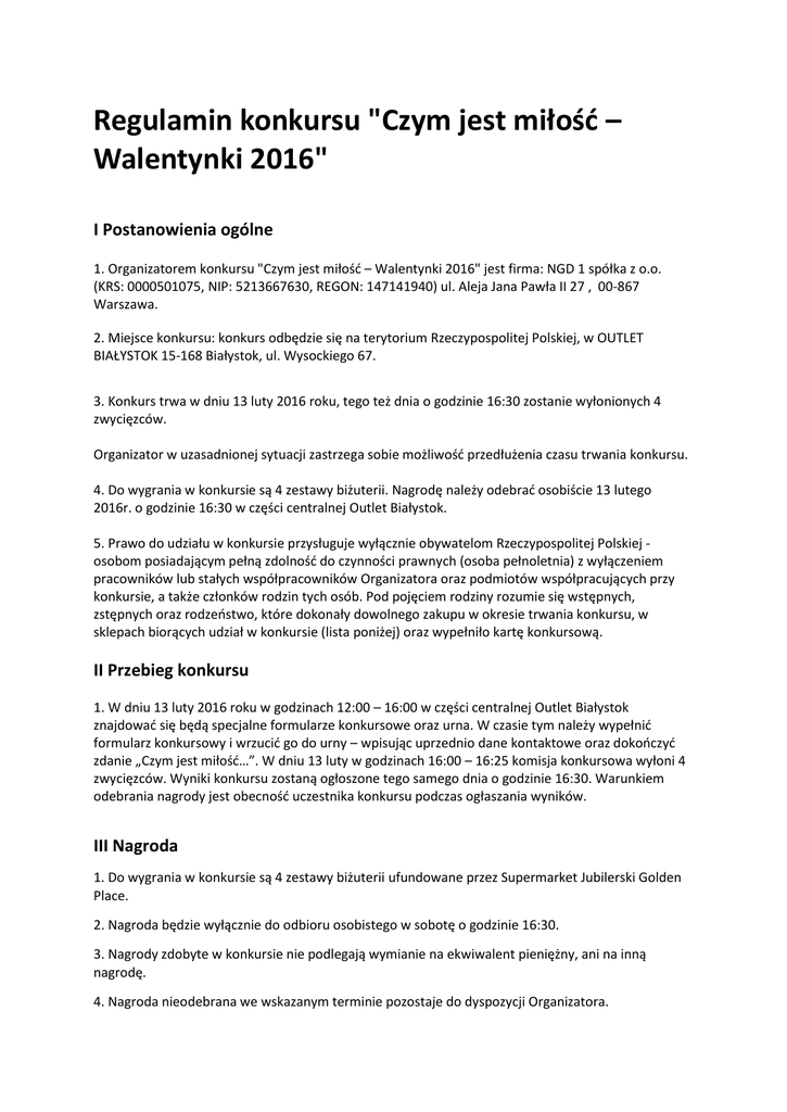 Regulamin konkursu "Czym jest miłość – Walentynki 2016" I Postanowienia ogólne 1. Organizatorem konkursu "Czym jest miłość – Walentynki 2016" jest firma: NGD 1 spółka z o.o. (KRS: 0000501075, NIP: 5213667630, REGON: 147141940) ul. Aleja Jana Pawła II 27 , 00-867 Warszawa. 2. Miejsce konkursu: konkurs odbędzie się na terytorium Rzeczypospolitej Polskiej, w OUTLET BIAŁYSTOK 15-168 Białystok, ul. Wysockiego 67. 3. Konkurs trwa w dniu 13 luty 2016 roku, tego też dnia o godzinie 16:30 zostanie wyłonionych 4 zwycięzców. Organizator w uzasadnionej sytuacji zastrzega sobie możliwość przedłużenia czasu trwania konkursu. 4. Do wygrania w konkursie są 4 zestawy biżuterii. Nagrodę należy odebrać osobiście 13 lutego 2016r. o godzinie 16:30 w części centralnej Outlet Białystok. 5. Prawo do udziału w konkursie przysługuje wyłącznie obywatelom Rzeczypospolitej Polskiej osobom posiadającym pełną zdolność do czynności prawnych (osoba pełnoletnia) z wyłączeniem pracowników lub stałych współpracowników Organizatora oraz podmiotów współpracujących przy konkursie, a także członków rodzin tych osób. Pod pojęciem rodziny rozumie się wstępnych, zstępnych oraz rodzeństwo, które dokonały dowolnego zakupu w okresie trwania konkursu, w sklepach biorących udział w konkursie (lista poniżej) oraz wypełniło kartę konkursową. II Przebieg konkursu 1. W dniu 13 luty 2016 roku w godzinach 12:00 – 16:00 w części centralnej Outlet Białystok znajdować się będą specjalne formularze konkursowe oraz urna. W czasie tym należy wypełnić formularz konkursowy i wrzucić go do urny – wpisując uprzednio dane kontaktowe oraz dokończyć zdanie „Czym jest miłość…”. W dniu 13 luty w godzinach 16:00 – 16:25 komisja konkursowa wyłoni 4 zwycięzców. Wyniki konkursu zostaną ogłoszone tego samego dnia o godzinie 16:30. Warunkiem odebrania nagrody jest obecność uczestnika konkursu podczas ogłaszania wyników. III Nagroda 1. Do wygrania w konkursie są 4 zestawy biżuterii ufundowane przez Supermarket Jubilerski Golden Place. 2. Nagroda będzie wyłącznie do odbioru osobistego w sobotę o godzinie 16:30. 3. Nagrody zdobyte w konkursie nie podlegają wymianie na ekwiwalent pieniężny, ani na inną nagrodę. 4. Nagroda nieodebrana we wskazanym terminie pozostaje do dyspozycji Organizatora. 5. Zwycięzca konkursu zostanie poinformowany o zdobyciu nagrody przez osobę prowadzącą konkurs osobiście 13 lutego 2016 roku podczas rozstrzygnięcia konkursu. 6. Zwycięzca konkursu udziela Organizatorowi prawa do publikacji swoich danych oraz wizerunku, na wszelkich polach eksploatacji. 7. Organizator nie ponosi odpowiedzialności za użytkowanie przez zwycięzcę nagrody. IV Informacja o konkursie 1. Wszelkie informacje na temat konkursu zamieszczone zostaną na stronie internetowej Outlet Białystok – www.outlet-bialystok.com. Dodatkowe informacje można uzyskać pod numerem telefonu - (+48) 85 651 64 41, od poniedziałku do piątku, w godzinach 9.00-16.00. V Postępowanie reklamacyjne 1. Wszelkie reklamacje dotyczące przebiegu konkursu powinny być sporządzone przez uczestników konkursu na piśmie i przesłane pod adres: OUTLET BIAŁYSTOK 15-168 Białystok, ul. Wysockiego 67 z dopiskiem na kopercie: "Bony za zakupy – najpiękniejsze życzenia noworoczne”. 2. Reklamacje można składać przez czas trwania konkursu, nie później jednak niż w ciągu 7 dni od ostatecznej daty rozstrzygnięcia konkursu. 3. O terminie złożenia reklamacji, tj. o wpłynięciu jej do OUTLET BIAŁYSTOK, decyduje data stempla pocztowego. Reklamacje, które wpłyną po tym terminie, nie będą rozpatrywane. 4. Do rozstrzygania reklamacji powołana jest Komisja Sprawdzająca. Decyzja Komisji w przedmiocie rozpatrzenia reklamacji jest ostateczna i wiążąca. 5. Komisja rozpatruje prawidłowo złożoną reklamację niezwłocznie, nie później jednak niż w ciągu 14 dni od daty otrzymania reklamacji. 6. Zainteresowani zostaną powiadomieni o wyniku rozpatrzenia reklamacji najpóźniej w ciągu 7 dni od daty rozpatrzenia. 7. Nie podlegają rozpatrzeniu reklamacje niezawierające danych osoby zgłaszającej oraz opisu powstałego problemu. VI Postanowienia końcowe 1. Postanowienia niniejszego regulaminu konkursu są wyłączną podstawą prowadzenia konkursu, a ich wykładnia i interpretacja należy wyłącznie do Organizatora konkursu i jest ostateczna. 2. Niniejszy regulamin konkursu jest dostępny do wglądu w siedzibie Organizatora, na stronie internetowej www.outlet-bialystok.pl a także listownie, po przesłaniu przez uczestnika zaadresowanej zwrotnie koperty wraz z uiszczoną opłatą pocztową. 3. Organizator nie ponosi odpowiedzialności za wady ukryte oraz stan techniczny przedmiotów stanowiących nagrody w konkursie. 4. Organizator jest uprawniony do zmiany postanowień niniejszego Regulaminu, o ile nie wpłynie to na pogorszenie warunków uczestnictwa w konkursie. Dotyczy to w szczególności zmian poszczególnych czynności konkursowych oraz specyfikacji nagród. W takim przypadku zobowiązany jest niezwłocznie podać informacje o tych zmianach na stronie internetowej. 5. Organizator ustanawia adres korespondencyjny związany z zapytaniami dotyczącymi konkursu: OUTLET BIAŁYSTOK 15-168 Białystok, ul. Wysockiego 67.