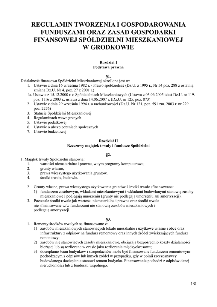 REGULAMIN TWORZENIA I GOSPODAROWANIA FUNDUSZAMI ORAZ ZASAD GOSPODARKI FINANSOWEJ SPÓŁDZIELNI MIESZKANIOWEJ W GRODKOWIE Rozdział I Podstawa prawna §1. Działalność finansowa Spółdzielni Mieszkaniowej określona jest w: 1. Ustawie z dnia 16 września 1982 r. - Prawo spółdzielcze (Dz.U. z 1995 r., Nr 54 poz. 288 z ostatnią zmianą Dz.U. Nr 4, poz. 27 z 2001 r.) la. Ustawie z 15.12.2000 r. o Spółdzielniach Mieszkaniowych (Ustawa z 03.06.2005 tekst Dz.U. nr 119. poz. 1116 z 2003 r., ustawa z dnia 14.06.2007 r. (Dz.U. nr 125, poz. 873) 2. Ustawie z dnia 29 września 1994 r. o rachunkowości (Dz.U. Nr 121, poz. 591 zm. 2003 r. nr 229 poz. 2276) 3. Statucie Spółdzielni Mieszkaniowej 4. Regulaminach wewnętrznych 5. Ustawie podatkowej 6. Ustawie o ubezpieczeniach społecznych 7. Ustawie budżetowej Rozdział II Rzeczowy majątek trwały i fundusze Spółdzielni §2. 1. Majątek trwały Spółdzielni stanowią: 1. wartości niematerialne i prawne, w tym programy komputerowe; 2. grunty własne, 3. prawa wieczystego użytkowania gruntów, 4. środki trwałe, budowle. 2. Grunty własne, prawa wieczystego użytkowania gruntów i środki trwałe sfinansowane: 1) funduszem zasobowym, wkładami mieszkaniowymi i wkładami budowlanymi stanowią zasoby mieszkaniowe i podlegają umorzeniu (grunty nie podlegają umorzeniu ani amortyzacji). 3. Pozostałe środki trwałe jak wartości niematerialne i prawne oraz środki trwałe nie sfinansowane w/w funduszami nie stanowią zasobów mieszkaniowych i podlegają amortyzacji. §3. 1. Remonty środków trwałych są finansowane z: 1) zasobów mieszkaniowych stanowiących lokale mieszkalne i użytkowe własne i obce oraz infrastruktury z odpisów na fundusz remontowy oraz innych źródeł zwiększających fundusz remontowy; 2) zasobów nie stanowiących zasoby mieszkaniowe, obciążają bezpośrednio koszty działalności bieżącej lub są rozliczane w czasie jako rozliczenia międzyokresowe; 3) docieplanie ścian budynków i stropodachów może być finansowane funduszem remontowym pochodzącym z odpisów lub innych źródeł w przypadku, gdy w opinii rzeczoznawcy budowlanego docieplanie stanowi remont budynku. Finansowanie pochodzi z odpisów danej nieruchomości lub z funduszu wspólnego. 1/8 4) W przypadku zakwalifikowania przez rzeczoznawcę robót dociepleniowych jako modernizacja, nakłady te zwiększają wartość budynku i są finansowane z funduszu zasobowego wolnych środków, funduszu wkładów mieszkaniowych i budowlanych oraz środków wpłaconych przez użytkowników lokali posiadających własność odrębną lokali w danej nieruchomości (budynku). 5) Modernizacja zasobów powiększa wartość środków trwałych i jest finansowana z funduszu wkładów mieszkaniowych, budowlanych i funduszu zasobowego obrotowego przeznaczonego na fundusz zasobowy w środkach trwałych. §4. Spółdzielnia może tworzyć i gospodarować następującymi funduszami: 1. udziałowym,. 2. Zasobowym ; 3. zaliczkowym wkładów mieszkaniowych i budowlanych; 4. wkładów mieszkaniowych na mieszkania lokatorskie (Krajowy Fundusz Mieszkaniowy) 5. wkładów budowlanych na mieszkania własnościowe (do 30.07.2007 r.). 6. fundusz przeceny i waloryzacji wkładów. 7. zmniejszenie funduszy z tytułu umorzeń zasobów mieszkaniowych; 8. fundusz remontowy. 9. Fundusz celowy Rozdział III Gospodarka funduszami i finansowanie działalności Spółdzielni §5. 1. Spółdzielnia prowadzi działalność gospodarczą na zasadach rozrachunku ekonomicznego przy zapewnieniu korzyści członkom spółdzielni. 2. Działalność statutowa Spółdzielni może obejmować: •gospodarkę zasobami mieszkaniowymi •gospodarkę funduszem remontowym •gospodarkę cieplną •rozliczenia wkładów mieszkaniowych i budowlanych •działalność inwestycyjna powiększająca mienie spółdzielni i stanowiące własność odrębną lokali oraz na najem i sprzedaż lokali •budownictwo mieszkaniowe lokatorskie finansowane z Krajowego Funduszu Mieszkaniowego •działalność wykonawstwa własnego: remontowo-konserwacyjnego, transportu, innych usług oraz sprzedaży materiałów i towarów Spółdzielnia pokrywa swoje koszty osiąganymi przychodami na zasadzie działalności bezwynikowej. Nadwyżki z całokształtu przychodów nad kosztami i odwrotnie przechodzą jako rozliczenia międzyokresowe na następny rok. §6. Działalność spółdzielni finansowana jest ze środków własnych, które mogą być uzupełnione kredytami bankowymi oraz pożyczkami do wysokości nie przekraczającej najwyższą sumę zobowiązań, jaką Spółdzielnia może zaciągnąć, oznaczonej przez Walne Zgromadzenie. §7. Spółdzielnia prowadzi działalność gospodarczą na podstawie planów gospodarczo-finansowych zatwierdzonych przez Radę Nadzorczą lub Walne Zgromadzenie. §8. FUNDUSZE ZASADNICZE 1. Fundusz udziałowy 1) Tworzy się z tytułu: Wpłat udziałów przez członków w wysokościach określonych w statucie Spółdzielni; 2) Wydatkowanie funduszu Na zwrot udziałów po ustaniu członkostwa. Udziały nie podlegają waloryzacji. 2. Fundusz zasobowy 1. Fundusz zasobowy finansuje budynki mieszkalne wraz z towarzyszącą im infrastrukturą, w części pokrytej uzyskaną przez Spółdzielnię pomocą publiczną (umorzenie części kredytu lub pożyczki). Ta część funduszu zasobowego stanowi „fundusz zasobowy w środkach trwałych”. Pozostała część funduszu stanowi „fundusz zasobowy w środkach obrotowych”. 2. Fundusz zasobowy tworzy się z następujących tytułów: - wpisowe – wnoszone przez członków w wysokości określonej w statucie, - ujawnienie środków trwałych mieszkaniowych, - wartości otrzymanych nieodpłatnie zasobów mieszkaniowych, -nadwyżka bilansowa (na podstawie uchwały Walnego Zgromadzenia ), -inne źródła. 3. Fundusz zasobowy ulega zmniejszeniu z tytułu: - umorzenia środków trwałych niepodlegających amortyzacji, jeśli umorzenie to nie obciąża wkładów 
