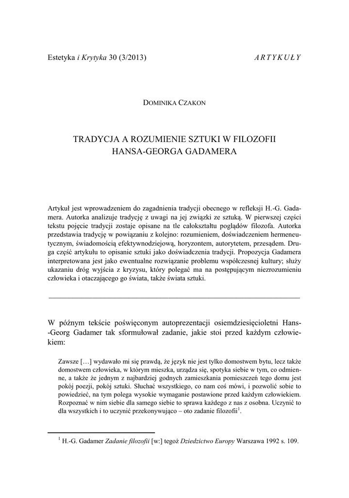 Estetyka i Krytyka 30 (3/2013) ARTYKUŁY DOMINIKA CZAKON TRADYCJA A ROZUMIENIE SZTUKI W FILOZOFII HANSA-GEORGA GADAMERA Artykuł jest wprowadzeniem do zagadnienia tradycji obecnego w refleksji H.-G. Gadamera. Autorka analizuje tradycję z uwagi na jej związki ze sztuką. W pierwszej części tekstu pojęcie tradycji zostaje opisane na tle całokształtu poglądów filozofa. Autorka przedstawia tradycję w powiązaniu z kolejno: rozumieniem, doświadczeniem hermeneutycznym, świadomością efektywnodziejową, horyzontem, autorytetem, przesądem. Druga część artykułu to opisanie sztuki jako doświadczenia tradycji. Propozycja Gadamera interpretowana jest jako ewentualne rozwiązanie problemu współczesnej kultury; służy ukazaniu dróg wyjścia z kryzysu, który polegać ma na postępującym niezrozumieniu człowieka i otaczającego go świata, także świata sztuki. _______________________________________________________________ W późnym tekście poświęconym autoprezentacji osiemdziesięcioletni Hans-Georg Gadamer tak sformułował zadanie, jakie stoi przed każdym człowiekiem: Zawsze […] wydawało mi się prawdą, że język nie jest tylko domostwem bytu, lecz także domostwem człowieka, w którym mieszka, urządza się, spotyka siebie w tym, co odmienne, a także że jednym z najbardziej godnych zamieszkania pomieszczeń tego domu jest pokój poezji, pokój sztuki. Słuchać wszystkiego, co nam coś mówi, i pozwolić sobie to powiedzieć, na tym polega wysokie wymaganie postawione przed każdym człowiekiem. Rozpoznać w nim siebie dla samego siebie to sprawa każdego z nas z osobna. Uczynić to dla wszystkich i to uczynić przekonywująco – oto zadanie filozofii1. 1 H.-G. Gadamer Zadanie filozofii [w:] tegoż Dziedzictwo Europy Warszawa 1992 s. 109. 26 Dominika Czakon __________________________________________________________________________________________________________________________________________________________________________________________________________________________________ Zgodnie z tym fragmentem, zadanie filozoficznej hermeneutyki polega na tym, aby pomagać współczesnemu człowiekowi lepiej i pełniej rozumieć samego siebie; świat, w którym żyje; innych ludzi. Jednocześnie Gadamer, podążając za Heideggerem, głosi kryzys kultury, który – najogólniej mówiąc – polega na postępującym niezrozumieniu: siebie, drugiego człowieka i świata2. Jego filozoficzny wysiłek jest więc projektem naprawczym, postulującym wyjątkowe zna3 czenie humanistyki dla całokształtu ludzkich działań . Filozof jasno i dobitnie stwierdza: „Słuchać przekazu tradycji i tkwić w tradycji – oto narzucająca się w sposób oczywisty droga prawdy, którą odnaleźć powinny nauki humanistyczne”4. Spojrzenie Gadamera skierowane jest na człowieka, który żyje w kulturze i dzięki niej może poszerzać swoją świadomość, podejmując dialog z jej przekazem zachowanym w tradycji5. Doświadczanie tradycji wzbogaca człowieka, ponieważ jest otwarciem na głos tego, co w pewien sposób jest mu obce, jako czasowo oddalone (dawne, minione), ale co wciąż może stać się na powrót współczesne i aktualne6. Należy mocno podkreślić, co to oznacza, a mianowicie, że „tym, co poznajemy historycznie, jesteśmy ostatecznie my sami” oraz – co nierozerwalnie z tym związane – że „w naukach humanistycznych […] chodzi 2 K. Rosner, opisując hermeneutykę ontologiczną, wyrażoną w pracach M. Heideggera, H.-G. Gadamera oraz P. Ricoeura, stwierdza, że „stanowi ona reakcje i odpowiedź na zarysowujący się coraz wyraźniej już w okresie dzielącym dwie wojny światowe kryzys kultury europejskiej i jej podstawowych wartości. Wraz z I wojną światową kończy się era niezachwianej wiary w wyższość kultury europejskiej nad innymi, a także w jej nieograniczone możliwości i perspektywy, wiary w ten kierunek rozwoju , któremu początek dał wiek Oświecenia: w rozum, w postęp, w możliwości opanowania przyrody, jakich dostarczają nauka i technika”. K. Rosner Hermeneutyka jako krytyka kultury Warszawa 1991 s. 8. Zob. także wypowiedź Gadamera na temat podlegania skorumpowaniu własnego rozumu [w:] H.-G. Gadamer Prawda w naukach humanistycznych [w:] tegoż Teoria, hermeneutyka, nauki humanistyczne Warszawa 2008 s. 108–109. 3 Zob. tenże Prawda w naukach... wyd. cyt. s. 657. 4 I dalej: „Również wszelka krytyka przekazu, do której dochodzimy jako historycy, służy ostatecznie temu, aby przyłączyć się do prawdziwego przekazu tradycji, w której trwamy. Uwarunkowanie nie jest zatem naruszeniem historycznego poznania, lecz momentem samej prawdy”. Tamże, s. 106. Filozof przekonuje także, że „Nauki humanistyczne są pośród wszystkich nauk czymś szczególnym przez to, że także ich pozorne bądź prawdziwe wyniki poznawcze określają bezpośrednio wszelkie ludzkie sprawy, o tyle, o ile przechodzą w ludzkie kształcenie i wychowanie […]. Ich właściwym wyróżnikiem jest właśnie to, co będąc niepewne nakłania do myślenia: nauki humanistyczne są logoi, są mową, «tylko» mową”. Tamże, s. 110. 5 Zob. K. Rosner, wyd. cyt. s. 11. 6 Zob. tamże, s. 169. Czytamy u polskiej badaczki, że „Gadamer wierzy głęboko, że obcowanie z tradycją może nas duchowo wzbogacić. Co więcej, jeżeli obcowanie z tradycją ma sens i wartość, to przede wszystkim ze względu na te szansę”. Tamże, s. 170. Tradycja a rozumienie sztuki w filozofii Hansa-Georga Gadamera 27 __________________________________________________________________________________________________________________________________________________________________________________________________________________________________ o to, aby doświadczyć w historycznym przekazie impulsu, który wyprowadza nas poza samych siebie”7. Pojęcie tradycji w sposób mniej lub bardziej bezpośredni i wyraźny obecne jest na każdym etapie hermeneutycznych rozw