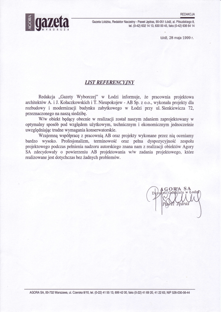 REDAKCJA - Paweł Gazeta Łódzka,Redaktor Nacze|ny Jędras, 90-051 ŁódŹ'a|.Pitsudskiego 8, tel.(0-42) 6321413,630 0045,faks(0-42) 6366414 ł-ÓdŹ, 28 maja1999 r. LIST REFERENCY,INY Redakcja ,,Gazety Wyborczej'' w Łodzi informuje,ze pracowniaprojektowa . AB Sp.z o.o.,wykonała architektówA. i J. Kołaczkowskich i T. Nieupokojew projektydla rozbudowyi modernizacjibudynku zabytkowegow Łodzi przy ul' Sienkiewicza7z, ptzeznaczone go na nasząsiedzibę. Ww obiektbędącyobecniew rca|izacjizostałnaszymzdaniemzaprojektowany w jednocześnie pod względem optymalnysposób użytkowym'technicznymi ekonomicznym uwzględniając trudnewymagania konserwatorskie. Wzajemnąwspółpracę z pracowniąAB orazprojektywykonaneptzeznią oceniamy budzo wysoko. Profesjonalizm,terminowość oraz petna dyspozycyjność zespołu projektowego podczaspełnienia nadzoruautorskiego Zrrarra fiamZ realizacjiobiektówAgory sA zdecydowałyo powierzeniuAB projektowaniailw zadaniaprojektowego,które j estdotychczas realizowane bez iadnych problemów. AGORASA,00-732 Warszawa, ul.Czerska8/10,tel,(0-22\ 415513,6994200,faks(0-22) 416920,412263,NIP526-030-56-44