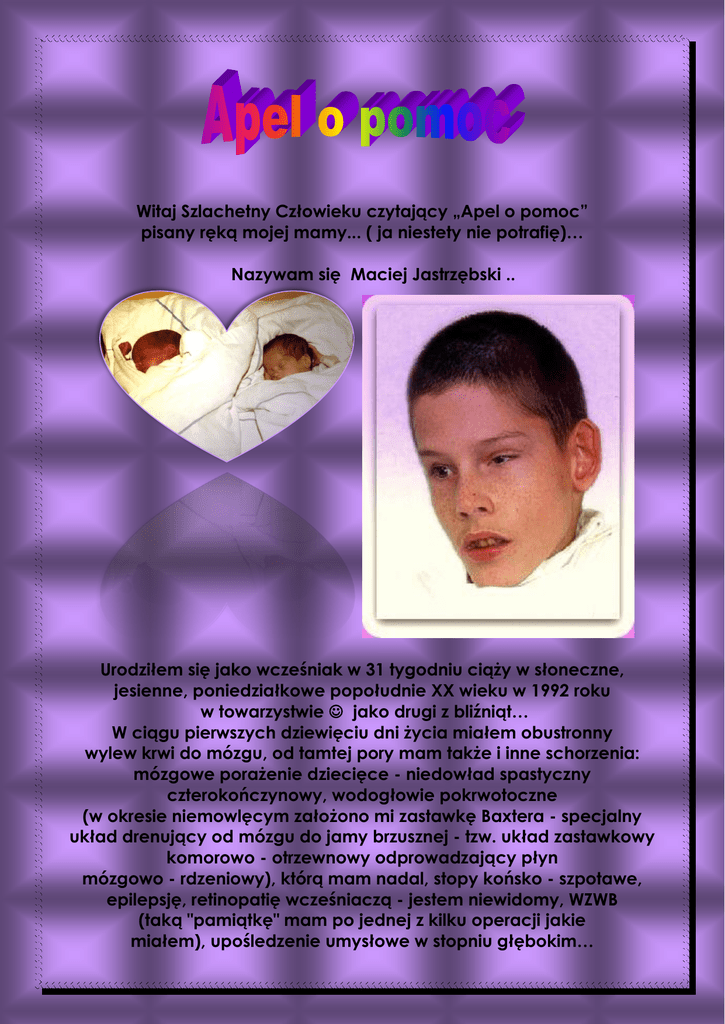 Witaj Szlachetny Człowieku czytający „Apel o pomoc” pisany ręką mojej mamy... ( ja niestety nie potrafię)… Nazywam się Maciej Jastrzębski .. Urodziłem się jako wcześniak w 31 tygodniu ciąży w słoneczne, jesienne, poniedziałkowe popołudnie XX wieku w 1992 roku w towarzystwie jako drugi z bliźniąt… W ciągu pierwszych dziewięciu dni życia miałem obustronny wylew krwi do mózgu, od tamtej pory mam także i inne schorzenia: mózgowe porażenie dziecięce - niedowład spastyczny czterokończynowy, wodogłowie pokrwotoczne (w okresie niemowlęcym założono mi zastawkę Baxtera - specjalny układ drenujący od mózgu do jamy brzusznej - tzw. układ zastawkowy komorowo - otrzewnowy odprowadzający płyn mózgowo - rdzeniowy), którą mam nadal, stopy końsko - szpotawe, epilepsję, retinopatię wcześniaczą - jestem niewidomy, WZWB (taką "pamiątkę" mam po jednej z kilku operacji jakie miałem), upośledzenie umysłowe w stopniu głębokim… Nie mówię, nie chodzę, wymagam całodobowej opieki… Codziennie, dzielnie zmagam się ze swoim losem, jestem spokojny, radosny i zawsze pełen uśmiechu - choć bezbronny i całkowicie zdany na moją mamę, która kocha mnie nad własne życie... Ze względu na swoją niepełnosprawność wymagam systematycznej i intensywnej rehabilitacji ruchowej oraz wszelkiego rodzaju terapii stymulującej rozwój, wyjazdów na turnusy rehabilitacyjne, zakupu sprzętu rehabilitacyjnego i ortopedycznego, pieluchomajtek, środków czystości i higieny a przede wszystkim specjalnej troski, która jest bezcenna… NFZ pokrywa zaledwie minimalną część potrzeb niepełnosprawnej osoby. Podaję częściowe koszty związane z opieką, pielęgnacją, rehabilitacją i moim leczeniem, ponieważ są dla wielu osób nieznane: - pieluchomajtki - ok. 600 zł. m - nie, - podkłady nieprzemakalne - ok. 300 zł. m - nie, - rehabilitacja prywatna w domu - 1200 zł. m - nie., - materac p/odleżynowy - 300 zł., - gruszka rehabilitacyjna - ok. 300 zł., - 14 - dniowy turnus rehabilitacyjny ok. 3000 zł. - 5000 zł., - delfinoterapia - ok. 15000 zł., - podnośnik wannowy - ok. 2500 zł., - mata ozonowa do hydromasażu - 2500 zł. - 4000 zł., - specjalne łóżko - 3000 zł.- 5100 zł., - składany stół do masażu - 450 zł. - 2000 zł., - fotelik rehabilitacyjny - 2200 zł. - 2600 zł., - wózek inwalidzki specjalny dziecięcy typ Comfort Maxi z częściowym wyposażeniem dodatkowym - 4500 zł., - fotelik rehabilitacyjny Recaro Monza Reha do samochodu dla niepełnosprawnej osoby wraz z akcesoriami - ok. 9000 zł. Kwoty związane z moim leczeniem i rehabilitacją znacznie przewyższają możliwości finansowe naszej rodziny. Chociaż moja pełnoletniość zaczęła się ponad trzy lata temu jestem jak niemowlę - trzeba mnie karmić, myć, zmieniać pieluchy (nie zgłaszam potrzeb fizjologicznych) - pielęgnować, ubierać, nosić na rękach i wozić mnie w wózku inwalidzkim, trzeba też za mnie myśleć i decydować… Moim jedynym żyjącym rodzicem jest moja mama, jest gdy jej potrzebuję, jest zawsze... Mama nie pracuje zawodowo, prawie całodobowo się mną zajmuje... Człowieku o Szlachetnym Sercu (a ufam, że masz takie...) Ty także możesz mi pomóc w życiu, rehabilitacji i leczeniu... Można mi także pomóc w następujący sposób: 1. Przekazując 1% swojego podatku w rozliczeniu rocznym (to nic nie kosztuje! - te pieniądze i tak nie trafiłyby do Twojej kieszeni lecz na konto Urzędu Skarbowego - wybór należy do Ciebie...):): ->w formularzu PIT: - >w rubryce „Wniosek o przekazanie 1% podatku należnego na rzecz organizacji pożytku publicznego (OPP)” wpisz numer: KRS 0000308316 -> w rubryce „Informacje uzupełniające - cel szczegółowy 1%” podaj: Jastrzębski Maciej J/35 Szanowni Darczyńcy, proszę także o wyrażenie zgody w formularzu PIT na przekazanie swoich danych organizacji pożytku publicznego. 2. Dokonując dowolnej darowizny na moje subkonto w Fundacji: Fundacja ZŁOTOWIANKA ul. Widokowa 1 77-400 Złotów Spółdzielczy Bank Ludowy Zakrzewo: 25 8944 0003 0002 7430 2000 0010 Operacje zagraniczne wymagają użycia SWIFT CODE: GBWCPLPP Tytułem: darowizna dla Jastrzębski Maciej J/35 (Przekazanie darowizny - mi - Maciejowi Jastrzębskiemu - na konto fundacji można odliczyć od dochodu w zeznaniu rocznym za rok, w który przelano pieniądze. Osoby fizyczne (PIT) mogą odliczyć nie więcej niż 6% dochodu a osoby prawne (CIT) nie więcej niż 10% dochodu. 3. Informując rodzinę, znajomych - daj im szansę pomocy dla mnie... 4. Umieszczając na swoich stronach internetowych oraz portalach społecznościowych (gg, skype, goldenonline, nk, facebook i innych) informacji o mnie… 5. Roznosząc ulotki, kalendarzyki listkowe... W przypadku przekazania 1%, darowizny proszę o informację, aby moja mama mogła dopilnować w fundacji właściwego zaksięgowania środków na moim subkoncie. Każda nawet niewielka kwota będzie dla mnie niczym manna z nieba… "Grosz dany w potrzebie, złotem wróci do Ciebie!"... Czy możesz mi pomóc? Serdecznie dziękuję za okazaną pomoc i życzliwość, pozdrawiam życząc wszystkiego dobrego:) pisała: Mama Macieja - Katarzyna Jastrzębska e - mail: [email protected]