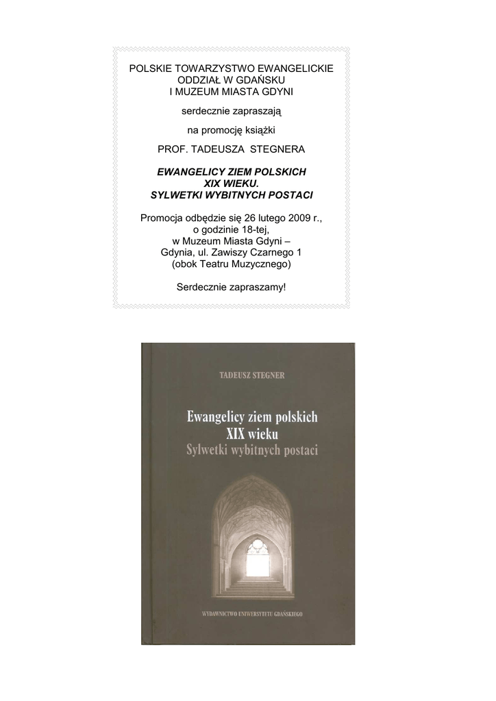 POLSKIE TOWARZYSTWO EWANGELICKIE ODDZIAŁ W GDAŃSKU I MUZEUM MIASTA GDYNI serdecznie zapraszają na promocję ksiąŜki PROF. TADEUSZA STEGNERA EWANGELICY ZIEM POLSKICH XIX WIEKU. SYLWETKI WYBITNYCH POSTACI Promocja odbędzie się 26 lutego 2009 r., o godzinie 18-tej, w Muzeum Miasta Gdyni – Gdynia, ul. Zawiszy Czarnego 1 (obok Teatru Muzycznego) Serdecznie zapraszamy! POLSKIE TOWARZYSTWO EWANGELICKIE ODDZIAŁ W GDAŃSKU serdecznie zaprasza członków i sympatyków na spotkanie z p. Benedyktem Reszką autorem ksiąŜki EWANGELICY NA GOCHACH Spotkanie odbędzie 23 kwietnia 2009 r., o godz. 17.30, na Plebanii Parafii Ewangelicko-Augsburskiej w Sopocie, przy ul. Kościuszki 51 Serdecznie zapraszamy! PROGRAM Temat wiodący: Ewangelicki etos pracy Czwartek – 10 września 14.00 – Wycieczka „Ewangelicki Gdańsk” Piątek – 11 września 10.00 – uroczysta inauguracja (Sopot, Ratusz) 10.45 – 12.00 – referaty: prof. J. Gardawski „Ewangelicki etos pracy” ks. prof. M. Hintz „Teologiczne aspekty ewangelickiego etosu pracy” prof. J. Małłek „Ewangelicy pomorscy” 12.00 – 12.30 - przerwa na kawę PARAFIA EWANGELICKOAUGSBURSKA W SOPOCIE POLSKIE TOWARZYSTWO EWANGELICKIE ODDZIAŁ GDAŃSKI zapraszają na XV FORUM INTELIGENCJI EWANGELICKIEJ Sopot, 11 – 13 IX 2009 r. 12.30 – 13.30 - dyskusja 14.00 – obiad 15.30 – 17.00 – obrady (Sopot, kościół): Blok tematyczny „Rok Kalwina” herbata; wystawa: „Publikacje sopockich parafian” 18.00 – Koncert w wykonaniu członków Parafii E-A w Sopocie 19.30 – kolacja Sobota – 12 września 9.30 – 11.00 – referaty (Sopot, Kościół): ks. prof. B. Milerski „Współczesne aspekty ewangelickiego etosu pracy” L. J. Michejda „Protestantyzm a społeczeństwo obywatelskie” Stowarzyszenie Przedsiębiorców Ewangelickich „Etos pracy w biznesie” M. Drapella „Etos pracy – ewangelików portret własny” 11.00 – 11.30 – przerwa na kawę 11.30 – 12.30 – dyskusja POD PATRONATEM BOGDANA BORUSEWICZA MARSZAŁKA SENATU RP oraz KS. M. WARCZYŃSKIEGO BISKUPA DIECEZJI POMORSKOWIELKOPOLSKIEJ KOŚCIOŁA EWANGELICKOAUGSBURSKIEGO W RP 12.30 – 13.00 – komunikaty: ks. W. Markowski „Metodyści w Gdańsku” ks. bp M. Warczyński „Dzieje Parafii Ewangelicko-Augsburskiej w Sopocie” 13.00 - 14.30 – ciepły poczęstunek, spacer do Muzeum Sopotu 14.30 – 15.30 – cd. obrad: Blok tematyczny „Świeccy a Kościół”; moderator – prof. Paweł Puczek dr A. Kułak „Szkoły ewangelickie w Polsce” J. Warczyńska „Omówienie ankiety Świeccy a Kościół” M. Borkowska „Ocena dokonań Forum Ewangelickiego w latach 1994 – 2007 i wnioski na przyszłość” 15.30 – 16.30 – dyskusja, wolne wnioski 16.30 – 17.30 – Krąg dyskusyjny – moderator prof. J. Świderski 18.00 – przyjęcie (obiadokolacja) na Plebanii Parafii E-A w Sopocie KOMITET ORGANIZACYJNY przew. prof. Tadeusz Stegner Maria Drapella Jolanta Warczyńska Niedziela – 13 września 9.30 – NaboŜeństwo (Sopot, Kościół) Po naboŜeństwie kawa i zakończenie obrad 13.30 – obiad POLSKIE TOWARZYSTWO EWANGELICKIE ODDZIAŁ W GDAŃSKU serdecznie zaprasza członków i sympatyków na spotkanie z p. Bogusławem Goszem, który wygłosi prelekcję „Luteranie w województwie pomorskim po II wojnie światowej – perspektywa geograficzna” Spotkanie odbędzie 5 listopada 2009 r., o godz. 17.30, na Plebanii Parafii Ewangelicko--Augsburskiej w Sopocie, przy ul. Kościuszki 51 Serdecznie zapraszamy! mgr Bogusław Gosz odbiera gratulacje DZIAŁALNOŚĆ BIBLIOTEKI EWANGELICKIEJ ETOS W 2009 R. WYSTAWY 1. REFORMATORZY : MARCIN LUTER - JAN KALWIN - JAN BUGENHAGEN. Wystawa zorganizowana w związku z DEKADĄ LUTRA, ROKIEM KALWINA i 450-tą rocznicą śmierci JANA BUGENHAGENA. Część stała czynna była od 25 stycznia 2009 do 27 stycznia 2010, natomiast część czasowa – trzy miesiące. 2. NOWE NABYTKI – 30 sierpnia – 9 września. 3. PUBLIKACJE SOPOCKICH PARAFIAN – publikacje naukowe PROF. JANA ILUKA, PROF. BOGUMIŁA J.B. LINDEGO, PROF. TADEUSZA STEGNERA, PROF. KAROLA TOEPLITZA, PROF. JANUSZA ZIÓŁKO oraz publicystyka MARII DRAPELLA, JOLANTY WARCZYŃSKIEJ, ROMANA GRABOWSKIEGO. Wystawa czynna była od 10 września do 30 listopada. INFORMATORY O NABYTKACH 1. 31 STYCZNIA. 2. 12 KWIETNIA. 3. 5 LIPCA. 4. 30 SIERPNIA. 5. 20 GRUDNIA. Wszystkie informatory są 4-stronnicowe, zawierają dane bibliograficzne, biblioteczne (w tym klucz tematyczny i słowa kluczowe), nazwisko/nazwę darczyńcy i krótką informację nt. treści publikacji. Nakład: 25 – 30 egzemplarzy. ZBIORY I CZYTELNICTWO Liczba zgromadzonych i opracowanych pozycji Wartość zbiorów Liczba zapisanych czytelników 31 XII 2008 r. 31 XII 2009 r. 1117 10651,20 zł 1571 15774,75 zł 89 103 Liczba wypoŜyczeń w 2009 r.: 106 Biblioteka mieści się na piętrze Kościoła, czynna jest w niedziele po naboŜeństwach. Gromadzenie i opracowywanie zbiorów (program Biblos), przygotowanie wystaw – Maria Drapella. Udostępnianie – Maria Drapella, Janusz Chilicki.