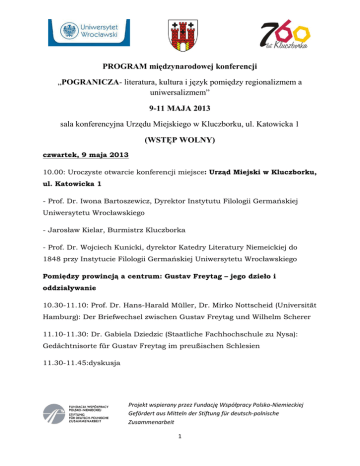 PROGRAM międzynarodowej konferencji „POGRANICZA- literatura, kultura i język pomiędzy regionalizmem a uniwersalizmem” 9-11 MAJA 2013 sala konferencyjna Urzędu Miejskiego w Kluczborku, ul. Katowicka 1 (WSTĘP WOLNY) czwartek, 9 maja 2013 10.00: Uroczyste otwarcie konferencji miejsce: Urząd Miejski w Kluczborku, ul. Katowicka 1 - Prof. Dr. Iwona Bartoszewicz, Dyrektor Instytutu Filologii Germańskiej Uniwersytetu Wrocławskiego - Jarosław Kielar, Burmistrz Kluczborka - Prof. Dr. Wojciech Kunicki, dyrektor Katedry Literatury Niemeickiej do 1848 przy Instytucie Filologii Germańskiej Uniwersytetu Wrocławskiego Pomiędzy prowincją a centrum: Gustav Freytag – jego dzieło i oddziaływanie 10.30-11.10: Prof. Dr. Hans-Harald Müller, Dr. Mirko Nottscheid (Universität Hamburg): Der Briefwechsel zwischen Gustav Freytag und Wilhelm Scherer 11.10-11.30: Dr. Gabiela Dziedzic (Staatliche Fachhochschule zu Nysa): Gedächtnisorte für Gustav Freytag im preußischen Schlesien 11.30-11.45:dyskusja Projekt wspierany przez Fundację Współpracy Polsko-Niemieckiej Gefördert aus Mitteln der Stiftung für deutsch-polnische Zusammenarbeit 1 12.00-12.20: Prof. Dr. Edward Białek (Universität Wrocław): „Eindeutig germanisch”. Zur Rezeption von Gustav Freytags Werk in der literarischen Kultur Niederschlesiens nach dem Ersten Weltkrieg 12.20-12.40: Prof. Dr. Izabela Surynt (Universität Wrocław): Von der „Bastardisierung” zur Multikulturalität. Schlesien im Werk von Gustav Freytag 12.40-13.00: PD Dr. Jochen Strobel (Philipps-Universität-Marburg): Tableaus und raumzeitliche Schwellen in der populären Geschichtsnarrativik: Gustav Freytags „Bilder aus der deutschen Vergangenheit“ 13.00-13.20: Dr. Irmtraud Hnilica (Fernuniversität Hagen): Romangrenzräume: Polen als Reich der Poesie in Gustav Freytags „Soll und Haben“ 13.20-14.00: dyskusja Miejsca pamięci 15.00-15.20: Prof. Dr. Paweł Zimniak (Universität Zielona Góra): Provinz zwischen Teilhabe und Distanz 15.20-15.40: Dr. Hab. Ewa Jarosz-Sienkiewicz (Universität Wrocław): „Neue Umlaufbahn. Gedichte.” Zur Verdichtung des Ausdrucks in der Lyrik von Heinz Piontek 15.40-16.00: Dr. Robert Buczek (Universität Zielona Góra): Die oberschlesische Heimat in autobiographischen Romanen von Heinz Piontek 16.00-16.20: dyskusja Projekt wspierany przez Fundację Współpracy Polsko-Niemieckiej Gefördert aus Mitteln der Stiftung für deutsch-polnische Zusammenarbeit 2 16.30-16.50: Dr. Monika Mańczyk-Krygiel (Universität Wrocław): „Ach, Heimweh hast du wohl nicht gehabt nach Kreuzburg.“ Überlegungen zum Roman Pauline aus Kreuzburg von Ruth Hoffmann 16.50-17.10: Aleksandra Chirkowska, M.A. (Universität Wrocław): Obraz prowincji i poetyka pogranicza u Viktora Kaluzy i Hansa Lipinsky‟egoGottersdorfa (Vortrag in polnischer Sprache) 17.10-17.30: Prof. Dr. Roman Dziergwa (Universität Poznań): Obraz Byczyny i ziemi kluczborskiej w „Lebenserinnerungen” pastora Arthura Rhode (Vortrag in polnischer Sprache) 17.30-18.00: dyskusja 18.00-18.30: Madlen Kazimierczak, M.A. (Heinrich-Heine-Universität Düsseldorf): Das Max-Herrmann-Neiße-Editionsprojekt 18.30-20.00: Zwiedzanie Rynku oraz spacer do domu Gustava Freytaga i Heinza Piontka piątek, 10 maja 2013 Pogranicza 8.30-8.50: Dr Katarzyna Postrzednik-Lotko (Opole): Der Begriff des Grenzraumes im interdisziplinären Gefüge. Definitionen, Zugänge, Schulen 8.50-9.10: PD Dr. Jürgen Joachimsthaler (Ruprecht-Karls-Universität Heidelberg): Die Unmöglichkeit einer literarischen Grenze oder: Warum jede Semantik der Abgrenzung ihr Scheitern bereits in sich trägt Projekt wspierany przez Fundację Współpracy Polsko-Niemieckiej Gefördert aus Mitteln der Stiftung für deutsch-polnische Zusammenarbeit 3 9.10-9:30: Dr. Gabriela Ociepa (Universität Wrocław): Übersetzung der "Bürgschaft" von Friedrich Schiller ins Wasserpolnische. Kreuzburg: Thielmann 1892 9:30-9.50: Dr. Magdalena Kardach (Universität Poznań): Prowincja człowieka. Krajobraz naturalny i kulturowy jako lustro pamięci pytającego o sens historii i współczesności konkretnej okolicy i miejsca (Vortrag in polnischer Sprache) 9.50-10:20: dyskusja 10.30-10.50: Dr. Łukasz Bieniasz (Universität Wrocław): Transnationale Dissidenz und philosophische Clandestina im polnisch-schlesischen Grenzraum im 17. Jh. 10.50-11.10: Dr. Jan Pacholski (Universität Wrocław): Das Riesengebirge als Grenze (in der dt. Literatur des 17. bis 19. Jahrhunderts) 11.10-11.30: Dr. Hab. Marta Kopij (Universität Wrocław): Vom Patriotismus zum Nationalismus. Reale Niederlage – medialer Sieg. 11.30-11.50: dyskusja 12.00: Główne uroczystości związane z obchodami 760-lecia miasta Kluczborka Uroczyste przywitanie wszystkich zebranych przez Burmistrza Miasta Kluczborka 12.05-12.25: Peter Klotz: Die sprachliche Situation im Grenzkreis Kluczbork/Kreuzburg vom Spätmittelalter bis zur Neuzeit Projekt wspierany przez Fundację Współpracy Polsko-Niemieckiej Gefördert aus Mitteln der Stiftung für deutsch-polnische Zusammenarbeit 4 12.25-12.45: Henryk Schröder: Dzieje Kluczborka do połowy XVIII w. Wkład mieszkańców i Piastów Śląskich w dynamiczny rozwój miasta (Vortrag in polnischer Sprache) 12.45-13.10 Przemówienia zaproszonych gości, przedstawicieli miast partnerskich oraz przedstawicieli stowarzyszeń i instytucji z Gminy Kluczbork. 13.10-13.30: Piotr Stronciwilk, M.A. (Universität Wrocław): Die Polenproblematik in der Zeitschrift "Grenzboten" von Gustav Freytag 13.30-13.50: Prof. Dr. Wojciech Kunicki (Universität Wrocław): Gustav Freytag als Redakteur des Musenalmanach auf das Jahr 1843 13.50-14.15: dyskusja 15:00-15.20: Rafał Biskup (Wrocław): Viktor Kaluza – Leben Und Werk 15.20-15.40: Julianna Redlich, M.A. (Universität Wrocław): Das Motiv der Grenze in Carl Busses Erzählung Auf Grenzwache 15.40-16.00: Prof. Dr. Maciej Walkowiak (Universität Poznań): Ein Grenzraum im Feuersturm. Zur Frage der gerechten Grenze und 