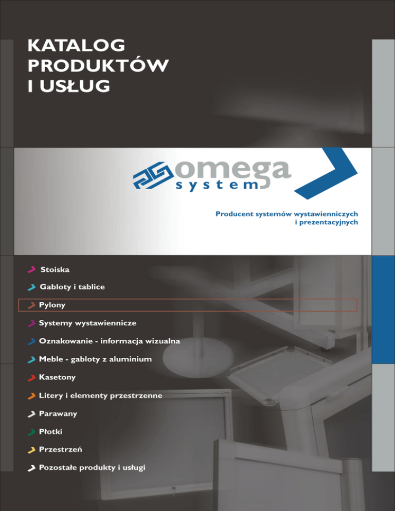 KATALOG PRODUKTÓW I USŁUG Producent systemów wystawienniczych i prezentacyjnych Stoiska Gabloty i tablice Pylony Systemy wystawiennicze Oznakowanie - informacja wizualna Meble - gabloty z aluminium Kasetony Litery i elementy przestrzenne Parawany Płotki Przestrzeń Pozostałe produkty i usługi Spis treści 2-3 Stoiska - stoiska targowe - promocyjno - sprzedażowe - stoiska modułowe OMEGA ROUND Line - złóż własne stoisko OMEGA ROUND Line - stoiska sklepowe - zabudowa 6 7 8-9 10-11 12-13 Gabloty i tablice - podział według LINII - budowa - gabloty wiszące - gabloty na sztandar - tablice - gabloty na karty pracownicze - gabloty na klucze - gabloty stojące 17 18-19 20-21 22 22 23 23 24-25 Pylony - SLIM Line - OVAL Line - SEMI OVAL Line - ROUND Line - budowa 29 30 30 31 32-33 Systemy wystawiennicze - ścianki wystawowe / ekspozycyjne - ścianki wystawowe / ekspozycyjne - plenerowe - ścianki reklamowo - promocyjne - ścianki ROUND Line - stwórz swój model - ścianki ECO Line - stwórz swój model - lady - trybunki promocyjne - stojaki na banery - ekspozytory z pleksi na ulotki - lady sprzedażowe - stoiska mobilne - tacki degustacyjne - stojak ROUND Line - budowa - stojak ECO Line - budowa - kieszenie na ulotki A5, A4, A3 - stojaki na ulotki - stojaki z tablicą informacyjną - stojaki z tablicą informacyjną i kieszeniami na ulotki - meble ekspozycyjne - dystanse, zawiesia reklamowe - prezentery świetlne, prezentery LED grawerowane - ramki różne, zatrzaskowe 36 36 37 38-39 40-41 42 43 44 44 45 45 45 46 47 48 49 50 51 52 53 54 55 Spis treści Oznakowanie - informacja wizualna - tablice główne - tabliczki administracyjne i numery domów - słupki kierunkowe, pylony MINI - tabliczki informacyjne - przydrzwiowe - tablice, szyldy - tablice z mosiądzu, grawerowane - tabliczki grawerowane - tablice informacyjne na ścianę - tablice informacyjne boczne - tablice informacyjne podwieszane - tablice LED 58 59 60 60 61 61 61 62 62 63 63 Meble - gabloty z aluminium - witryny wiszące - gabloty nietypowe - gabloty “na trofea” - gabloty ekspozycyjne, muzealne - witryny stojące - witryny stojące light - lady 67 67 67 68-69 70-71 71 72-73 Kasetony - kasetony klasyczne - kasetony z otwieranym frontem - kasetony kształtowe (zewnętrzne i wewnętrzne) Litery i elementy przestrzenne 77 77 78-79 82-83 Parawany - parawany - parawany wolnostojące - ścianki składane - wielofunkcyjne stelaże do urządzeń rehabilitacyjnych 86 87 88 89 Przestrzeń biurowa - ścianki w biurze - Open Space - boksy - palarnie 93 94-95 95 Płotki 98-99 Pozostałe produkty i usługi - inne - obudowy, osłony do maszyn, urządzeń i lini technologicznych - animal sport - usługi 102 103 104-105 106 3 Pylony PYLONY 28 Pylony SLIME LINE pylony Omega SLIM Line Nr kat. P/OSL/01 pylony dwustronne Omega SLIM Line Nr kat. P/OSL/02 pylony multimedialne Omega SLIM Line Nr kat. P/OSL/M 29 OVAL LINE pylony Omega OVAL Line Nr kat. P/OOL/01 pylony na nogach Omega OVAL Line Nr kat. P/OOL/02 SEMI OVAL LINE pylony Omega SEMI OVAL Line Nr kat. P/OSOL/01 pylony - szerokie Omega SEMI OVAL Line Nr kat. P/OSOL/02 30 Pylony ROUND LINE pylony Omega ROUND Line Nr kat. P/ORL/01 31 PYLONY - budowa Profile SLIM Line Pylon SEMI OVAL Line Podstawa pylonów Kręgi stalowe (wersja do wewnątrz) 32 Montowane do ziemi (OVAL Line) różne wypełnienia: dibond, pleksi opal, PVC i inne Kręgi betonowe z osłoną z tworzywa Pylony OVAL Line SEMI OVAL Line ROUND Line Dodatkowe elementy Podświetlany wewnątrz (SEMI OVAL Line) Kieszenie na ulotki (ROUND Line) Ramki zatrzaskowe na grafikę (SLIME Line) Pylon multimedialny (SLIM Line) Elementy frezowane (SLIME Line) Wymienne tabliczki z informacjami (OVAL Line) 33