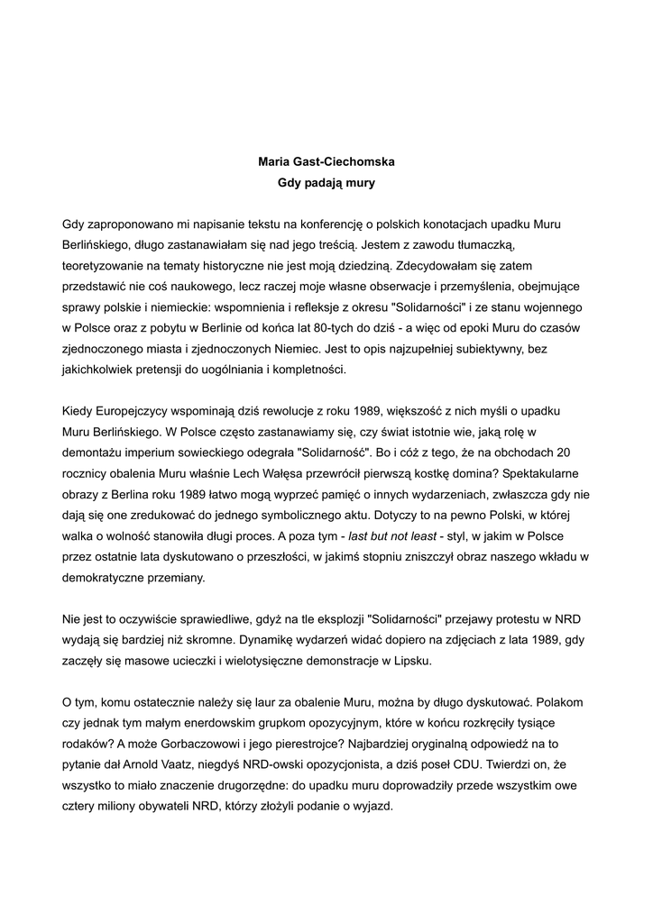 Maria Gast-Ciechomska Gdy padają mury Gdy zaproponowano mi napisanie tekstu na konferencję o polskich konotacjach upadku Muru Berlińskiego, długo zastanawiałam się nad jego treścią. Jestem z zawodu tłumaczką, teoretyzowanie na tematy historyczne nie jest moją dziedziną. Zdecydowałam się zatem przedstawić nie coś naukowego, lecz raczej moje własne obserwacje i przemyślenia, obejmujące sprawy polskie i niemieckie: wspomnienia i refleksje z okresu "Solidarności" i ze stanu wojennego w Polsce oraz z pobytu w Berlinie od końca lat 80-tych do dziś - a więc od epoki Muru do czasów zjednoczonego miasta i zjednoczonych Niemiec. Jest to opis najzupełniej subiektywny, bez jakichkolwiek pretensji do uogólniania i kompletności. Kiedy Europejczycy wspominają dziś rewolucje z roku 1989, większość z nich myśli o upadku Muru Berlińskiego. W Polsce często zastanawiamy się, czy świat istotnie wie, jaką rolę w demontażu imperium sowieckiego odegrała "Solidarność". Bo i cóż z tego, że na obchodach 20 rocznicy obalenia Muru właśnie Lech Wałęsa przewrócił pierwszą kostkę domina? Spektakularne obrazy z Berlina roku 1989 łatwo mogą wyprzeć pamięć o innych wydarzeniach, zwłaszcza gdy nie dają się one zredukować do jednego symbolicznego aktu. Dotyczy to na pewno Polski, w której walka o wolność stanowiła długi proces. A poza tym - last but not least - styl, w jakim w Polsce przez ostatnie lata dyskutowano o przeszłości, w jakimś stopniu zniszczył obraz naszego wkładu w demokratyczne przemiany. Nie jest to oczywiście sprawiedliwe, gdyż na tle eksplozji "Solidarności" przejawy protestu w NRD wydają się bardziej niż skromne. Dynamikę wydarzeń widać dopiero na zdjęciach z lata 1989, gdy zaczęły się masowe ucieczki i wielotysięczne demonstracje w Lipsku. O tym, komu ostatecznie należy się laur za obalenie Muru, można by długo dyskutować. Polakom czy jednak tym małym enerdowskim grupkom opozycyjnym, które w końcu rozkręciły tysiące rodaków? A może Gorbaczowowi i jego pierestrojce? Najbardziej oryginalną odpowiedź na to pytanie dał Arnold Vaatz, niegdyś NRD-owski opozycjonista, a dziś poseł CDU. Twierdzi on, że wszystko to miało znaczenie drugorzędne: do upadku muru doprowadziły przede wszystkim owe cztery miliony obywateli NRD, którzy złożyli podanie o wyjazd. By zrozumieć, co naprawdę wydarzyło się ponad 20 lat temu, trzeba cofnąć się jeszcze dalej. W latach 70 w Europie Wschodniej, w tym także w Polsce, dysydenci zdefiniowali zasady uprawiania polityki wobec dyktatur. Rzucając im wyzwanie, sformułowali antytezę państwo-społeczeństwo. Państwo było zdegenerowane i opresyjne, a sprawujący władzę - zakłamani, zdradzieccy i bezbożni. Społeczeństwo za to było czyste i autentyczne. Toteż w Polsce prawdziwi Polacy byli opozycyjni, chodzili do kościoła i biedowali, odrzucając intratne propozycje ustawienia się w życiu, w państwie totalitarnym zawsze uwikłane we współpracę z bezpieką. Taki korzystny obraz niejednemu by się spodobał, ale sprawa nie jest taka prosta. Bo też lata PRL nie oznaczały bynajmniej nieustannego buntu przeciw narzuconemu systemowi. Same lata 70 to dekada względnej liberalizacji. Mimo to były to czasy trudne do wytrzymania, ponieważ była to zarazem epoka totalnego cynizmu. W zdemoralizowanej Polsce późnego Gierka partia zatraciła jakąkolwiek ideowość. Jej działacze mieli gdzieś Marksa i Lenina, nie pragnęli już nikogo przekonywać, że Moskwa jest przyjemniejszym miastem do mieszkania niż Paryż czy Londyn, a ciepła oranżada lepszym napojem niż Coca Cola z lodem, interesowało ich tylko utrzymanie władzy. Część społeczeństwa - ocenia się, że mniej więcej jedna trzecia - czerpała z tej sytuacji profity. Natomiast dla całej prawie reszty PRL był czymś danym, gdzie po prostu trzeba było jakoś ułożyć sobie życie, idąc na niezbędne kompromisy. Zwłaszcza fatalna sytuacja mieszkaniowa popychała ludzi do działań, na które w innej sytuacji pewnie nigdy by się nie zdecydowali - jak w piosence Wojciecha Młynarskiego: "najhardziejszą ugnie głowę budownictwo mieszkaniowe". Przystosowanie było konieczne także dlatego, że trudno było sobie wyobrazić możliwość innej rzeczywistości. Przy tym prawie każdy rozdzielał swe zachowania w sferze publicznej i prywatnej. W sferze publicznej - w pracy, w szkole, w obiegu oficjalnym - były pewne tematy, o których się nie mówiło. Za to w domu, z rodziną, żyło się w innym świecie. Tak w gruncie rzeczy funkcjonowała większość, łącznie z klerem katolickim (w wyborach do Sejmu 90% polskich księży - a więc ludzi, którzy już z racji wyznawanego światopoglądu znajdowali się w opozycji wobec komunizmu głosowało tak, jak życzyły sobie władze: bez skreśleń!). A po roku 1976, gdy KOR-owskie biuletyny, przynajmniej w Warszawie, były regularnie dostępne, nie było znów tak wielu chętnych, żeby je czytać. I wtedy nastąpił szereg wydarzeń, które w tym kontekście wydają się cudami. Po pierwsze, wybór Polaka na papieża. Trzeba to obiektywnie przyznać, niezależnie od tego, czy jest się gorliwym katolikiem, czy zaprzysięgłym ateistą. W czerwcu 1979 roku Jan Paweł II przyjechał do Polski z pierwszą pielgrzymką. Była ona istotna nie tylko z przyczyn ideowych, nie tylko z powodu owych wielokrotnie cytowanych profetycznych słów wypowiedzianych w Warszawie. Była ważna także dlatego, że dała ludziom – temu milionowi stojącemu na Placu Zwycięstwa – możliwość samoorganizacji poza strukturą państwa. Znaleźli się tam oni jako suwerenne, niezależne, a przy tym zdyscyplinowane jednostki. A potem podobnie było podczas strajków w sierpniu 1980 roku: ta sama spokojna determinacja, nikt nie wybijał szyb, nikt nikogo nie bił. Była to rewolucja nowego typu, rozumiana zupełnie inaczej niż zryw ogarniętych amokiem mas. To jeden z
