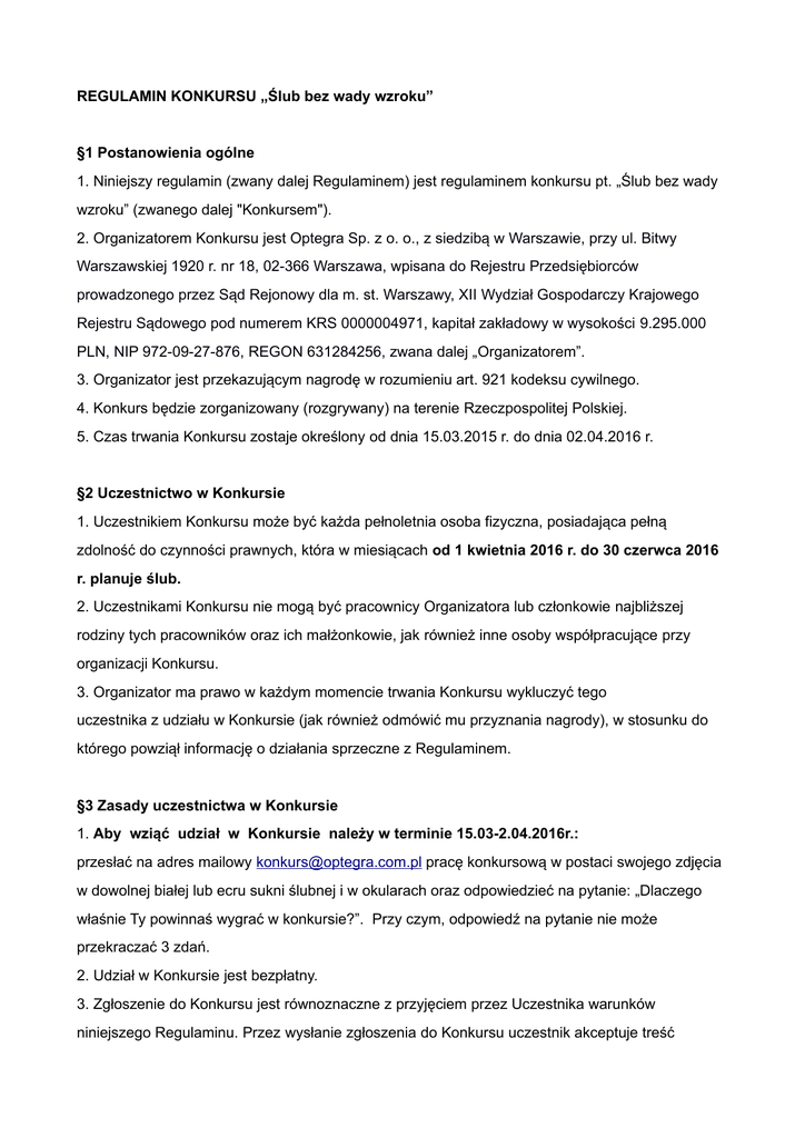 REGULAMIN KONKURSU „Ślub bez wady wzroku” §1 Postanowienia ogólne 1. Niniejszy regulamin (zwany dalej Regulaminem) jest regulaminem konkursu pt. „Ślub bez wady wzroku” (zwanego dalej "Konkursem"). 2. Organizatorem Konkursu jest Optegra Sp. z o. o., z siedzibą w Warszawie, przy ul. Bitwy Warszawskiej 1920 r. nr 18, 02-366 Warszawa, wpisana do Rejestru Przedsiębiorców prowadzonego przez Sąd Rejonowy dla m. st. Warszawy, XII Wydział Gospodarczy Krajowego Rejestru Sądowego pod numerem KRS 0000004971, kapitał zakładowy w wysokości 9.295.000 PLN, NIP 972-09-27-876, REGON 631284256, zwana dalej „Organizatorem”. 3. Organizator jest przekazującym nagrodę w rozumieniu art. 921 kodeksu cywilnego. 4. Konkurs będzie zorganizowany (rozgrywany) na terenie Rzeczpospolitej Polskiej. 5. Czas trwania Konkursu zostaje określony od dnia 15.03.2015 r. do dnia 02.04.2016 r. §2 Uczestnictwo w Konkursie 1. Uczestnikiem Konkursu może być każda pełnoletnia osoba fizyczna, posiadająca pełną zdolność do czynności prawnych, która w miesiącach od 1 kwietnia 2016 r. do 30 czerwca 2016 r. planuje ślub. 2. Uczestnikami Konkursu nie mogą być pracownicy Organizatora lub członkowie najbliższej rodziny tych pracowników oraz ich małżonkowie, jak również inne osoby współpracujące przy organizacji Konkursu. 3. Organizator ma prawo w każdym momencie trwania Konkursu wykluczyć tego uczestnika z udziału w Konkursie (jak również odmówić mu przyznania nagrody), w stosunku do którego powziął informację o działania sprzeczne z Regulaminem. §3 Zasady uczestnictwa w Konkursie 1. Aby wziąć udział w Konkursie należy w terminie 15.03-2.04.2016r.: przesłać na adres mailowy [email protected] pracę konkursową w postaci swojego zdjęcia w dowolnej białej lub ecru sukni ślubnej i w okularach oraz odpowiedzieć na pytanie: „Dlaczego właśnie Ty powinnaś wygrać w konkursie?”. Przy czym, odpowiedź na pytanie nie może przekraczać 3 zdań. 2. Udział w Konkursie jest bezpłatny. 3. Zgłoszenie do Konkursu jest równoznaczne z przyjęciem przez Uczestnika warunków niniejszego Regulaminu. Przez wysłanie zgłoszenia do Konkursu uczestnik akceptuje treść Regulaminu oraz warunki Konkursu opublikowane w treści ogłoszenia Konkursu. 4. Uczestnik Konkursu przesyłając zgłoszenie do Konkursu oświadcza, iż przysługują mu wyłączne i nieograniczone prawa autorskie do przesłanych prac konkursowych, które są przejawem jego własnej indywidualnej twórczości i są wolne od wad fizycznych i prawnych oraz roszczeń podmiotów trzecich. W przypadku, gdyby oświadczenia, o których mowa powyżej okazały się niezgodne ze stanem faktycznym i/lub prawnym, osoba, która nadesłała zgłoszenie, w przypadku ewentualnych roszczeń osób trzecich, ponosi wyłączną i całkowitą odpowiedzialność oraz oświadcza, że ureguluje wszystkie związane z tym faktem poniesione przez Organizatora szkody. Ponadto, w sytuacji, o której mowa powyżej, osoba ta podlega dyskwalifikacji z Konkursu. 5. Uczestnik oświadcza, że wyraża zgodę na wielokrotne (nieograniczone ilościowo, czasowo i terytorialnie) oraz nieodpłatne korzystanie w całości jak i w dowolnie wybranych fragmentach z jego pracy konkursowej (zgłoszenia) przez Organizatora oraz firmy powiązane z Organizatorem na wszystkich znanych polach eksploatacji, a w szczególności: a. Utrwalanie i zwielokrotnianie drukiem lub podobną techniką, w tym fotokopiowanie i mikrokopiowanie; b. Wydawanie (publikowanie) i rozpowszechnianie we wszystkich wydaniach, niezależnie od formy, standardu, systemu lub formatu, bez ograniczenia liczby nakładów, wydań oraz egzemplarzy; obejmuje to także prawo do częściowego lub całkowitego przedruku (przed i po produkcji), w tym na fotokopiach, mikrokopiach i mikroreprodukcjach, a także do powielania w inny sposób; c. Wprowadzanie do pamięci komputera i sporządzanie kopii takich zapisów dla potrzeb eksploatacji oraz trwała lub czasowe zwielokrotnianie komputerowego zapisu w całości lub w części dowolnymi środkami i w dowolnej formie; d. Wykorzystywanie do celów marketingowych, w tym reklamy, promocji, oznaczenia lub identyfikacji Organizatora; obejmuje to również utrwalanie i zwielokrotnianie poligraficzne oraz wykorzystanie tych utrwaleń; utrwalanie audiowizualne dowolną techniką niezależnie do standardu, systemu i formatu, w tym powielania, rozpowszechniania i odtwarzania nagrań, przekazywanie, odtwarzanie i emitowanie w audycjach w środkach masowego przekazu, po utrwaleniu na nośnikach dźwięku i/lub obrazu; e. Publiczne udostępnianie w taki sposób, aby każdy mógł mieć do niego dostęp w miejscu i czasie przez siebie wybranym w tym w dowolnym: elektronicznym, cyfrowym itp. kanale komunikacji publicznej; f. Wprowadzanie do obrotu, rozpowszechnianie egzemplarzy oraz ich kopii. Uczestnik Konkursu udziela Organizatorowi na podstawie niniejszego postanowienia zezwolenia na korzystanie z zależnych praw autorskich na wszystkich polach eksploatacji wymienionych powyżej, o ile dla eksploatacji ww. pracy konkursowej, a także zezwolenia na udzielenie wzajemnego i równoczesnego lub samodzielnego opracowania, przeróbki, adaptowania części lub całości w tym przez nadawanie im różnego rodzaju form (zmienionej, skróconej, poszerzonej lub skondensowanej). Uczestnik Konkursu udziela również Organizatorowi zezwolenia na udzielanie dalszych licencji w zakresie nabytych praw do ww. pracy konkursowej. Uczestnik konkursu wyraża zgodę, aby jego praca konkursowa zgłoszona przez niego do konkursu była wykorzystywana stosownie do potrzeb Organizatora i/lub podmiotu przez Organizatora wskazanego i wymogów jego publikacji oraz rozpowszechniania na w/w polach eksploatacji. 6. Zgłoszenia konkursowe niepełne lub nieprawidłowo wypełnione nie będą brały udziału w Konkursie. §4 Zasady wyłonienia zwycięzcy i oferowane nagrody 1. Zgłoszenia przesłane na 