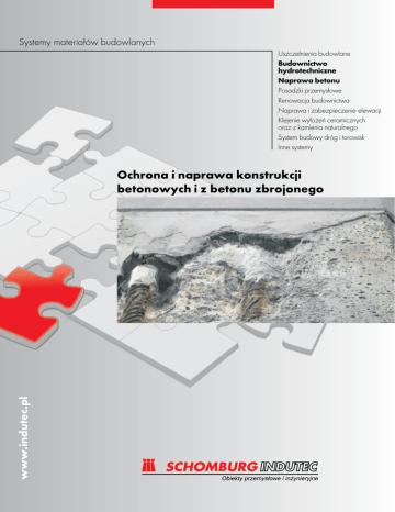 Systemy materiałów budowlanych Uszczelnienia budowlane Budownictwo hydrotechniczne Naprawa betonu Posadzki przemysłowe Renowacja budownictwa Naprawa i zabezpieczenie elewacji Klejenie wyłożeń ceramicznych oraz z kamienia naturalnego System budowy dróg i torowisk Inne systemy www.indutec.pl Ochrona i naprawa konstrukcji betonowych i z betonu zbrojonego Wprowadzenie Beton stosowany jest dzisiaj na prawie każdej budowli. Obiekty typu mosty, wiadukty, zbiorniki w oczyszczalniach ścieków, zbiorniki wody pitnej, parkingi, kanały, wieżowce, konstrukcje balkonów i tarasów lub posadzki przemysłowe betonowe w połączeniu ze stalą zbrojeniową spełniają swoje zadania. Obiekty żelbetowe podlegają naturalnemu procesowi starzenia. Obciążenia mechaniczne, zmienne warunki atmosferyczne oraz środowisko działają niszcząco na konstrukcje betonowe podczas ich użytkowania. Powstałe szkody mogą mieć wpływ na statykę budowli względnie bezpieczeństwo w ruchu drogowym. W celu zapewnienia prawidłowego wykonania i jakości prac reprofilacyjnych obiektu powinny one być wykonywane przez wyspecjalizowane i przeszkolone firmy wykonawcze. Na podstawie i zgodnie z normą PN-EN 1504-3 firma Schomburg-Indutec opracowała i wprowadziła systemy spełniające wysokie wymagania normowe z dobrymi właściwościami pod kątem obróbki i użytkowania. Specyficzne właściwości zapraw do naprawy betonu INDUCRET -BIS 5/40 i INDUCRET-BIS 1/6 umożliwiają wybór jednej z dwóch metod aplikacji: metoda zawarta w punkcie 3.1 (aplikacja ręczna) i metoda aplikacji natryskowej (SPCC) punkt 3.3 (nanoszenie betonu i zapraw naprawczych metodą natrysku). System zapraw INDUCRET-BIS stosowany jest również do naprawy i reprofilacji powierzchni zbiorników żelbetowych przeznaczonych do wody pitnej. System zapraw INDUCRET-KIS służy do naprawy zbiorników i kanałów w oczyszczalniach ścieków oraz systemów kanalizacyjnych i kolektorów ściekowych. Naprawa budowli z betonu Zaprawy typu PCC (Polymer Cement Concrete) oraz SPCC (Shot Polymer Cement Concrete) służą do napraw i reprofilacji uszkodzonych konstrukcji betonowych. Dzięki posiadanym właściwościom pozwalają na przywrócenie stanu pierwotnego konstrukcji, umożliwiając jej dalsze wieloletnie i bezawaryjne użytkowanie. Diagnostyka •analiza dokumentacji •inspekcja konstrukcji w celu ustalenia przyczyn widocznych uszkodzeń •pomiary gabarytowe i niwelacyjne •ocena zakresu uszkodzeń – zakresu wymaganych odkuć betonu •ocena możliwości wykonania napraw powierzchniowych •ocena zagrożenia korozyjnego zbrojenia •inwentaryzacja uszkodzeń •badania laboratoryjne Przyczyny uszkodzeń konstrukcji •błędy projektowe, wykonawcze •warunki i intensywność eksploatacji •wpływ środowiska •naturalny proces degradacji •zaniedbania w utrzymaniu i konserwacji Czynniki zmniejszające trwałość konstrukcji betonowych •uszkodzenia mechaniczne ( przeciążenia, osiadanie, uderzenia) •korozja betonu (ługująca, kwasowa, siarczanowa, chlorkowa, biologiczna) •błędy wykonawcze (złe zagęszczenia, brak pielęgnacji, zły stosunek w/c) Etapy niszczenia konstrukcji z betonu zbrojonego w wyniku oddziaływania czynników środowiska zewnętrznego •Etap I – (inicjacja) okres zobojętnienia lub skażenia agresywnymi substancjami •Etap II – (propagacja) otulina utraciła właściwości ochronne względem zbrojenia i prowadzi do spękań i odspojeń otuliny •Etap III – proces degradacji trwa do momentu, aż na skutek ubytków korozyjnych, konstrukcja osiągnie graniczny stan nośności lub użytkowania System zapraw do naprawy obiektów mostowych, parkingów i zbiorników na wodę do spożycia INDUCRET-BIS •Zaprawy naprawcze do aplikacji na powierzchnie pionowe, poziome i sufity •Do reprofilacji podłoży w zakresie grubości 1-6 mm lub 5-40 mm •Można nanosić metodą natrysku •O zredukowanej nasiąkliwości •Paroprzepuszczalne •Odporne na cykle zamrażania i rozmrażania i sole odladzające •Wysoka odporność na karbonatyzację •Wysoka odporność na ściskanie i zginanie •Dopasowany moduł sprężystości Younga •Wiąże bezskurczowo na powierzchniach obciążonych dynamicznie •Spełnia wymagania normy PN-EN 1504-3 (aplikacja 3.1 i 3.3) •Aprobata Techniczna IBDiM AT/2008-03-2395 •Atest PZH HK/W/0182/01/2011 z dopuszczeniem do stosowania jako zaprawy naprawcze do uzupełniania ubytków powierzchni betonowych w obiektach przemysłowych, usługowych, użyteczności publicznej oraz w basenach kąpielowych i zbiornikach na wodę przeznaczoną do spożycia przez ludzi •Certyfikat Zakładowej Kontroli Produkcji ITB-446/Z. Zaprawy naprawcze Opis systemu INDUCRET-BIS INDUCRET-BIS-0/2 Mineralna powłoka antykorozyjna i warstwa sczepna Warstwa antykorozyjna: INDUCRET-BIS-0/2 Ilość warstw: 2 Warstwa sczepna: INDUCRET-BIS-0/2 Ilość warstw: 1 INDUCRET-BIS-1/6 Drobnoziarnista zaprawa naprawcza i szpachlowa w zakresie grubości 1-6 mm Zaprawa drobnoziarnista: INDUCRET-BIS-1/6 Ilość warstw: co najmniej 1 Całkowita grubość warstwy: 1,0 – 6,0 mm INDUCRET-BIS-5/40 Zaprawa naprawcza do wypełniania ubytków w zakresie grubości 5-40 mm Zaprawa naprawcza: INDUCRET-BIS-5/40 Ilość warstw: co najmniej 1 Całkowita grubość warstwy: 5,0 – 40,0 mm System zapraw do zabezpieczania powierzchni w kanałach i oczyszczalniach ścieków INDUCRET-KIS Powierzchnie z betonu lub wyłożeń klinkierowych w systemach kanalizacyjnych i oczyszczalniach ścieków są nieustannie poddawane agresji chemicznej, biologicznej oraz ścieraniu na skutek przepływu cieczy. Obciążenia te prowadzą do powstawania zniszczeń, co pociąga za sobą konieczność przeprowadzania kosztownych remontów. W celu ochrony powierzchni przed korozją oraz w celu wydłużenia okresów eksploatacji stosuje się odpowiednie mineralne systemy ochrony powierzchniowej. Na etapie planowania nowych obiektów hydrotechnicznych oraz przy