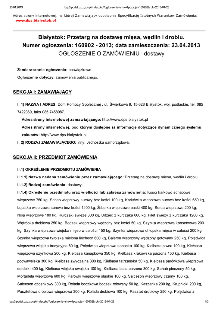 Białystok: Przetarg na dostawę mięsa, wędlin i drobiu. Numer