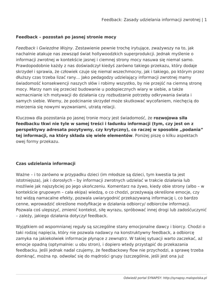 Feedback: Zasady udzielania informacji zwrotnej | 1 Feedback – pozostań po jasnej stronie mocy Feedback i Gwiezdne Wojny. Zestawienie pewnie trochę irytujące, zważywszy na to, jak nachalnie atakuje nas zewsząd świat hollywoodzkich superprodukcji. Jednak myślenie o informacji zwrotnej w kontekście jasnej i ciemnej strony mocy nasuwa się niemal samo. Prawdopodobnie każdy z nas doświadczył kiedyś zarówno takiego przekazu, który dodaje skrzydeł i sprawia, że człowiek czuje się niemal wszechmocny, jak i takiego, po którym przez dłuższy czas trzeba lizać rany… Jako pedagodzy udzielający informacji zwrotnej mamy świadomość konsekwencji naszych słów i robimy wszystko, by nie przejść na ciemną stronę mocy. Marzy nam się przecież budowanie u podopiecznych wiary w siebie, a także wzmacnianie ich motywacji do działania czy rozbudzanie potrzeby odkrywania świata i samych siebie. Wiemy, że podcinanie skrzydeł może skutkować wycofaniem, niechęcią do mierzenia się nowymi wyzwaniami, utratą relacji. Kluczowa dla pozostania po jasnej tronie mocy jest świadomość, że rozwojowa siła feedbacku tkwi nie tyle w samej treści i ładunku informacji (tym, czy jest on z perspektywy adresata pozytywny, czy krytyczny), co raczej w sposobie „podania” tej informacji, na który składa się wiele elementów. Poniżej piszę o kilku aspektach owej formy przekazu. Czas udzielania informacji Ważne – i to zarówno w przypadku dzieci (im młodsze są dzieci, tym kwestia ta jest istotniejsza), jak i dorosłych – by informacji zwrotnych udzielać w trakcie działania lub możliwie jak najszybciej po jego ukończeniu. Komentarz na żywo, kiedy obie strony (albo – w kontekście grupowym – cała ekipa) wiedzą, o co chodzi, przeżywają określone emocje, czy też widzą namacalne efekty, pozwala uwiarygodnić przekazywaną informację i, co bardzo cenne, wprowadzić określone modyfikacje w działania odbiorcy/ odbiorców informacji. Pozwala coś ulepszyć, zmienić kontekst, siłę wyrazu, spróbować innej drogi lub zadośćuczynić – zależy, jakiego działania dotyczył feedback. Wyjątkiem od wspomnianej reguły są szczególne stany emocjonalne dawcy i biorcy. Chodzi o taki rodzaj napięcia, który nie pozwala nadawcy na konstruktywny feedback, a odbiorcę zamyka na jakiekolwiek informacje płynące z zewnątrz. W takiej sytuacji warto zaczekać, aż emocje opadną (optymalnie: u obu stron), i dopiero wtedy przystąpić do przekazania feedbacku. Jeśli jednak nadal czujemy, że feedbackowy flow nie przychodzi, a sprawę trzeba domknąć, można np. odwołać się do mądrości grupy (szczególnie, jeśli jest ona już Odwiedź portal SYNAPSY: http://synapsy.malopolska.pl Feedback: Zasady udzielania informacji zwrotnej | 2 przećwiczona w udzielaniu informacji) i zapytać uczestników, jak widzą sytuację i co ich zdaniem warto byłoby teraz zrobić. Taki czas i posłuchanie innych głosów często pozwalają nie tylko złapać oddech, ale i… doznać olśnienia. Rozległość informacji To moja (i zdaje się nie tylko moja) pięta Achillesowa – trudno jest wysupłać z plątaniny myśli tylko te najistotniejsze wątki. A wszystkie mądre poradniki mówią: informacja zwrotna powinna zawierać tylko jeden lub dwa elementy; przy większej liczbie odbierający informację może mieć problem z zapamiętaniem i przełożeniem jej na praktyczne działanie. Dzieci nie przyjmują zbyt długich wyjaśnień, co ma to związek z ich labilnością uwagi i mało pojemną pamięcią krótkotrwałą. Zatem konkretność – co nie znaczy oschłość – jest w cenie. Język informacji Aby skutecznie się porozumiewać, a zwłaszcza udzielać feedbacku, trzeba wypracować wspólny język. Rzecz zdawałoby się trywialna, ale istnieje ryzyko, że blokers i – powiedzmy – rozmiłowany w poezji śpiewanej jogin-filozof mogliby nieco rozminąć się w przekazie językowym. Choć może się zdarzyć, że uczestnicy naszych zajęć reprezentują dość zróżnicowane stanowiska światopoglądowe i mają zgoła odmienne życiowe doświadczenia, to zazwyczaj jednak dysponujemy jakąś wspólną bazą. Co robić, kiedy chcemy „złapać” wspólny język: Słuchaj tego, co i jak mówią twoi podopieczni. Jeśli coś jest dla ciebie niejasne albo wręcz egzotyczne – pytaj. Dzięki temu lepiej będziesz rozumieć ich sposób myślenia i przeżywania świata, a pytając, dodatkowo okazujesz im zainteresowanie. Jeśli nawet świetnie orientujesz się już w języku uczestników, używaj go z wyczuciem. Nadmiar takich zapożyczeń (szczególnie slangu i to niezależnie od wieku prowadzącego zajęcia) nie sprzyja budowaniu wiarygodności, może natomiast wywołać w grupie rozbawienie, nie zawsze działające na naszą korzyść. Warto zatem posługiwać się swoim językiem, starać się, by był zrozumiały dla uczestników grupy, i od czasu do czasu – zależnie od własnego temperamentu – ożywiać go grupowym „wtrętem”, np. „To były mocne słowa, czuję, że mój pomysł został kompletnie niedoceniony, i na razie nie wiem, jak poukładać sobie informacje od Ciebie. Czy dobrze myślę, że coś takiego nazywa się hejtowaniem? Chyba wolę lajki…”. Dobrze, jeśli grupa wytworzy swój własny system komunikacji, kod językowy, składający się z haseł i słów kluczy, czytelnych dla tej konkretnej grupy, funkcjonujący pozytywnie, wyraźnie wzmacniający czy ukierunkowujący. Takie kody bywają czasem pomocne w Odwiedź portal SYNAPSY: http://synapsy.malopolska.pl Feedback: Zasady udzielania informacji zwrotnej | 3 próbach zrozumienia emocji, porządkowaniu zdarzeń czy przekazywaniu feedbacku w grupie. Informacja zwrotna po wykonaniu pracy terapeutycznej w grupie licealistów może np. brzmieć: „Siwy dym. Czarne chmury. Pełny szacun”. Wydawałoby się, że zawartość treściowa takiej informacji zwrotnej jest niewielka, ale sposób przekazu w