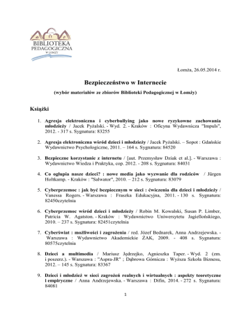 Łomża, 26.05.2014 r. Bezpieczeństwo w Internecie (wybór materiałów ze zbiorów Biblioteki Pedagogicznej w Łomży) Książki 1. Agresja elektroniczna i cyberbullying jako nowe ryzykowne zachowania młodzieży / Jacek Pyżalski. - Wyd. 2. - Kraków : Oficyna Wydawnicza "Impuls", 2012. - 317 s. Sygnatura: 83255 2. Agresja elektroniczna wśród dzieci i młodzieży / Jacek Pyżalski. – Sopot : Gdańskie Wydawnictwo Psychologiczne, 2011. – 164 s. Sygnatura: 84520 3. Bezpieczne korzystanie z internetu / [aut. Przemysław Dziak et al.]. - Warszawa : Wydawnictwo Wiedza i Praktyka, cop. 2012. - 208 s. Sygnatura: 84031 4. Co ogłupia nasze dzieci? : nowe media jako wyzwanie dla rodziców / Jürgen Holtkamp. - Kraków : "Salwator", 2010. – 212 s. Sygnatura: 83079 5. Cyberprzemoc : jak być bezpiecznym w sieci : ćwiczenia dla dzieci i młodzieży / Vanessa Rogers. - Warszawa : Fraszka Edukacyjna, 2011. - 130 s. Sygnatura: 82450czytelnia 6. Cyberprzemoc wśród dzieci i młodzieży / Robin M. Kowalski, Susan P. Limber, Patricia W. Agatston. - Kraków : Wydawnictwo Uniwersytetu Jagiellońskiego, 2010. – 237 s. Sygnatura: 82451czytelnia 7. Cyberświat : możliwości i zagrożenia / red. Józef Bednarek, Anna Andrzejewska. Warszawa : Wydawnictwo Akademickie ŻAK, 2009. - 408 s. Sygnatura: 80575czytelnia 8. Dzieci a multimedia / Mariusz Jędrzejko, Agnieszka Taper. - Wyd. 2 (zm. i poszerz.). - Warszawa : "Aspra-JR" ; Dąbrowa Górnicza : Wyższa Szkoła Biznesu, 2012. – 145 s. Sygnatura: 83367 9. Dzieci i młodzież w sieci zagrożeń realnych i wirtualnych : aspekty teoretyczne i empiryczne / Anna Andrzejewska. - Warszawa : Difin, 2014. - 272 s. Sygnatura: 84081 1 10. Kradzież tożsamości : terroryzm informatyczny : cyberprzestępstwa, internet, telefon, Facebook / Tomasz Trejderowski. - Warszawa : Eneteia Wydawnictwo Psychologii i Kultury, 2013. – 218 s. Sygnatura: 83711czytelnia, 83900 11. Media - komunikacja - zdrowie : wyzwania, szanse, zagrożenia / pod red. Bassama Aouil'a i Wojciecha J. Maliszewskiego. - Toruń : Adam Marszałek, 2008. 242 s. Sygnatura: 80141czytelnia 12. Nadmierne używanie Internetu : charakterystyka psychologiczna / Katarzyna Kaliszewska. - Poznań : Wydaw. Naukowe UAM , 2007. - 161 s. Sygnatura: 79953czytelnia, 80038 13. (Nie)bezpieczny komputer : od euforii do uzależnień / Anna Andrzejewska. Warszawa : Wydawnictwo Akademii Pedagogiki Specjalnej, 2008. - 124 s. Sygnatura: 80974 14. Niebezpieczny komputer i Internet / Sebastian Taboł. W: Zaniedbane i zaniechane obszary edukacji w szkole ? / pod red. Małgorzaty Suświłło. – Olsztyn: Wydwanictwo UWM, 2006. – S. 338-348. Sygnatura: 79052czytelnia 15. Patologia cyfrowego dzieciństwa i młodości : przyczyny, skutki, zapobieganie w rodzinach i w szkołach / Stanisław Kozak. - Warszawa : Difin, 2014. - 302 s. Sygnatura: 84701 16. Patologie komunikowania w Internecie : zagrożenia i skutki dla dzieci i młodzieży / Stanisław Kozak. - Warszawa : Difin, 2011. - 272 s. Sygnatura: 82408 17. Patologie społeczne w sieci / Sylwester Bębas. - Toruń : Wydawnictwo Edukacyjne "Akapit", 2013. - 226 s. - Na okł.: Internet, gry, cyberstalking, cyberprzemoc. Sygnatura: 83409, 83588czytelnia 18. Patologie w cyberświecie / red. nauk. Sylwester Bębas, Jerzy Plis, Józef Bednarek. Radom : Wyższa Szkoła Handlowa, 2012. - 495 s. Sygnatura: 83214 19. Uczeń bezpieczny w cyberprzestrzeni / red. nauk. Danuta Szeligiewicz-Urban. Sosnowiec : Oficyna Wydawnicza "Humanitas" : Wyższa Szkoła Humanitas, 2012. – 201 s. Sygnatura: 83326 20. Współczesne determinanty profilaktyki i resocjalizacji nieletnich / red. nauk. Sylwester Bębas. - Radom : Wyższa Szkoła Handlowa, 2010. – 472 s. Sygnatura: 82427 21. Wyłącz zanim będzie za późno : uzależnienie od komputera i internetu / Petra Schuhler, Monika Vogelgesang. - Kraków : Wydawnictwo WAM, cop. 2014. – 221 s. Sygnatura: 84105 Artykuły 2 1. Bądź bezpieczny w internecie! : pomysł na projekt edukacyjny / Anna Dobraczyńska // Biblioteka w Szkole. - 2009, nr 1, s. 20-27 Projekt zrealizowany w Liceum Ogólnokształcącym im. ONZ w Biłgoraju. 2. "Bądźmy bezpieczni w Internecie" : zajęcia biblioteczne / Justyna Bździuch // Poradnik Bibliotekarza. - 2010, nr 5, s. 41-43 Dla dzieci w wieku 6-12 lat. 3. Bezpieczeństwo dzieci w Internecie / Romuald Tejszerski // Gazeta Szkolna. - 2009, nr 42, s. 10-11 4. Bezpieczny internet : program profilaktyczny z okazji Dnia Bezpiecznego Internetu / Dorota Grząba, Beata Michałuszko // Biblioteka w Szkole. - 2009, nr 12, s. 16-18 5. Blaski i mroki Netu / Maria Halińska // Psychologia w Szkole. - 2013, nr 3, s. 12-17 6. Cyberprzemoc / Marta Grzybowska // Edukacja i Dialog. - 2013, nr 1/2, s. 49-51 7. Cyberprzemoc wśród młodzieży : (zestawienie bibliograficzne) / Małgorzata Fedorowicz-Nalaskowska // Nowa Szkoła. - 2014, nr 3, s. 60-62 8. Czy dzieci i młodzież są bezpieczne w sieci? : przegląd najnowszych badań / Bożena Boryczka // Biblioteka w Szkole. - 2013, nr 5, dod. s. 3-5 9. Dziecko w bezpiecznej sieci, a nie w matni / Iwona Supronowicz // Biblioteka w Szkole. - 2007, nr 5, s. 2-5 10. Edukacja o bezpieczeństwie w internecie / Agata Milata-Troinska // Gazeta Szkolna. - 2010, nr 13/14, s. 20-21 11. Jak zapobiegać zagrożeniom płynącym z sieci / Justyna Dobrołowicz // Nauczanie Początkowe. - 2008, nr 1, s. 15-19 12. Niebezpieczny Internet / Sebastian Taboł // Życie Szkoły. - 2004, nr 8, s. 257-529 13. Realne zagrożenia wirtualnych relacji dziecko - media elektroniczne / Marta Kondracka // Nowa Szkoła. - 2008, nr 2, s.40-46 14. To od nas zależy najwięcej : jak Urszula Sobecka z Rudzienka walczy z cyberzagrożeniami / Maciej Kułak // Głos Nauczycielski. - 2010, nr 11, s. 9 15. Z myślą o najmłodszych internautach / Bożena Boryczka // Biblioteka w Szkole. 2013, nr 5, dod. s. 11-12 16. Zagrożenia cyberprzestrzeni i świata wirtualnego / red. nauk, Józef Bednarek, Anna Andrzejewska. - Warszaw