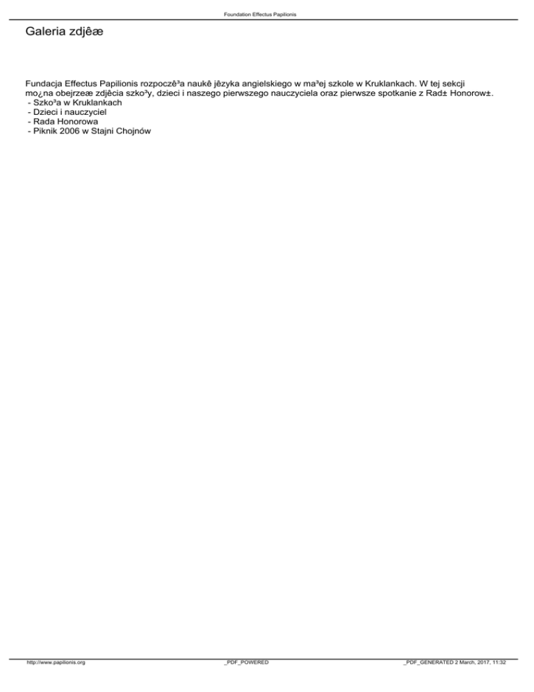 Foundation Effectus Papilionis Galeria zdjêæ Fundacja Effectus Papilionis rozpoczê³a naukê jêzyka angielskiego w ma³ej szkole w Kruklankach. W tej sekcji mo¿na obejrzeæ zdjêcia szko³y, dzieci i naszego pierwszego nauczyciela oraz pierwsze spotkanie z Rad± Honorow±. - Szko³a w Kruklankach - Dzieci i nauczyciel - Rada Honorowa - Piknik 2006 w Stajni Chojnów http://www.papilionis.org _PDF_POWERED _PDF_GENERATED 2 March, 2017, 11:32