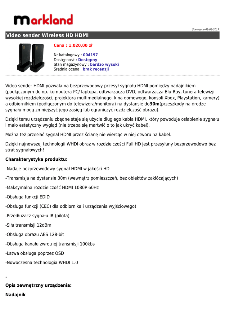 Utworzono 02-03-2017 Video sender Wireless HD HDMI Cena : 1.020,00 zł Nr katalogowy : 004197 Dostępność : Dostępny Stan magazynowy : bardzo wysoki Średnia ocena : brak recenzji Video sender HDMI pozwala na bezprzewodowy przesył sygnału HDMI pomiędzy nadajnikiem (podłączonym do np. komputera PC/ laptopa, odtwarzacza DVD, odtwarzacza Blu-Ray, tunera telewizji wysokiej rozdzielczości, projektora multimedialnego, kina domowego, konsoli Xbox, Playstation, kamery) a odbiornikiem (podłączonym do telewizora/monitora) na dystansie do30m(przeszkody na drodze sygnału mogą zmniejszyć jego zasięg lub ograniczyć rozdzielczość obrazu). Dzięki temu urządzeniu zbędne staje się użycie długiego kabla HDMI, który powoduje osłabienie sygnału i mało estetyczny wygląd (nie trzeba się martwić o to jak ukryć kabel). Można też przesłać sygnał HDMI przez ścianę nie wiercąc w niej otworu na kabel. Dzięki najnowszej technologii WHDI obraz w rozdzielczości Full HD jest przesyłany bezprzewodowo bez strat sygnałowych! Charakterystyka produktu: -Nadaje bezprzewodowy sygnał HDMI w jakości HD -Transmisja na dystansie 30m (wewnątrz pomieszczeń, bez obiektów zakłócających) -Maksymalna rozdzielczość HDMI 1080P 60Hz -Obsługa funkcji EDID -Obsługa funkcji (CEC) dla odbiornika i urządzenia wyjściowego) -Przedłużacz sygnału IR (pilota) -Siła transmisji 12dBm -Obsługa obrazu AES 128-bit -Obsługa kanału zwrotnej transmisji 100kbs -Łatwa obsługa poprzez OSD -Nowoczesna technologia WHDI 1.0 . Opis zewnętrzny urządzenia: Nadajnik 1.Wejścia zasilania DC (do zasilacza 5V2A z zestawu) 2.Wejście HDMI 3.Nadajnik sygnału IR (z pilota) 4.Dioda statusu połączenia bezprzewodowego 5.Dioda statusu video 6.Przycisk kodujący Odbiornik 1.Wejścia zasilania DC (do zasilacza 5V2A z zestawu) 2.Wejście HDMI 3.Dioda statusu połączenia bezprzewodowego 4.Dioda statusu video 5.Odbiornik sygnału IR (z pilota) 6.Przycisk kodujący 7. Gniazdo miniUSB (do aktualizacji oprogramowania, w razie nowszej wersji) . Opakowanie zawiera: -Nadajnik sygnału HDMI -Odbiornik sygnału HDMI -Podstawka do postawienia urządzenia x2 -Przedłużacz sygnału IR (z Pilota) -Kabel HDMI -Zasilacz x2 . . Dane techniczne: