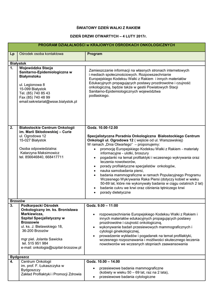 ŚWIATOWY DZIEŃ WALKI Z RAKIEM DZIEŃ DRZWI OTWARTYCH – 4 LUTY 2017r. PROGRAM DZIAŁALNOŚCI w KRAJOWYCH OŚRODKACH ONKOLOGICZNYCH Lp Ośrodek osoba kontaktowa Białystok 1. Wojewódzka Stacja Sanitarno-Epidemiologiczna w Białymstoku ul. Legionowa 8 15-099 Białystok Tel. (85) 740 85 43 Fax (85) 740 48 99 email:[email protected] 2. Białostockie Centrum Onkologii im. Marii Skłodowskiej – Curie ul. Ogrodowa 12 15-027 Białystok Osoba odpowiedzialna: Katarzyna Maksimowicz tel. 856646840, 668417711 Brzozów 3. Podkarpacki Ośrodek Onkologiczny im. ks. Bronisława Markiewicza, Szpital Specjalistyczny w Brzozowie ul. ks. J. Bielawskiego 18, 36-200 Brzozów Program Zamieszczanie informacji na własnych stronach internetowych i mediach społecznościowych. Rozpowszechnianie Europejskiego Kodeksu Walki z Rakiem i innych materiałów Edukacyjnych propagujących postawy prozdrowotne i czujność onkologiczną, będzie także w gestii Powiatowych Stacji Sanitarno-Epidemiologicznych województwa podlaskiego. Godz. 10.00-12.00 Specjalistyczna Poradnia Onkologiczna Białostockiego Centrum Onkologii ul. Ogrodowa 12 ( wejście od ul. Warszawskiej) W ramach „Dnia Otwartego” – proponujemy: promocję Europejskiego Kodeksu Walki z Rakiem - materiały informacyjne - ulotki, broszury pogadanki na temat profilaktyki i wczesnego wykrywania oraz leczenia nowotworów, porady profilaktyczne specjalistów onkologów, nauka samobadania piersi, badania mammograficzne w ramach Populacyjnego Programu Wczesnego Wykrywania Raka Piersi (dotyczy kobiet w wieku 50-69 lat, które nie wykonywały badania w ciągu ostatnich 2 lat) badanie cukru we krwi oraz ciśnienia tętniczego krwi porady dietetyczne Godz. 9.00 – 11:00 mgr piel. Jolanta Sawicka tel. 515 951 984 e-mail: [email protected] Bydgoszcz 4. Centrum Onkologii im. prof. F. Łukaszczyka w Bydgoszczy Zakład Profilaktyki i Promocji Zdrowia rozpowszechnianie Europejskiego Kodeksu Walki z Rakiem i innych materiałów edukacyjnych propagujących postawy prozdrowotne i czujność onkologiczną, wykonywanie badań przesiewowych mammograficznych i cytologii ginekologicznej, prowadzenie wykładów i pogadanek na temat profilaktyki, wczesnego rozpoznawania i możliwości skutecznego leczenia nowotworów we wczesnych stopniach zaawansowania Godz. 10.00 – 14.00 przesiewowe badania mammograficzne (kobiety w wieku 50 – 69 lat, raz na 2 lata), przesiewowe badania cytologiczne Osoba odpowiedzialna za akcję: Dr n. med. Tomasz Mierzwa Tel. 52 374 32 38 e-mail: [email protected] Bytom 5. Państwowy Powiatowy Inspektor Sanitarny w Bytomiu 41 – 902 Bytom, ul. Moniuszki 25 tel. 32 397 – 66 – 66 fax. 32 397– 66 – 00 e – mail: [email protected] http://www.psse.bytom.pl Osoba odpowiedzialna za przeprowadzenie akcji z ramienia Państwowego Powiatowego Inspektora Sanitarnego w Bytomiu Joanna Dyląg-Osemka, Kierownik Sekcji Oświaty Zdrowotnej PSSE Bytom [email protected] telefon 32 397 66 23. Gdańsk 6. Klinika Onkologii I Radioterapii, Uniwersyteckie Centrum Kliniczne Gdańskiego Uniwersytetu Medycznego Ul. Dębinki 7 80-211 Gdańsk (kobiety w wieku 25 – 59 lat, raz na 3 lata) - dr Józef Dziedzic, pomiar poziomu glukozy w surowicy krwi i ciśnienia tętniczego krwi – Stowarzyszenie Diabetyków w Świeciu, ewentualny pomiar masy i składników ciała (współpraca z pozyskanym podmiotem zewnętrznym ), warsztaty edukacyjne pt.” Pierwsza wizyta u ginekologa” – dla młodzieży szkół ponadgimnazjalnych – dr Józef Dziedzic, dermatoskopowa ocena znamion skórnych – dr Tomasz Mierzwa. Godz. 10.30 -14.30 Akcja profilaktyczna przeprowadzona będzie przez pracowników Oświaty Zdrowotnej PSSE na terenie Wojewódzkiego Szpitala Specjalistycznego nr 4 aleja Legionów 10, 41-902 Bytom. pracownicy zorganizują i obsługiwać będą stanowisko z materiałami informacyjno-edukacyjnymi dot. profilaktyki nowotworów, zainteresowane osoby będą miały możliwość wykonania bezpłatnych pomiarów stężenie tlenku węgla w wydychanym powietrzu Klinika Onkologii i Radioterapii UCK Ul. Dębinki 7 80-211 Gdańsk Budynek nr 4, parter Sala wykładowa prof. T. Zielińskiego - Wykład – „Dieta a nowotwory” 11:00 – 11:30 - Wykład – „Czy można uniknąć raka?” 11:30 – 12:00 Poradnia Onkologiczna UCK Centrum Medycyny Inwazyjnej (CMI) Ul. Smoluchowskiego 17 80-952 Gdańsk Piętro 1, gabinet nr 1 - konsultacje onkologiczne 11:00 – 13:00 Klinika Onkologii i Radioterapii UCK Ul. Dębinki 7 80-211 Gdańsk Telefoniczne konsultacje 11:00-13:00 onkologiczne tel. 58 349 22 71 dietetyczne tel. 506 080 659 psychologiczne tel. 58 349 29 83 7. Wojewódzkie Centrum Onkologii w Gdańsku COPERNICUS Podmiot Leczniczy Sp. z o.o. Ul. Nowe Ogrody 1-6 80-803 Gdańsk Godz.9.00 - 13.00 budynek B” przy Al. Zwycięstwa 31/32 Rejestracja pod numerem telefonu: 58 / 732 48 61, 605 956 682 (od poniedziałku do piątku w godzinach od 8.00 do 18.30), Informacja o badaniach: tel.58/ 77 23 950 W celu rejestracji należy przygotować numer PESEL niezbędny do Za koordynację przebiegu spotkania odpowiada: Urszula Krajewska tel. 58 341 70 45, e-mail: [email protected] Katarzyna Brożek tel. 58 764 03 10, e-mail: [email protected] Nadzór merytoryczny: Dyrektor Medyczny WCO dr n. med. Monika Nowaczyk Gliwice 8. Centrum Onkologii- Instytut im. Marii Skłodowskiej Curie Oddział w Gliwicach Ul. Wybrzeże Armii Krajowej 15 44-101 Gliwice Alicja Dyla Tel. 662 230 272 e-mail: [email protected] kwalifikacji na badania. Bezpłatne badania profilaktyczne: mammografii (zapraszamy panie w wieku od 50 do 69 lat), cytologii (dla pań w wieku od 25 do 59 lat), Konsultacji lekarskich z dziedziny: chirurgii onkologicznej, dermatologii w tym badanie dermatoskopem , ginekologii, onkologii, urologii, Dodatkowo będzie możliwość skorzystania z: konsultacji fizjoterapeuty, nauki samobadania piersi, W programie: możliwość wykonania mammografii, bezpłatne konsultacje z psychologiem, konsultacje z le