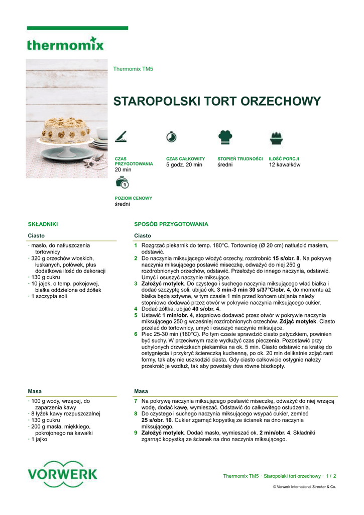 Thermomix TM5 STAROPOLSKI TORT ORZECHOWY CZAS PRZYGOTOWANIA 20 min CZAS CAŁKOWITY STOPIEŃ TRUDNOŚCI ILOŚĆ PORCJI 5 godz. 20 min średni 12 kawałków POZIOM CENOWY średni SKŁADNIKI SPOSÓB PRZYGOTOWANIA Ciasto Ciasto · masło, do natłuszczenia tortownicy · 320 g orzechów włoskich, łuskanych, połówek, plus dodatkowa ilość do dekoracji · 130 g cukru · 10 jajek, o temp. pokojowej, białka oddzielone od żółtek · 1 szczypta soli 1 Rozgrzać piekarnik do temp. 180°C. Tortownicę (Ø 20 cm) natłuścić masłem, odstawić. 2 Do naczynia miksującego włożyć orzechy, rozdrobnić 15 s/obr. 8. Na pokrywę naczynia miksującego postawić miseczkę, odważyć do niej 250 g rozdrobnionych orzechów, odstawić. Przełożyć do innego naczynia, odstawić. Umyć i osuszyć naczynie miksujące. 3 Założyć motylek. Do czystego i suchego naczynia miksującego wlać białka i dodać szczyptę soli, ubijać ok. 3 min-3 min 30 s/37°C/obr. 4, do momentu aż białka będą sztywne, w tym czasie 1 min przed końcem ubijania należy stopniowo dodawać przez otwór w pokrywie naczynia miksującego cukier. 4 Dodać żółtka, ubijać 40 s/obr. 4. 5 Ustawić 1 min/obr. 4, stopniowo dodawać przez otwór w pokrywie naczynia miksującego 250 g wcześniej rozdrobnionych orzechów. Zdjąć motylek. Ciasto przelać do tortownicy, umyć i osuszyć naczynie miksujące. 6 Piec 25-30 min (180°C). Po tym czasie sprawdzić ciasto patyczkiem, powinien być suchy. W przeciwnym razie wydłużyć czas pieczenia. Pozostawić przy uchylonych drzwiczkach piekarnika na ok. 5 min. Ciasto odstawić na kratkę do ostygnięcia i przykryć ściereczką kuchenną, po ok. 20 min delikatnie zdjąć rant formy, tak aby nie uszkodzić ciasta. Gdy ciasto całkowicie ostygnie należy przekroić je wzdłuż, tak aby powstały dwa równe biszkopty. Masa Masa · 100 g wody, wrzącej, do zaparzenia kawy · 8 łyżek kawy rozpuszczalnej · 130 g cukru · 200 g masła, miękkiego, pokrojonego na kawałki · 1 jajko 7 Na pokrywę naczynia miksującego postawić miseczkę, odważyć do niej wrzącą wodę, dodać kawę, wymieszać. Odstawić do całkowitego ostudzenia. 8 Do czystego i suchego naczynia miksującego wsypać cukier, zemleć 25 s/obr. 10. Cukier zgarnąć kopystką ze ścianek na dno naczynia miksującego. 9 Założyć motylek. Dodać masło, wymieszać ok. 2 min/obr. 4. Składniki zgarnąć kopystką ze ścianek na dno naczynia miksującego. Thermomix TM5 · Staropolski tort orzechowy · 1 / 2 © Vorwerk International Strecker & Co. 10 Na pokrywę naczynia miksującego postawić miseczkę, odważyć do niej 60 g wcześniej zaparzonej kawy, odstawić. Dodać jajko, wymieszać ok. 40 s/obr. 4, w tym czasie stopniowo dodawać przez otwór w pokrywie naczynia miksującego wcześniej odważoną kawę, mieszać aż do uzyskania gładkiej masy. 11 Biszkopty nasączyć pozostałą kawą za pomocą pędzelka do ciasta, odstawić. Pierwszy z biszkoptów posmarować ¾ masy, przykryć drugim biszkoptem, pozostałą masą posmarować wierzch i boki ciasta, a następnie posypać pozostałymi zmielonymi orzechami. Ciasto udekorować połówkami orzechów. Wstawić do lodówki na ok. 3 godz. Podawać schłodzone. PRZYDATNE PRZYBORY WSKAZÓWKA · blacha do pieczenia · Jeżeli ktoś nie lubi smaku kawy rozpuszczalnej może zamiast niej użyć kawy · okrągła forma do ciasta (Ø 20 cm) parzonej lub z ekspresu. · pędzelek do ciasta WARTOŚCI ODŻYWCZE NA 12 KAWAŁKÓW Wartość energetyczna CZĘŚCI THERMOMIXA kopystka, miarka 1918 kJ / 458 kcal Białko 10 g Węglowodany 27 g Tłuszcze 36 g Thermomix TM5 · Staropolski tort orzechowy · 2 / 2 © Vorwerk International Strecker & Co.