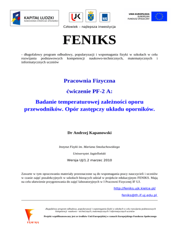 Człowiek – najlepsza inwestycja FENIKS - długofalowy program odbudowy, popularyzacji i wspomagania fizyki w szkołach w celu rozwijania podstawowych kompetencji naukowo-technicznych, matematycznych i informatycznych uczniów Pracownia Fizyczna ćwiczenie PF-2 A: Badanie temperaturowej zależności oporu przewodników. Opór zastępczy układu oporników. Dr Andrzej Kapanowski Instytut Fizyki im. Mariana Smoluchowskiego Uniwersytet Jagielloński Wersja UJ/1.2 marzec 2010 Zawarte w tym opracowaniu materiały przeznaczone są do wspomagania pracy nauczycieli i uczniów w czasie zajęć pozalekcyjnych w szkołach biorących udział w projekcie edukacyjnym FENIKS. Mają na celu ułatwienie przygotowania do zajęć laboratoryjnych w I Pracowni Fizycznej IF UJ. http://feniks.ujk.kielce.pl/ [email protected] - długofalowy program odbudowy, popularyzacji i wspomagania fizyki w szkołach w celu rozwijania podstawowych kompetencji naukowo - technicznych, matematycznych i informatycznych uczniów Projekt współfinansowany jest ze środków Unii Europejskiej w ramach Europejskiego Funduszu Społecznego PF-2 A I Pracownia Fizyczna IF UJ FENIKS PF-2 A Badanie temperaturowej zależności oporu przewodników. Opór zastępczy układu oporników. Cel ćwiczenia Celem ćwiczenia jest zbadanie temperaturowej zależności oporu kilku wybranych oporników oraz sprawdzenie reguł obliczania oporu zastępczego układu oporników połączonych równolegle i szeregowo. Zagadnienia do przygotowania • przepływ prądu elektrycznego w metalach; • napięcie elektryczne, natężenie prądu elektrycznego, opór elektryczny, jednostki tych wielkości; • obwody elektryczne; symbole elementów obwodu elektrycznego: przewód, opornik, źródło stałej SEM (źródło stałego napięcia), wyłącznik, amperomierz, woltomierz, schemat obwodu, umowny kierunek przepływu prądu elektrycznego; • woltomierz, amperomierz, omomierz; • pierwsze i drugie prawo Ohma; • pierwsze i drugie prawo Kirchhoffa; • opór zastępczy oporników połączonych szeregowo i równolegle; • zależność oporu przewodników od temperatury. Wprowadzenie Pierwsze prawo Ohma Prawo to mówi, że natężenie prądu stałego I płynącego przez opornik jest proporcjonalne do przyłożonego napięcia U (różnicy potencjałów pomiędzy końcami przewodnika), a współczynnikiem proporcjonalności jest odwrotność oporu R (jednostka Ω = V /A). Możemy to zapisać w postaci I= 1 U. R (1) Drugie prawo Ohma Opór danego przewodnika zależy od jego wymiarów geometrycznych, czyli od długości przewodnika l, pola powierzchni jego przekroju poprzecznego S Andrzej Kapanowski wersja UJ/1.2, marzec 2010 1 PF-2 A I Pracownia Fizyczna IF UJ FENIKS oraz własności fizycznych materiału z jakiego jest wykonany. Matematycznie przedstawia to następujące równanie l R=ρ , S (2) gdzie współczynnikiem proporcjonalności jest opór właściwy ρ, który jest stałą materiałową charakteryzującą dany materiał. Dla metali w temperaturze zera stopni Celsjusza ρ jest rzędu 10−8 Ωm. Pierwsze prawo Kirchhoffa Pierwsze prawo Kirchhoffa jest konsekwencją zasady zachowania ładunku elektrycznego. Mówi ono, że algebraiczna suma natężeń prądów wpływających do węzła sieci elektrycznej i prądów z niego wypływających jest równa zeru. Prądy wpływające poprzedza się znakiem plus, a prądy wypływające znakiem minus. Drugie prawo Kirchhoffa Drugie prawo Kirchhoffa jest konsekwencją zasady zachowania energii. Zanim sformułujemy to prawo, musimy najpierw zdefiniować pojęcie oczka sieci elektrycznej i siły elektromotorycznej. Oczko sieci elektrycznej jest to zamknięta część obwodu elektrycznego (czasem cały obwód składa się z jednego oczka). Siła elektromotoryczna, oznaczana jako SEM, charakteryzuje źródło energii elektrycznej, np. baterii. Jednostką SEM jest wolt, a wartość jest równa napięciu panującemu między biegunami ogniwa otwartego, tzn. nie połączonego z żadnym odbiornikiem. Napięcie między biegunami rzeczywistego ogniwa pracującego, tj. włączonego do zamkniętego obwodu elektrycznego, jest mniejsze od SEM o wartość spadku napięcia na oporze wewnętrznym ogniwa. Drugie prawo Kirchhoffa mówi, że algebraiczna suma sił elektromotorycznych i spadków napięć występujących w oczku sieci jest równa zeru. Łączenie szeregowe oporników Jest to takie połączenie, w którym koniec pierwszego opornika połączony jest z początkiem następnego opornika w tzw. szereg oporowy (rys. 1). Zgodnie z pierwszym prawem Kirchhoffa, natężenie prądu płynącego przez każdy z oporników połączonych szeregowo jest takie samo i wynosi I. Na każdym oporniku następuje spadek napięcia, a więc napięcie elektryczne między Andrzej Kapanowski wersja UJ/1.2, marzec 2010 2 PF-2 A I Pracownia Fizyczna IF UJ I • - R1 • R2 FENIKS • Rysunek 1: Szeregowe połączenie dwóch oporników. końcami szeregu jest równe sumie spadków napięć na poszczególnych opornikach, co można zapisać: U = U1 + U2 . (3) Jeśli skorzystamy z pierwszego prawo Ohma (1), to wzór (3) przyjmie postać: IRs = IR1 + IR2 , (4) gdzie Rs jest oporem zastępczym układu. Dzieląc obie strony tego równania przez I, otrzymujemy: Rs = R1 + R2 . (5) W analogiczny sposób można pokazać, że opór szeregowego połączenia oporników jest równy sumie oporów poszczególnych oporników. Łączenie równoległe oporników Spadek napięcia na każdym z oporników jest taki sam i jest równy spadkowi napięcia U na oporze zastępczym Rr obwodu elektrycznego (rys. 2). Zgodnie z pierwszym prawem Kirchhoffa, suma natężeń prądów płynących przez poszczególne oporniki jest równa wartości natężenia prądu wpływającego do węzła, co można zapisać I = I1 + I2 . (6) Wykorzystując pierwsze prawo Ohma (1) możemy wzór (6) zapisać jako: U U U = + . Rr R1 R2 (7) Dzieląc we wzorze (7) obie strony przez U, otrzymujemy: 1 1 1 = + . 