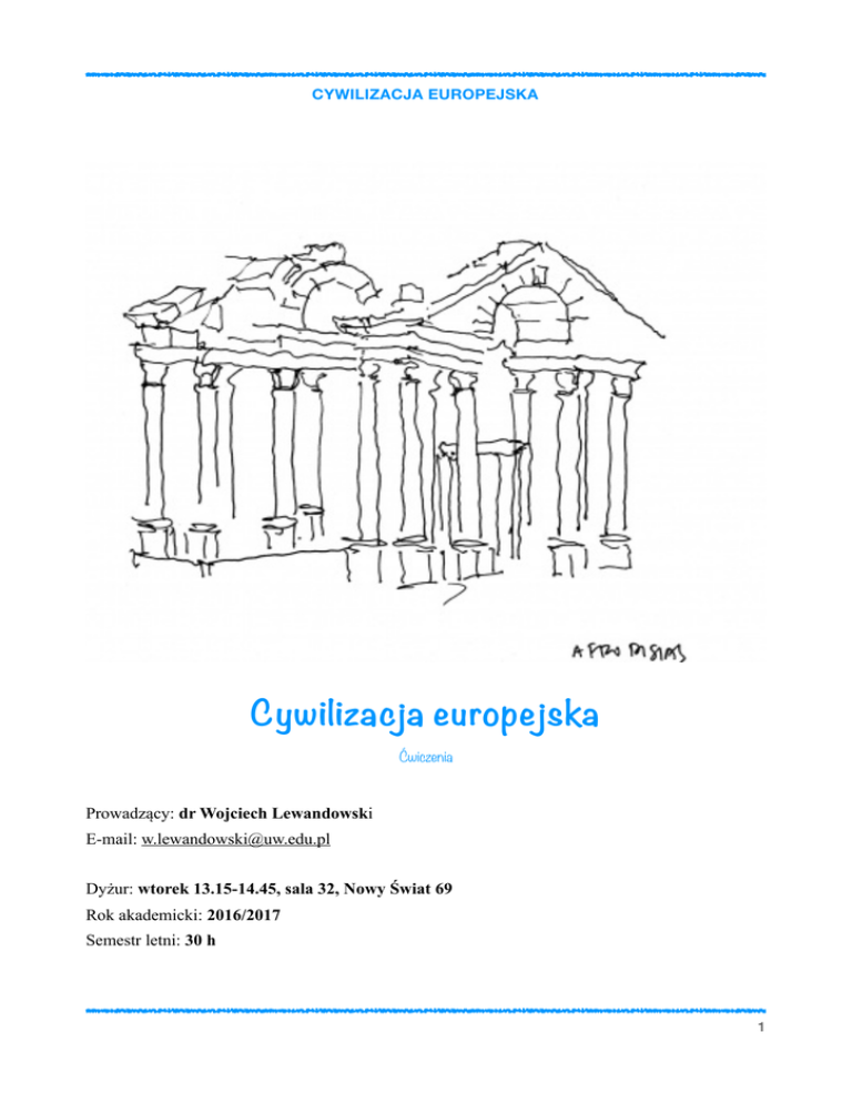 CYWILIZACJA EUROPEJSKA Cywilizacja europejska Ćwiczenia Prowadzący: dr Wojciech Lewandowski E-mail: [email protected] Dyżur: wtorek 13.15-14.45, sala 32, Nowy Świat 69 Rok akademicki: 2016/2017 Semestr letni: 30 h !1 CYWILIZACJA EUROPEJSKA TERMINY SPOTKAŃ Dni i godziny: środy, godz. 15.00-16.30 Miejsce: sala: 49 ECTS: 5 (wraz z wykładem) Forma zaliczenia: zal. ZASADY UZYSKANIA ZALICZENIA 1. Obecność (dopuszczalne są 2 nieobecności na zajęciach w semestrze; każda kolejna musi być zaliczona podczas dyżuru). 2. W celu uzyskania zaliczenia niezbędna jest ponadto wysoka i wartościowa merytorycznie aktywność podczas zajęć. CELE Celem przedmiotu jest prezentacja zjawisk kształtujących cywilizację europejską (zachodnią?).Dyskusjipoddanezostanątakieproblemyjakkorzeniecywilizacjieuropejskiej, jej ewolucja oraz jej współczesna kondycja. Ponadto przedmiotem reCleksji będzie problematyka tożsamości europejskiej, siły oddziaływania europejskie soft power oraz przyszłość europejskiego projektu integracyjnego w obliczu wzrostu tendencji nacjonalistycznych. !2 CYWILIZACJA EUROPEJSKA PROGRAM ZAJĘĆ 1. ZAJĘCIA WPROWADZAJĄCE 2. KULTURA I CYWILIZACJA – WPROWADZENIE Zagadnienia: 1. Podstawowe pojęcia nauk o kulturze. 2. Kultura a cywilizacja 3. Kultura popularna a kultura masowa. 4. Społeczna rola kultury. 5. Cywilizacja europejska - cechy szczególne. Literatura obowiązkowa: Braudel Fernand, Gramatyka cywilizacji, Oficyna Naukowa, Warszawa 2006, s. 37-69. Gołembski Franciszek, Cywilizacja europejska, Wydawnictwo Poltext, Warszawa 2012, s. 7-12, 25-32. Literatura uzupełniająca: Baker Charles, Studia kulturowe. Teoria i praktyka, Wydawnictwo Uniwersytetu Jagiellońskiego, Kraków 2005, r. I i II. Fiske John, Zrozumieć kulturę popularną, Wydawnictwo Uniwersytetu Jagiellońskiego, Kraków 2010. Krajewski Marek, Kultury kultury popularnej, Wydawnictwo Naukowe UAM, Poznań 2003. 3. TEORIE CYWILIZACJI Zagadnienia: 1. Teoretyczne ramy rozważań nad naturą cywilizacji. 2. Wybrane koncepcje cywilizacji. 3. Koncepcja współwystępowania cywilizacji Benjamina R. Barbera (Dżihad kontra McŚwiat). 4. Zderzenie cywilizacji? - koncepcja cywilizacji Samuela P. Huntingtona. Literatura podstawowa: Gołembski Franciszek, Cywilizacja europejska, Wydawnictwo Poltext, Warszawa 2012, s. 13-25. Literatura uzupełniająca: Barber Benjamin R., Dżihad kontra McŚwiat, Warszawskie Wydawnictwo Literackie MUZA SA, Warszawa 2005. Huntington, Samuel P., Zderzenie cywilizacji i nowy kształt ładu światowego, Warszawskie Wydawnictwo Literackie MUZA SA, Warszawa 2006. Kieniewicz Jan, Wprowadzenie do historii cywilizacji Wschodu i Zachodu, Wydawnictwo Akademickie Dialog, Warszawa 2003, s. 29-35. !3 CYWILIZACJA EUROPEJSKA 4. CYWILIZACJA A GLOBALIZACJA Zagadnienia: 1. Wymiary procesów globalizacji. 2. Globalizacja wzorców kulturowych - ku hegemonizacji dyskursu kulturowego. 3. Globalizacja a konflikt kulturowy. 4. Bezpieczeństwo kulturowe (wymiary i aspekty oraz uwarunkowania i zagrożenia). 5. Typy adaptacji do odmiennych wzorców kulturowych i cywilizacyjnych. Literatura obowiązkowa: Olchowski Jakub, Kultura i zjawiska dezintegracji i konfliktu, w: Międzynarodowe stosunku kulturalne. Podręcznik akademicki, red. Agata W. Ziętek, Wydawnictwo Poltext, Warszawa 2010, s. 101-128. Wnuk-Lipiński Edmund, Europa wobec globalizacji, w: Cywilizacja europejska. Różnorodność i podziały, red. Maciej Koźmiński, Universitas, Kraków 2014, s. 501-512. Ziętek Agata W., Globalizacja a kultura, w: Międzynarodowe stosunku kulturalne. Podręcznik akademicki, red. Agata W. Ziętek, Wydawnictwo Poltext, Warszawa 2010, s. 84-100. Literatura uzupełniająca: Bauman Zygmunt, Globalizacja i co z tego dla ludzi wynika, Państwowy Instytut Wydawniczy, Warszawa 2006. Oblicza procesów globalizacji, red. Marek Pietraś, Wydawnictwa Uniwersytetu Marii CurieSkłodowskiej, Lublin 2002. 5. EUROPA I JEJ GRANICE Zagadnienia: 1. Europa - wspólnota geograficzna czy kulturowo-cywilizacyjne. 2. Definiowane granic cywilizacji europejskiej. 3. Pogranicza i peryferie Europy - zagrożenie czy inspiracja. 4. Europa jedno- czy wielokulturowa? Literatura obowiązkowa: Koźmiński Maciej, Szkice do wykładu o granicach Europy i granicach europejskich, w: Cywilizacja europejska. Wykłady i eseje, red. Maciej Koźmiński, Wydawnictwo Instytutu Historii PAN, Warszawa 2005, s. 431-464. Krawczyk Rafał, Podstawy cywilizacji europejskiej, Wyższa Szkoła Handlu i Prawa im. Ryszarda Łazarskiego, Warszawa 2006, s. 19-66. Literatura uzupełniająca: Kieniewicz Jan, Pogranicza i peryferie. O granicach cywilizacji europejskiej, w: Cywilizacja europejska. Różnorodność i podziały, red. Maciej Koźmiński, Universitas, Kraków 2014, s. 81-96. Savidan Patrick, Wielokulturowość, Oficyna Naukowa, Warszawa 2012. !4 CYWILIZACJA EUROPEJSKA Śliz Anna, Szczepański Marek M., Wielokulturowość: perspektywa konfliktu czy szansa koegzystencji, w: Wielokulturowość: konflikt czy koegzystencja?, red. Anna Śliz, Marek S. Szczepański, Wydawnictwo IFiS PAN, Warszawa 2011, s. 13-47. 6. ANTYCZNE KORZENIE CYWILIZACJI EUROPEJSKIEJ Zagadnienia: 1. Oblicza cywilizacji klasycznej - grecka filozofia, organizacja polityczna, literatura i sztuka. 2. Ekspansja kultury greckiej w okresie hellenistycznym. 3. Rzymskie fundamenty cywilizacji europejskiej. 4. Przemiany cywilizacji europejskiej w okresie wczesnego chrześcijaństwa. 5. Dziedzictwo starożytności we współczesnej cywilizacji europejskiej. Literatura podstawowa: Gołembski Franciszek, Cywilizacja europejska, Wydawnictwo Poltext, Warszawa 2012, s. 33-67. Mazurkiewicz Piotr, Chrześcijańskie korzenie Europy, w: Cywilizacja europejska. Wykłady i eseje, red. Maciej Koźmiński, Wydawnictwo Instytutu Historii PAN, Warszawa 2005, s. 43-64. Literatura uzupełniająca: Wipszycka Ewa, Miejsce dorobku antyku w dziedzictwie kulturowym cywilizacji europejskiej, w: Cywilizacja europejska. Wykład