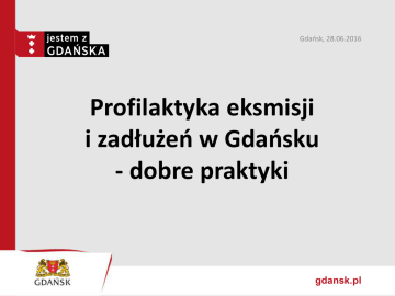 Gdańsk, 28.06.2016 Profilaktyka eksmisji i zadłużeń w Gdańsku - dobre praktyki gdansk.pl PROGRAM OSŁONOWY - badanie lokatorów w mieszkaniach komunalnych PROGRAM OSŁONOWY - badanie lokatorów w mieszkaniach komunalnych 1. Cel: zwiększenie poczucia bezpieczeństwa osób i rodzin, utrzymania w miejscu zamieszkania, wypracowanie nawyku regulowania należności mieszkaniowych, wzrost zainteresowania zamianą mieszkań, a także zwiększenie płynności finansowej administratorów zasobu komunalnego. 2. Realizatorzy: Miejski Ośrodek Pomocy Rodzinie w Gdańsku, Wydział Gospodarki Komunalnej UM, Gdański Zarząd Nieruchomości Komunalnych, Powiatowy Urząd Pracy i organizacje pozarządowe uczestniczące w realizacji zatrudnienia wspieranego 3. Okres trwania grudzień 2011 r. - nadal 4. Adresaci: osoby i rodziny, które są lub mogą być zagrożone utratą mieszkania w związku z powstaniem zaległości czynszowych 5. Wdrożenie Programu poprzedziło badanie socjologicznie, którym objętych zostało ok. 1500 najemców zasobu mieszkaniowego Miasta. Badanie miało na celu diagnozę potrzeb najemców, określenie przyczyn trudności w bieżącym regulowaniu należności, a w konsekwencji właściwe ukierunkowanie form pomocy. PROGRAM OSŁONOWY - zasady i formy pomocy PROGRAM OSŁONOWY - zasady i formy pomocy podstawowym warunkiem uczestniczenia jest zawarcie kontraktu, określającego sposób współdziałania między osobą/rodziną, a instytucjami realizującymi program bezpłatny dostęp do poradnictwa prawnego i psychologicznego wsparcie asystenta rodziny zatrudnienie wspomagane, które pozwoli umożliwić spłatę zaległego czynszu, realizowane w formie: • prac społecznie – użytecznych, • świadczenia prac na rzecz Miasta, z którego dochód będzie przekazywany na pokrycie zaległości czynszowych (np. odśnieżanie, prace porządkowe, remontowe itp.), • robót publicznych oraz prac interwencyjnych, • prac w ramach spółdzielni socjalnej, w tym osiedlowych spółdzielni socjalnych, dla których inkubatorem będzie Gdańska Spółdzielnia Socjalna. Zaplanowano również pomoc finansową i oddłużeniowa (np. umorzenie części zaległości, rozłożenie spłaty zaległości na raty, umorzenie odsetek). PRZYKŁADY DZIAŁAŃ W RAMACH PROGRAMU PRZYKŁADY DZIAŁAŃ W RAMACH PROGRAMU (1) Odpracowywanie długów Zadłużeni mieszkańcy mają możliwość odpracowania długu. Do umowy najmu sporządza się aneks, który mówi, że zapłata czynszu może mieć także formę świadczenia rzeczowego (zgodnie z art. 453 i 659 § 2 kodeksu cywilnego). Rodzaj, rozmiar i wartość czynności świadczonych przez dłużnika są określane w załączniku do tego aneksu. Później miasto podpisuje z dłużnikiem porozumienie. W związku z odpracowywaniem zaległości czynszowych nie powstaje przychód podlegający opodatkowaniu, a co za tym idzie, płatnik nie ma obowiązku poboru zaliczek na PIT. Można odpracowywać nie tylko własne długi, ale także długi członków rodziny. Urzędnicy zatrudniają do prac porządkowych, remontowych, a także prostych prac biurowych. Stawka spłaty zadłużenia wynosiła początkowo 10 zł, potem 11 zł za godzinę, a w 2015 r. została podniesiona do 12 zł za godzinę. Dłużnicy w przeciągu siedmiu lat odpracowali do 2015 r. w sumie 6,2 mln zł zadłużenia. PRZYKŁADY DZIAŁAŃ W RAMACH PROGRAMU (2) Zamiana Mieszkań Wielopłaszczyznowym systemem zamiany mieszkań zajmuje się Biuro Zamiany Mieszkań w ramach struktury GZNK. Celem prowadzenia Biura jest likwidacja dysproporcji pomiędzy powierzchnią lokali mieszkalnych zajmowanych przez lokatorów zasobów komunalnych, ilością osób w nich zamieszkujących a dochodami ich gospodarstw domowych i możliwościami bieżącego regulowania opłat, związanych z najmem lokalu (czynsz, świadczenia). A także - poprawa warunków mieszkaniowych najemców zasobów komunalnych, zmniejszenie liczby dłużników i liczby osób oczekujących na lokale socjalne. Biuro prowadzi również stworzony bank danych o lokalach mieszkalnych, który umożliwia przy dobrowolnej współpracy z innymi podmiotami zajmującymi się mieszkalnictwem (TBS, Banki, Spółdzielnie Mieszkaniowe, deweloperzy, wspólnoty mieszkaniowe) na gromadzenie i analizę informacji m.in. o możliwości zamiany mieszkania w ramach systemu ze wszystkimi podmiotami biorącymi w nim udział na terenie Miasta Gdańska. Począwszy od stycznia 2005 r. otrzymano około 5000 ofert. PROGRAM BEZPIECZEŃSTWA EKONOMICZNEGO PROGRAM BEZPIECZEŃSTWA EKONOMICZNEGO 1. Program jest w fazie tworzenia. Jego celem będzie zwrócenie uwagi mieszkańców na rosnący problem oszustw i nadużyć finansowych oraz promowanie zachowania bezpieczeństwa i zwiększonej czujności podczas korzystania z różnorodnych usług finansowych, zawierania wszelkich umów, czerpania z dostępnej pomocy czy informacji prawnej. 2. Oszustwa dotykają najczęściej seniorów. Oprócz stosowania tzw. metody na wnuczka coraz częściej zdarza się także, że osoby starsze dają się namówić na wzięcie szybkiej pożyczki pod zastaw mieszkania, o wyjątkowo wysokim oprocentowaniu, której nie są później w stanie spłacić, czego skutkiem jest utrata mieszkań. Z kolei problem zadłużenia dotyka najczęściej osoby zagrożone wykluczeniem społecznym i ubóstwem. Ważnym aspektem nowego programu ma być więc prewencja, w tym edukacja ekonomiczna. 3. Program ma połączyć siły i wiedzę przedstawicieli różnych instytucji, by wypracować skuteczny system wsparcia, w tym m.in. Narodowego Banku Polskiego, Powiatowego Urzędu Pracy, Miejskiego Rzecznika Konsumentów, Biura Rzecznika Praw Obywatelskich, Izby Komorniczej, Windykatorów, Izby Adwokackiej, spółdzielni mieszkaniowych, UOKiK, Urzędu Komunikacji Elektronicznej, MOPR, GZNK i organizacji pozarządowych. Wszystkich uczestników podzielono na trzy grupy tematyczne: do spraw edukacji ekonomicznej, do spraw przestępstw i