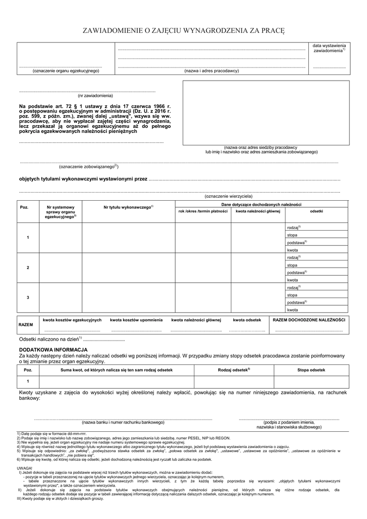 Załączniki do rozporządzenia Ministra Finansów z dnia 22 sierpnia 2016 r. (poz.) Załącznik nr 1 ZAWIADOMIENIE O ZAJĘCIU WYNAGRODZENIA ZA PRACĘ ZAWIADOMIENIE O ZAJĘCIU WYNAGRODZENIA ZA PRACĘ data wystawienia zawiadomienia1) ............................................................................................................................................................................ ............................................................................................................................................................................ ............................................................................ (oznaczenie organu egzekucyjnego) ............................................................................................................................................................................ (nazwa i adres pracodawcy) .............................. ............................................................................................................................. (nr zawiadomienia) Na podstawie art. 72 § 1 ustawy z dnia 17 czerwca 1966 r. o postępowaniu egzekucyjnym w administracji (Dz. U. z 2016 r. poz. 599, z późn. zm.), zwanej dalej „ustawą", wzywa się ww. pracodawcę, aby nie wypłacał zajętej części wynagrodzenia, lecz przekazał ją organowi egzekucyjnemu aż do pełnego pokrycia egzekwowanych należności pieniężnych ........................................................................................................ (nazwa oraz adres siedziby pracodawcy lub imię i nazwisko oraz adres zamieszkania zobowiązanego) ...................................................................................................................................................................................................................................................................... (oznaczenie zobowiązanego2)) objętych tytułami wykonawczymi wystawionymi przez .......................................................................................................................................... ....................................................................................................................................................................................................................................... (oznaczenie wierzyciela) Poz. Nr systemowy sprawy organu egzekucyjnego3) Nr tytułu wykonawczego Dane dotyczące dochodzonych należności 4) rok /okres /termin płatności kwota należności głównej odsetki rodzaj5) stopa 1 podstawa6) kwota rodzaj5) stopa 2 podstawa6) kwota rodzaj5) stopa 3 podstawa6) kwota RAZEM kwota kosztów egzekucyjnych kwota kosztów upomnienia kwota należności głównej kwota odsetek RAZEM DOCHODZONE NALEŻNOŚCI ................................................... .............................................. ............................................... ..... .. .............................................................. 1) Odsetki naliczono na dzień ................................. DODATKOWA INFORMACJA Za każdy następny dzień należy naliczać odsetki wg poniższej informacji. W przypadku zmiany stopy odsetek pracodawca zostanie poinformowany o tej zmianie przez organ egzekucyjny. Poz. Suma kwot, od których nalicza się ten sam rodzaj odsetek Rodzaj odsetek5) Stopa odsetek 1 Kwoty uzyskane z zajęcia do wysokości wyżej określonej należy wpłacić, powołując się na numer niniejszego zawiadomienia, na rachunek bankowy: ............................................................................................................................................ (nazwa banku i numer rachunku bankowego) ............................................................................................ (podpis z podaniem imienia, nazwiska i stanowiska służbowego) 1) Datę podaje się w formacie dd-mm-rrrr. 2) Podaje się imię i nazwisko lub nazwę zobowiązanego, adres jego zamieszkania lub siedzibę, numer PESEL, NIP lub REGON. 3) Nie wypełnia się, jeżeli organ egzekucyjny nie nadaje numeru systemowego sprawie egzekucyjnej. 4) Wpisuje się również nazwę jednolitego tytułu wykonawczego albo zagranicznego tytułu wykonawczego, jeżeli był podstawą wystawienia zawiadomienia o zajęciu. 5) Wpisuje się odpowiednio: „za zwłokę", „podwyższona stawka odsetek za zwłokę”, „połowa odsetek za zwłokę", „ustawowe”, „ustawowe za opóźnienie”, „ustawowe za opóźnienie w transakcjach handlowych”, „nie pobiera się". 6) Wpisuje się kwotę, od której nalicza się odsetki, jeżeli dochodzoną należnością jest ryczałt lub zaliczka na podatek. UWAGA! I) Jeżeli dokonuje się zajęcia na podstawie więcej niż trzech tytułów wykonawczych, można w zawiadomieniu dodać: - pozycje w tabeli przeznaczonej na ujęcie tytułów wykonawczych jednego wierzyciela, oznaczając je kolejnym numerem, - tabele przeznaczone na ujęcie tytułów wykonawczych innych wierzycieli, z tym że każdą tabelę poprzedza się wyrazami: „objętych wystawionymi przez", a także oznaczeniem wierzyciela. II) Jeżeli dokonuje się zajęcia na podstawie tytułów wykonawczych obejmujących należności pieniężne, od których nalicza się różne każdego rodzaju odsetek dodaje się pozycje w tabeli zawierającej informację dotyczącą naliczania dalszych odsetek, oznaczając je kolejnym numerem. III) Kwoty podaje się w złotych i dziesiątkach groszy. tytułami wykonawczymi rodzaje odsetek, dla 1 Strona 2 WEZWANIE PRACODAWCY Wzywa się pracodawcę, aby w terminie 7 dni od dnia doręczenia zawiadomienia: 1. złożył za okres 3 miesięcy poprzedzających zajęcie, za każdy miesiąc oddzielnie, zestawienie otrzymanego w tym czasie wynagrodzenia zobowiązanego, z wyszczególnieniem wszystkich jego składników, 2. w przypadku zaistnienia przeszkód do wypłacenia wynagrodzenia za pracę organowi egzekucyjnemu, złożył oświadczenie o rodzaju ty